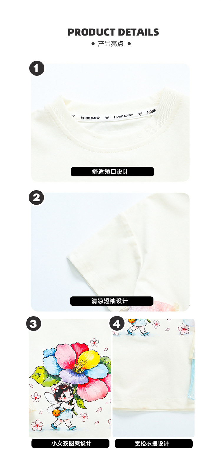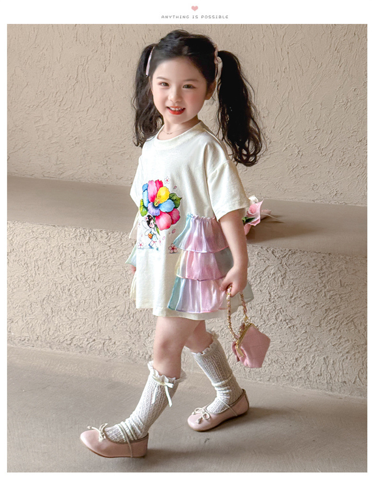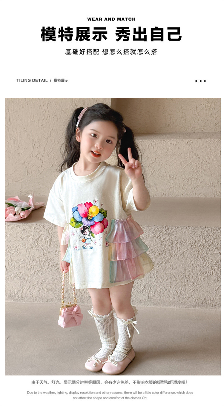 소녀 중간 길이 티셔츠 원피스 2025 년 여름 새로운 도착 어린 소녀 카드 아이 레이스 탑 아기의 반팔 원피스