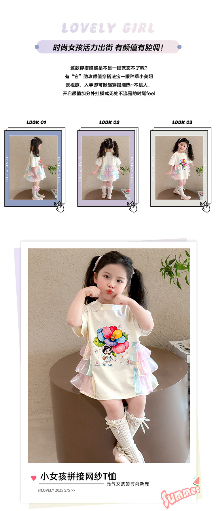 소녀 중간 길이 티셔츠 원피스 2025 년 여름 새로운 도착 어린 소녀 카드 아이 레이스 탑 아기의 반팔 원피스스토어 가기