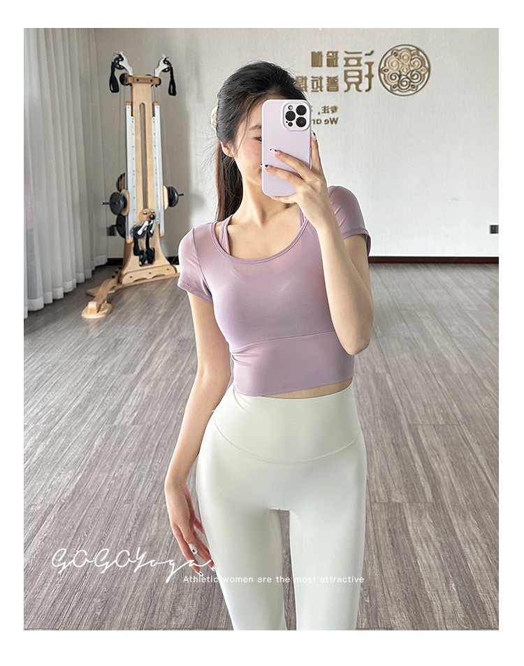 통기성이 뛰어나고 멋스럽고 가벼운 여성용 요가복 상의, 가슴 패드가 있는 반팔 티셔츠, 페이크 투피스 아름다운 등 스포츠 피트니스웨어스토어 가기