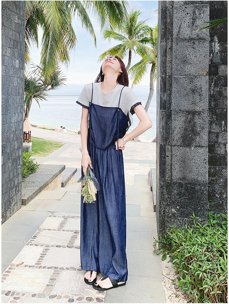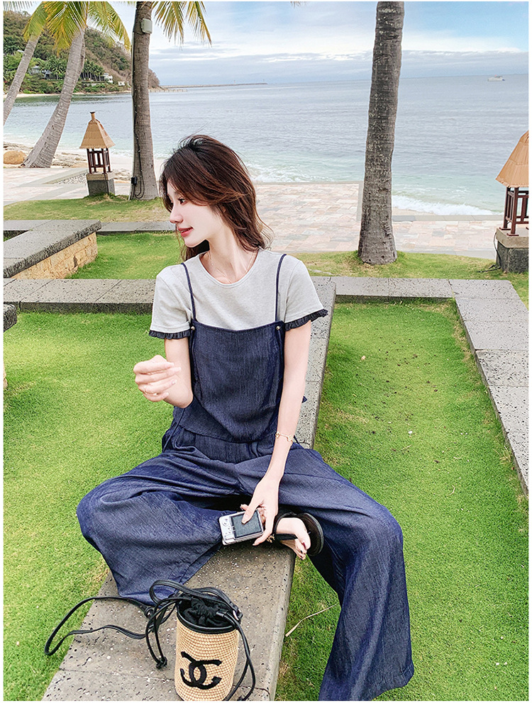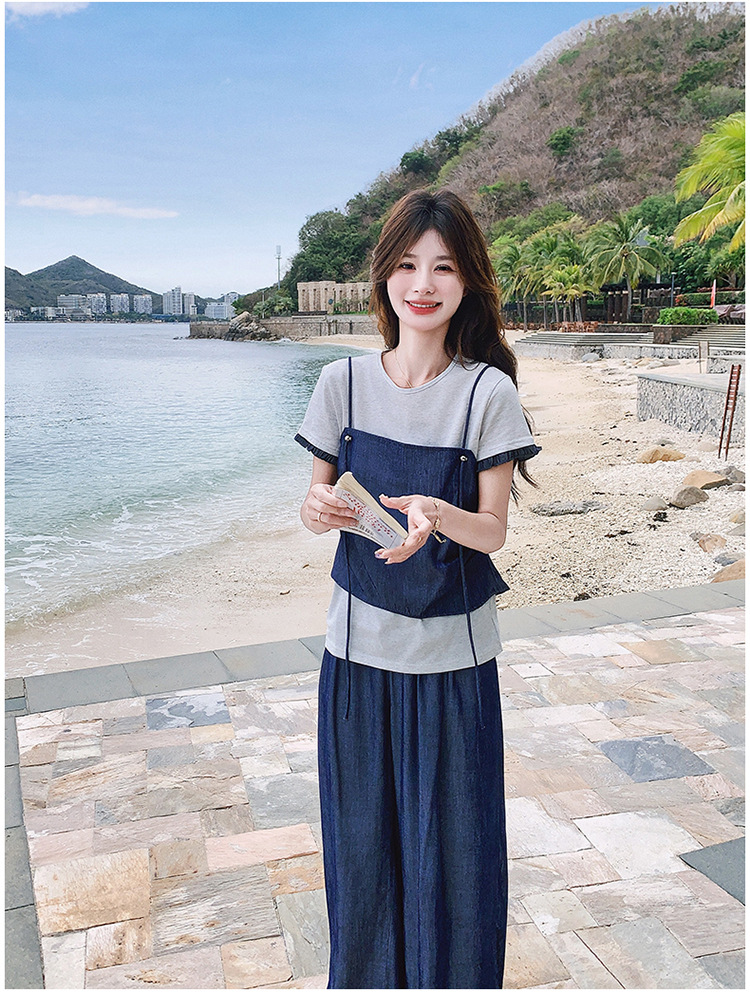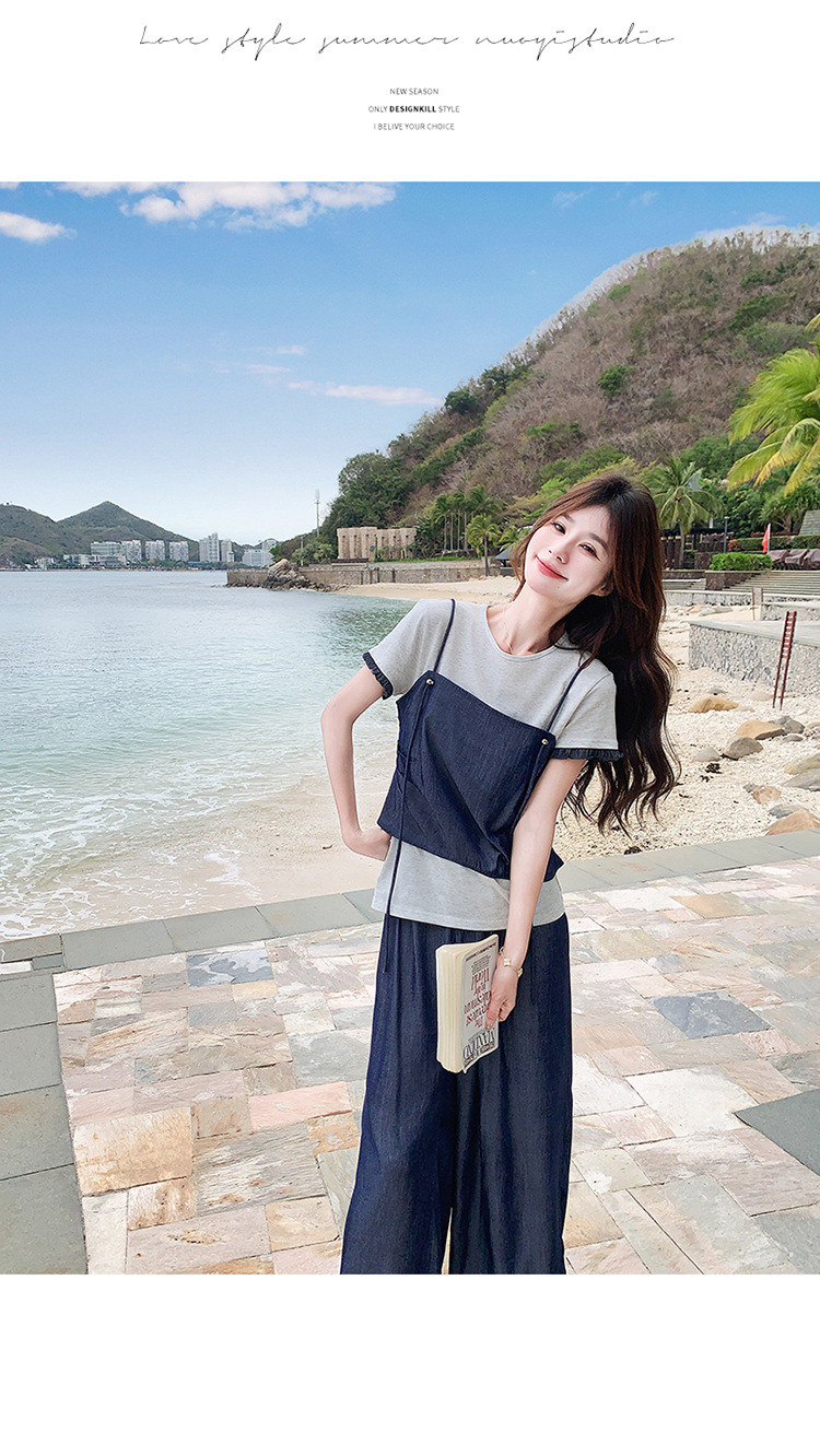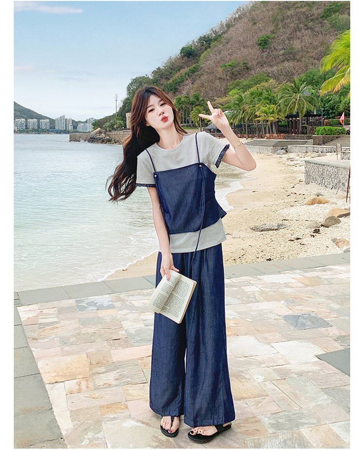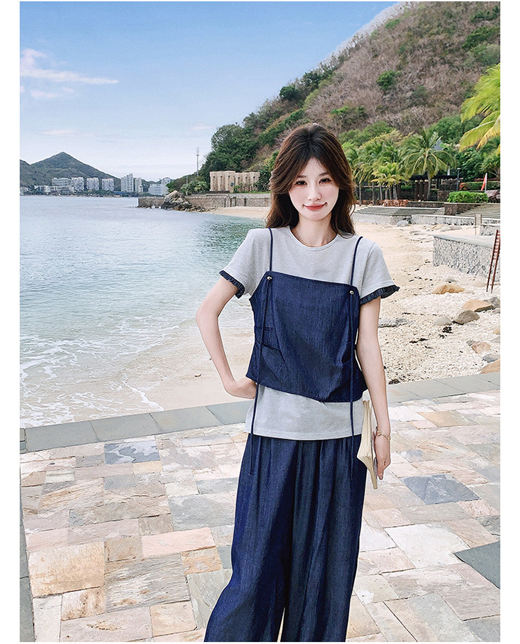 리얼 샷 휴식 경량 티셔츠 슬링 캐주얼 와이드 레그 바지 3 피스 세트 2025 여름 새로운 착용 세트