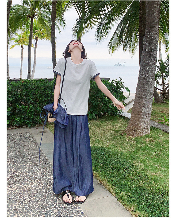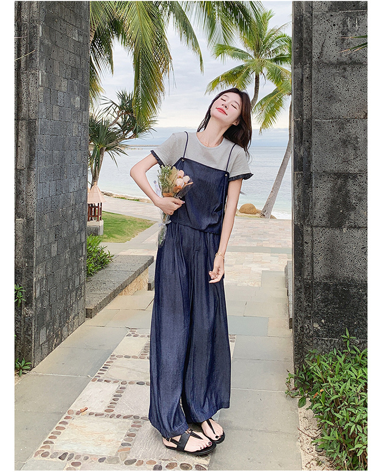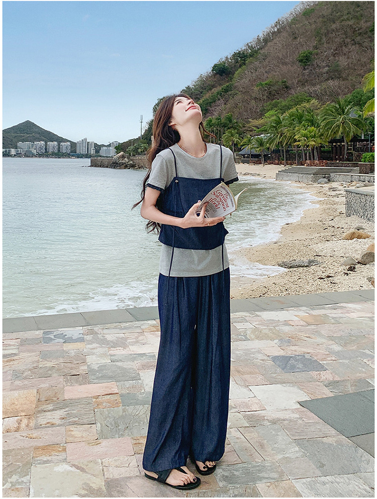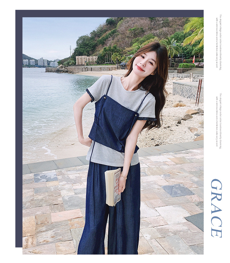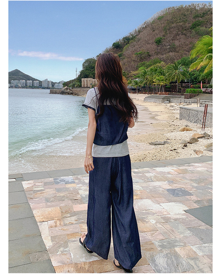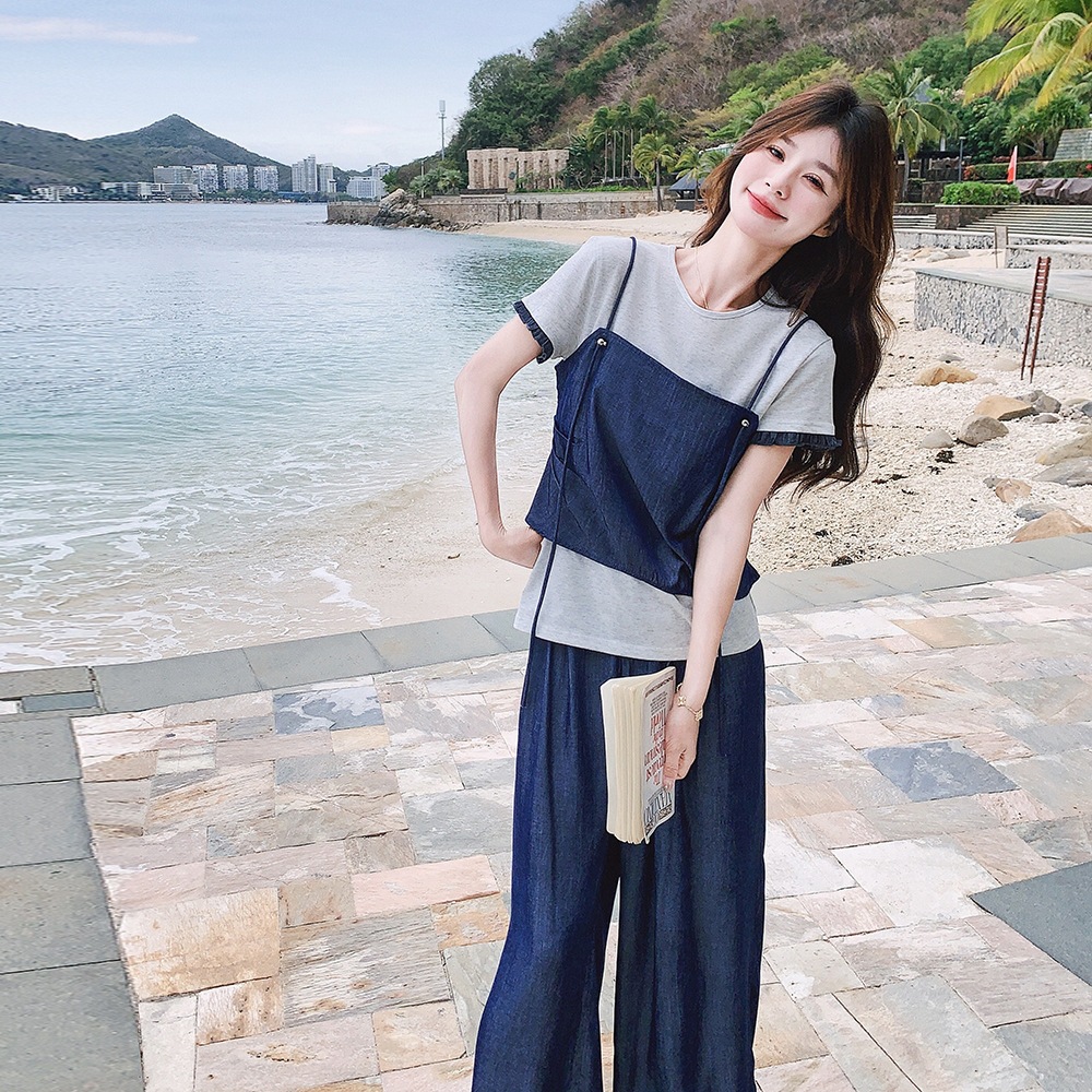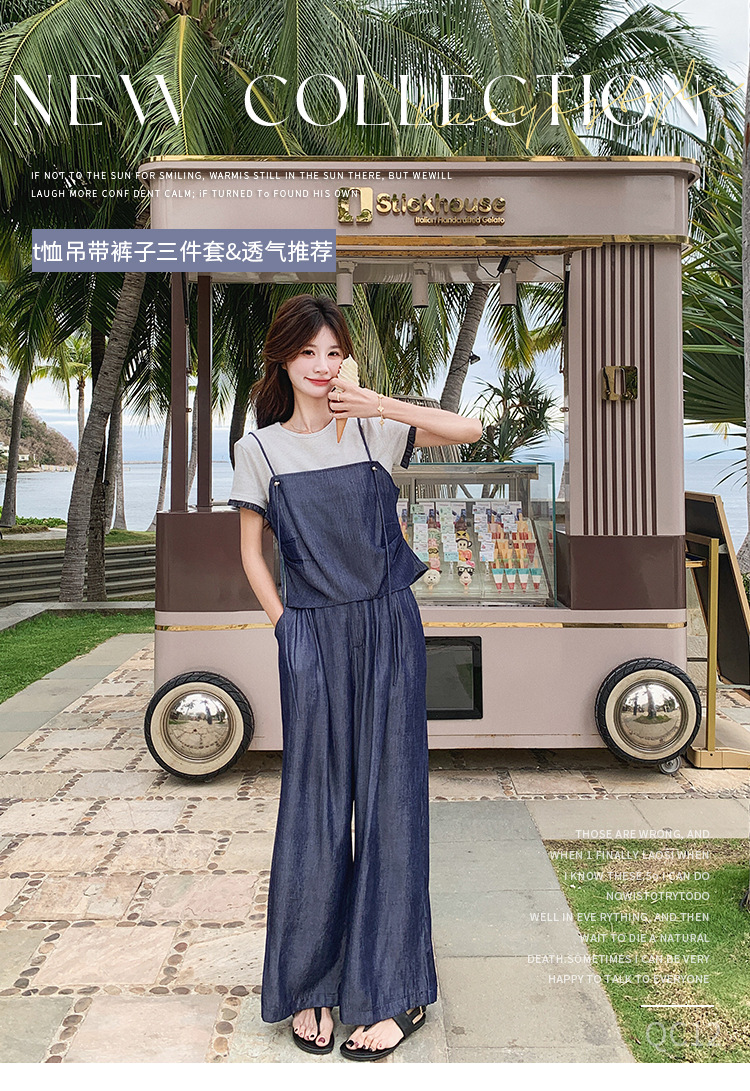 리얼 샷 휴식 경량 티셔츠 슬링 캐주얼 와이드 레그 바지 3 피스 세트 2025 여름 새로운 착용 세트스토어 가기