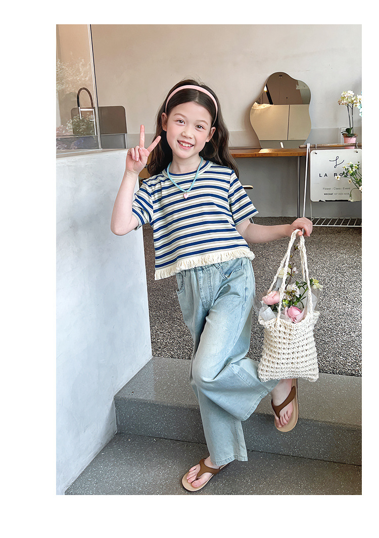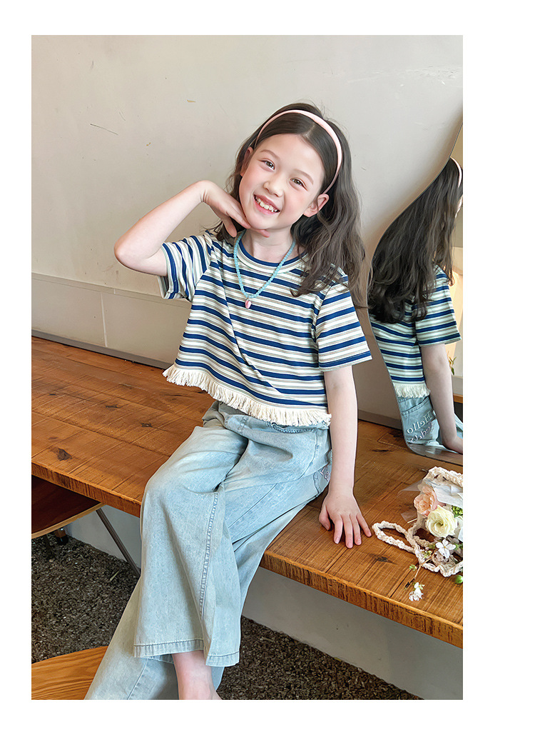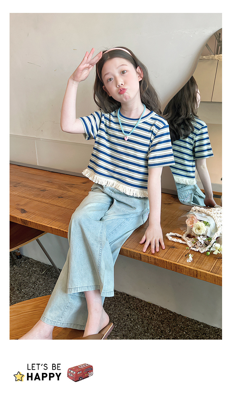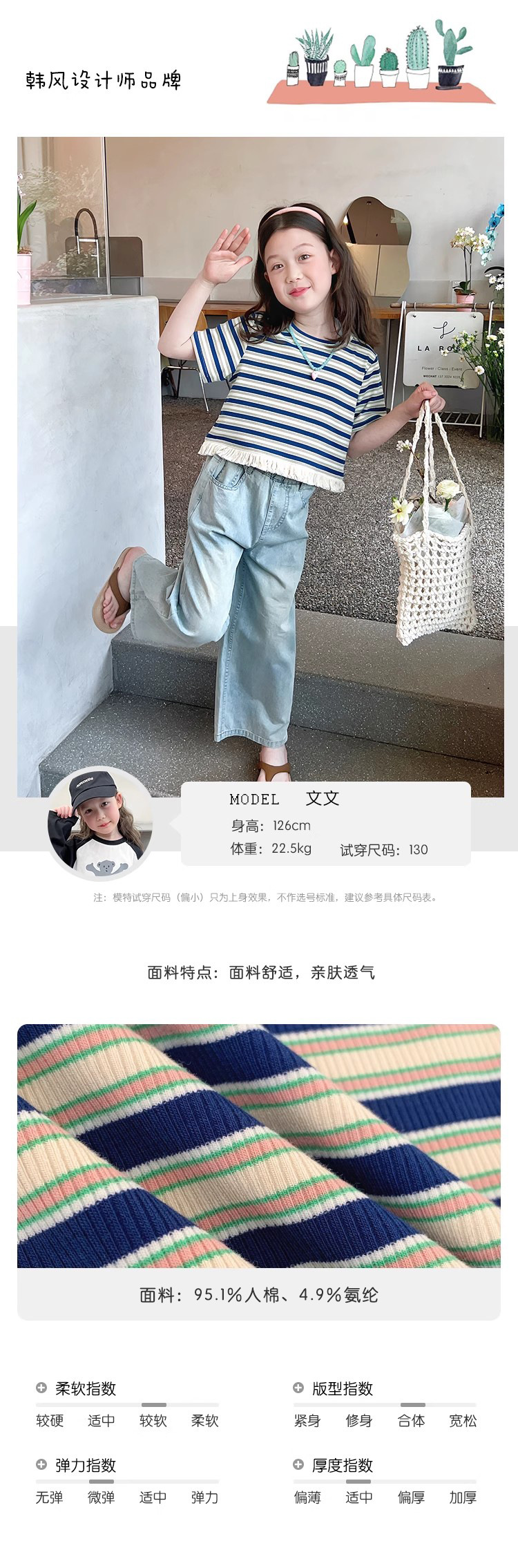소녀의 줄무늬 바느질 짧은 티셔츠 어린이 서양식 인터넷 인기있는 느슨한 반팔 탑 큰 어린이 2025 여름 새로운 스타일스토어 가기