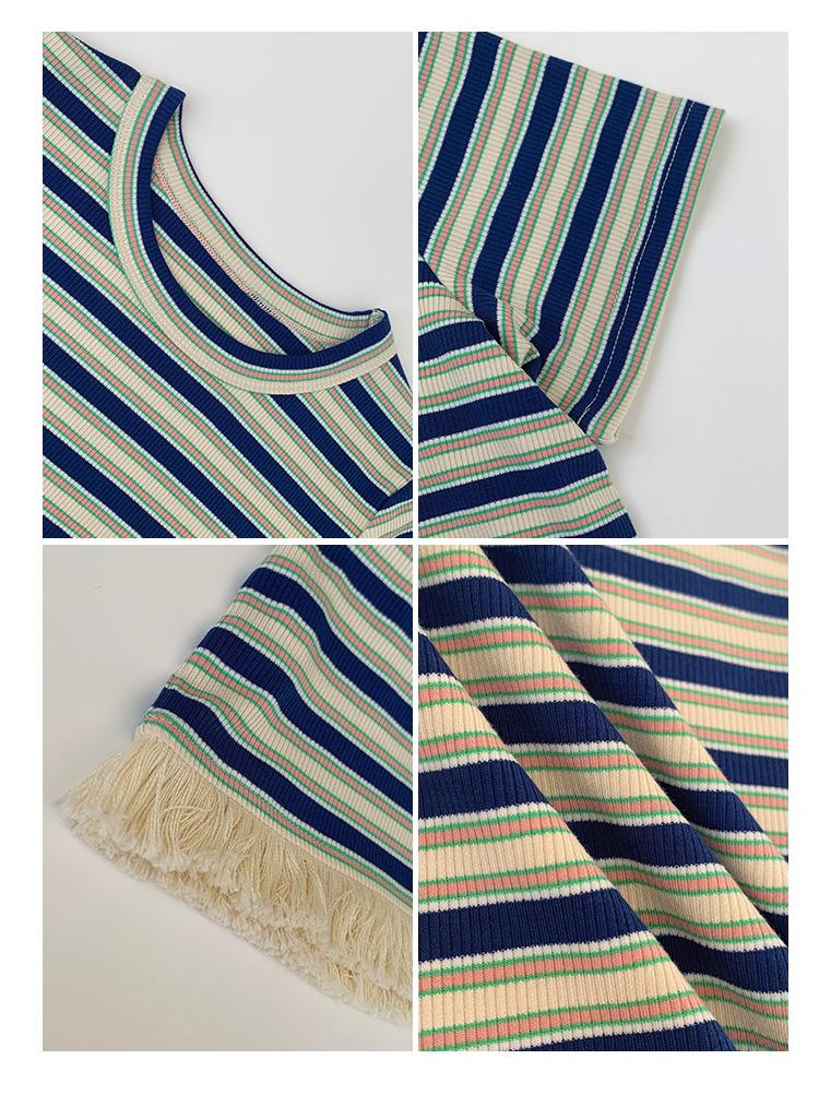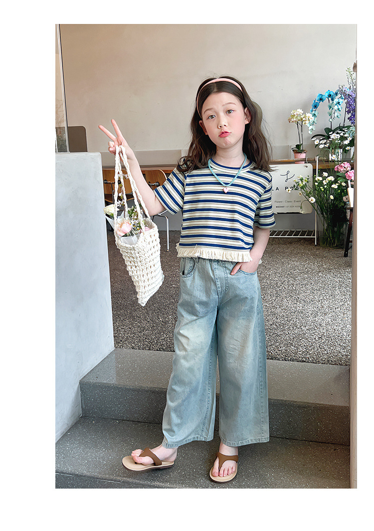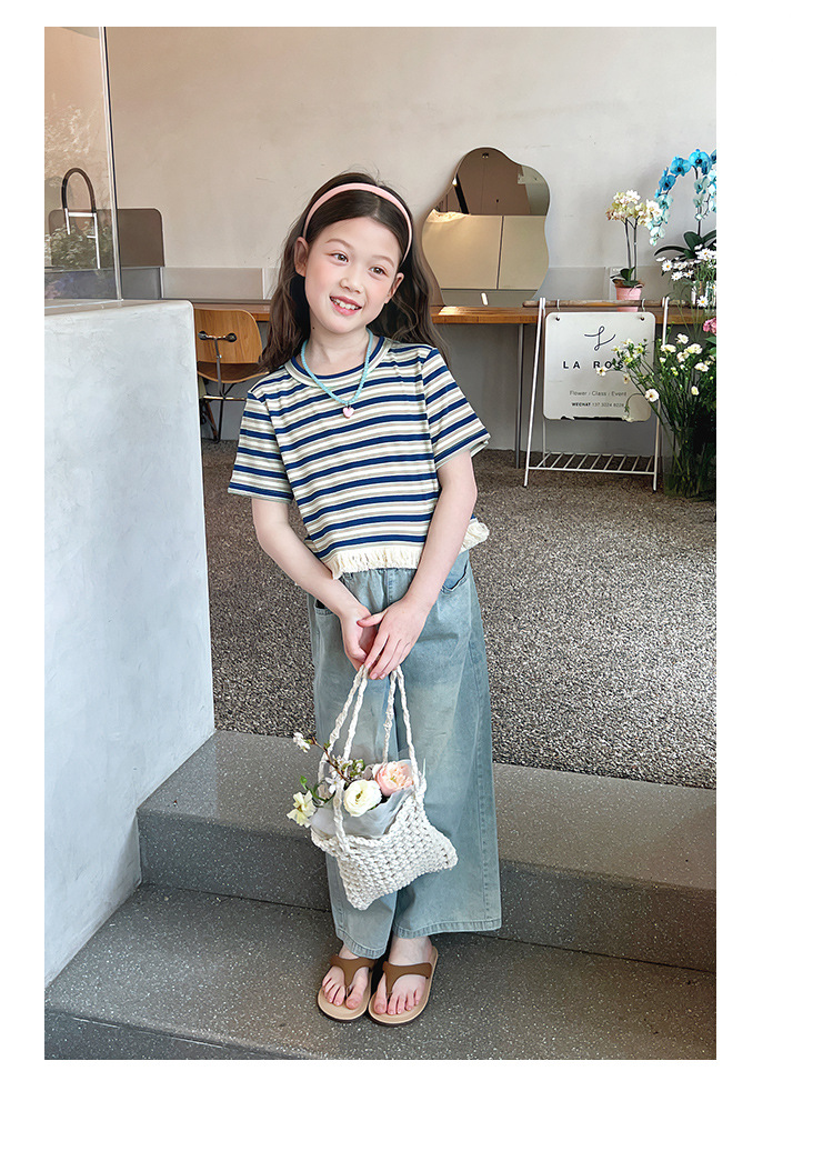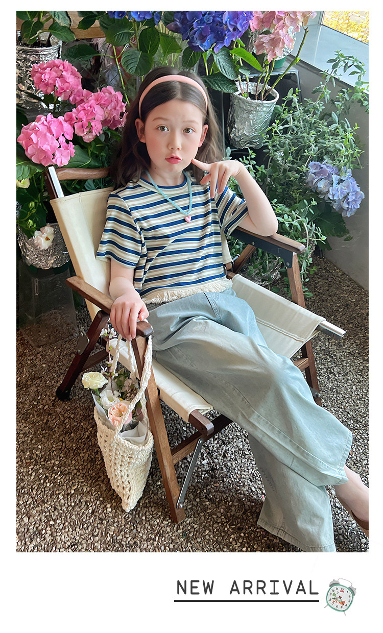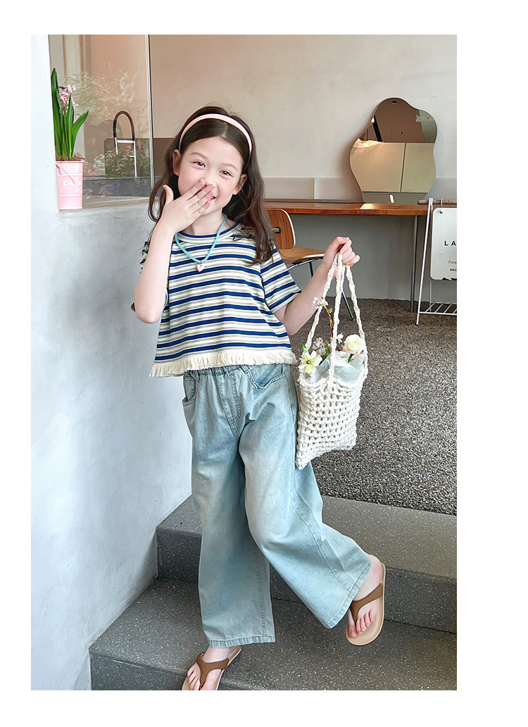 소녀의 줄무늬 바느질 짧은 티셔츠 어린이 서양식 인터넷 인기있는 느슨한 반팔 탑 큰 어린이 2025 여름 새로운 스타일스토어 가기