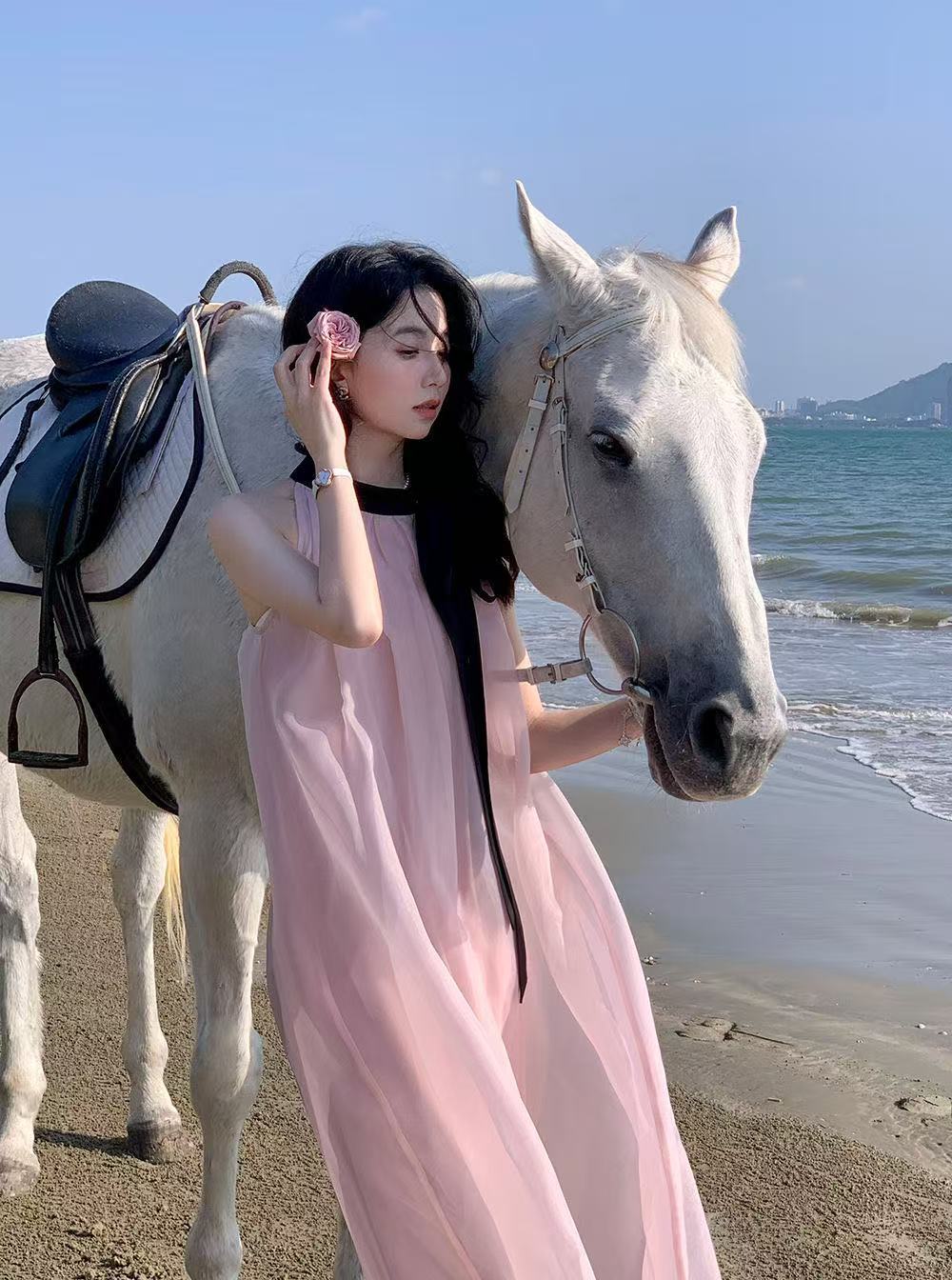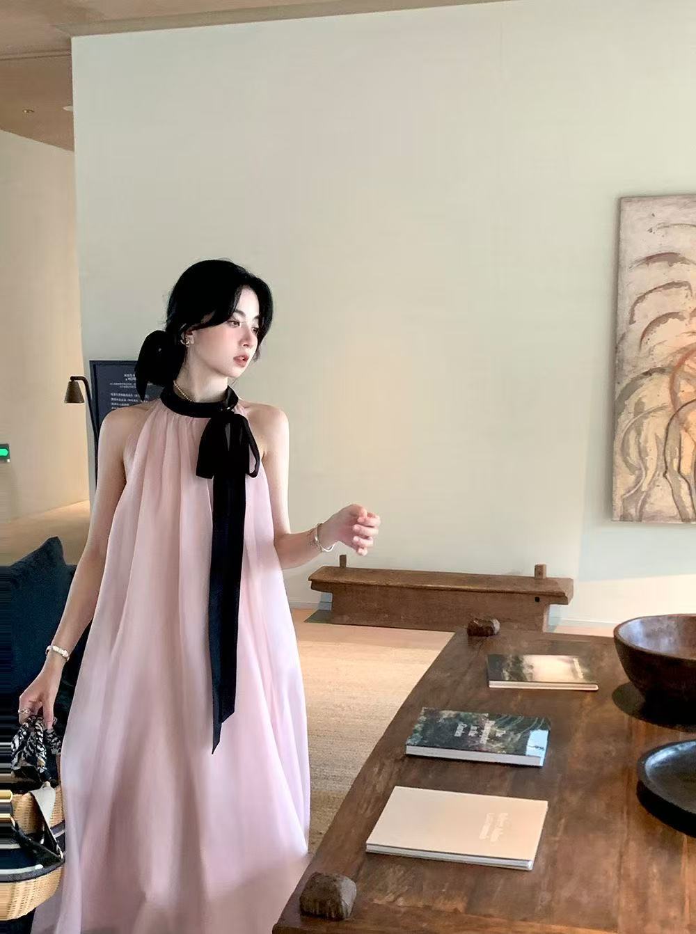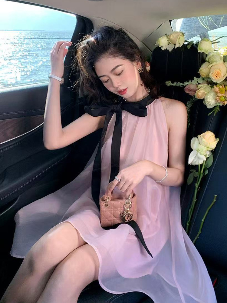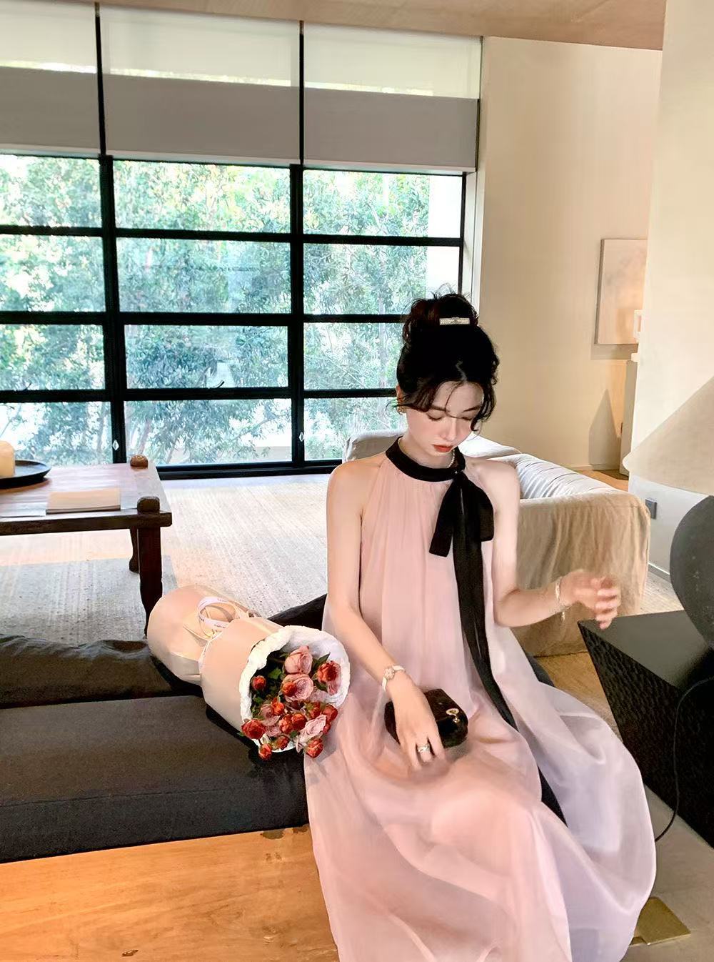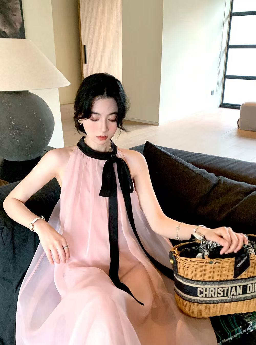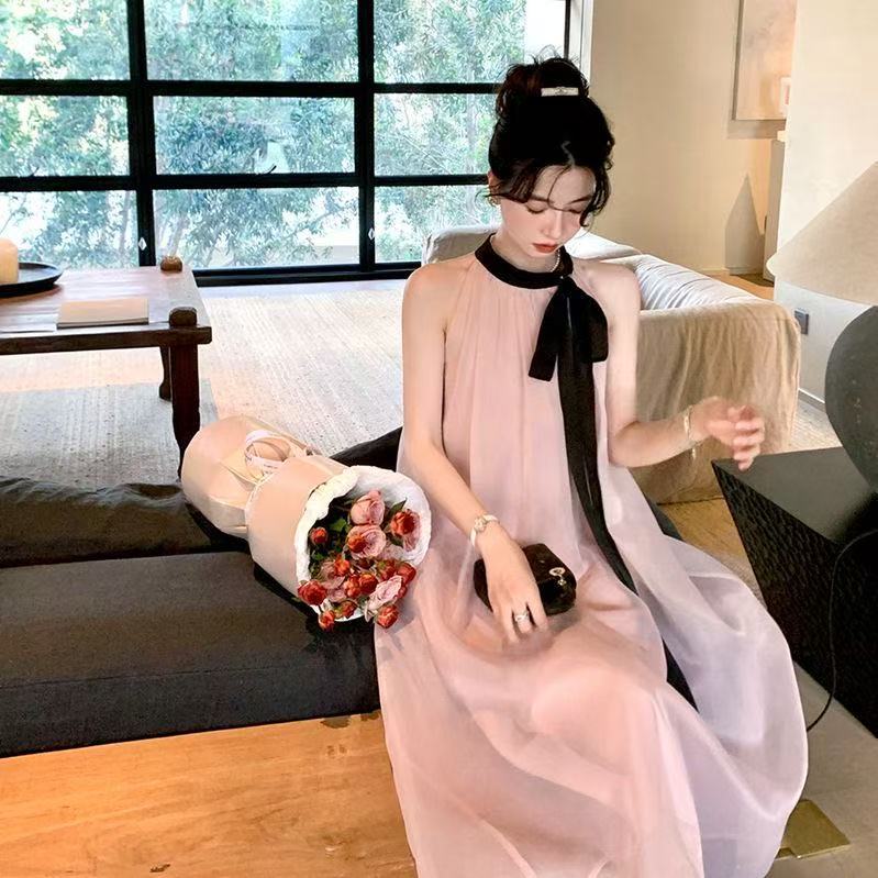 프랑스 핑크 우아한 목 원피스 어린이 여름 2025 새로운 해변 휴가 민소매 긴 원피스 하이 엔드 감각스토어 가기