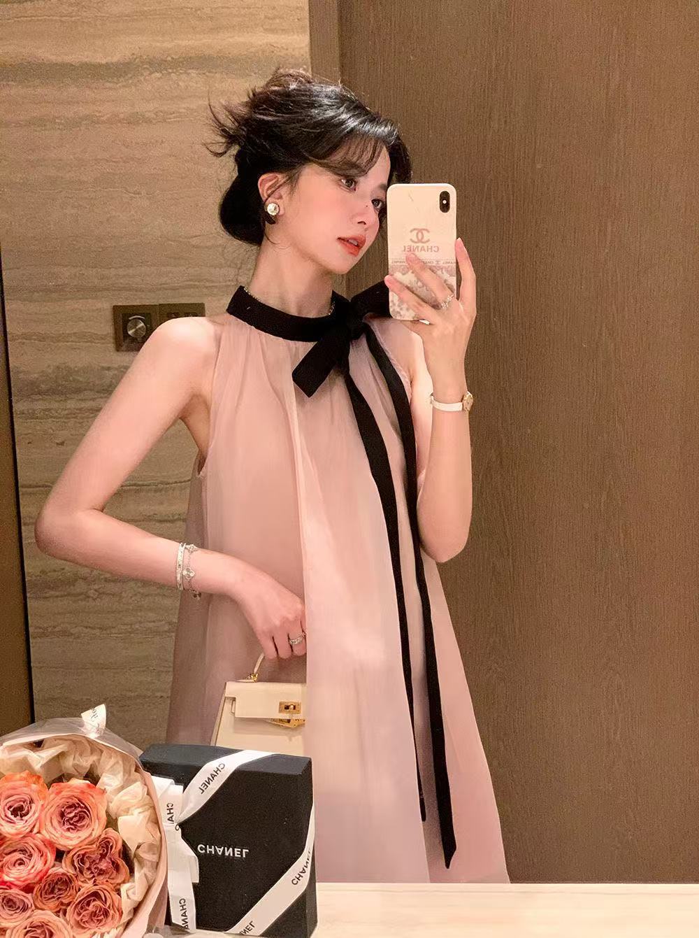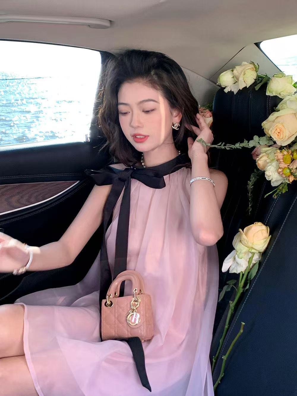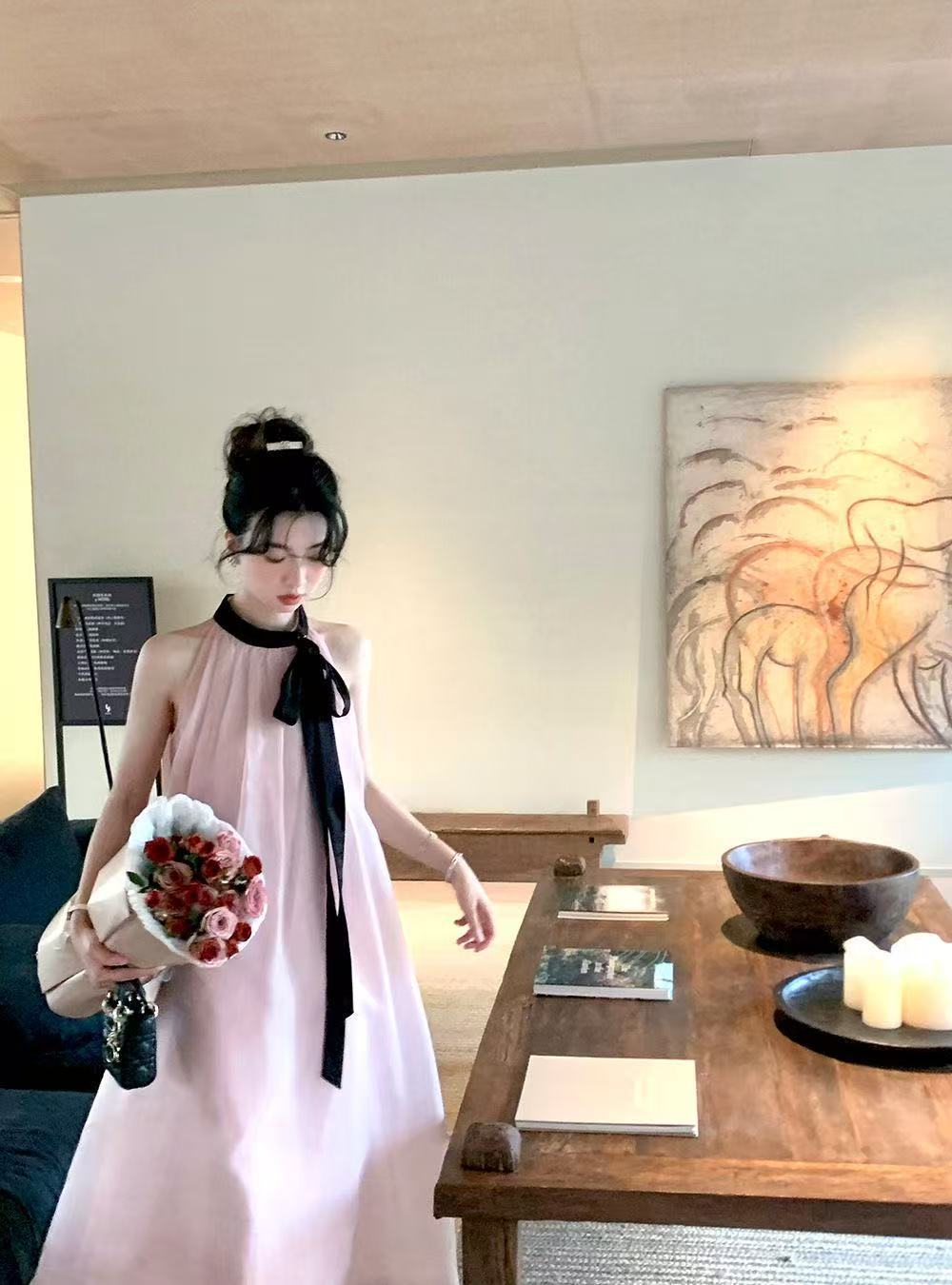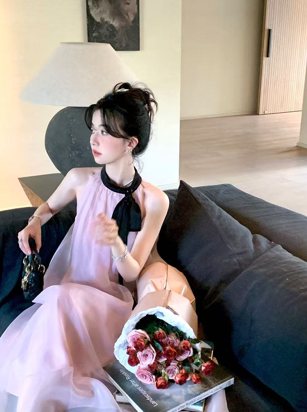 프랑스 핑크 우아한 목 원피스 어린이 여름 2025 새로운 해변 휴가 민소매 긴 원피스 하이 엔드 감각스토어 가기