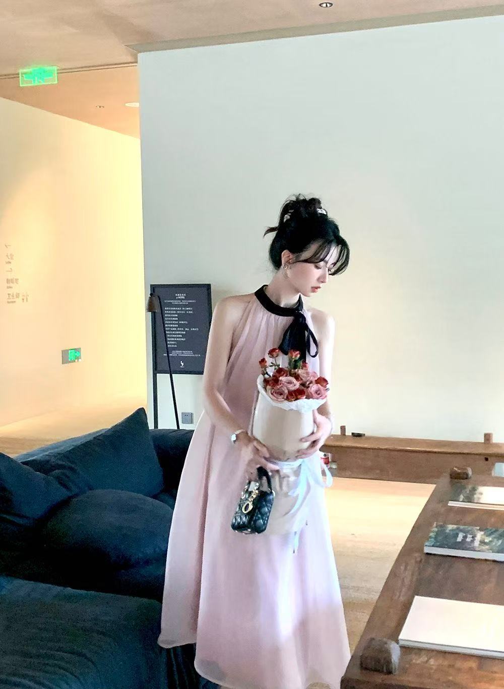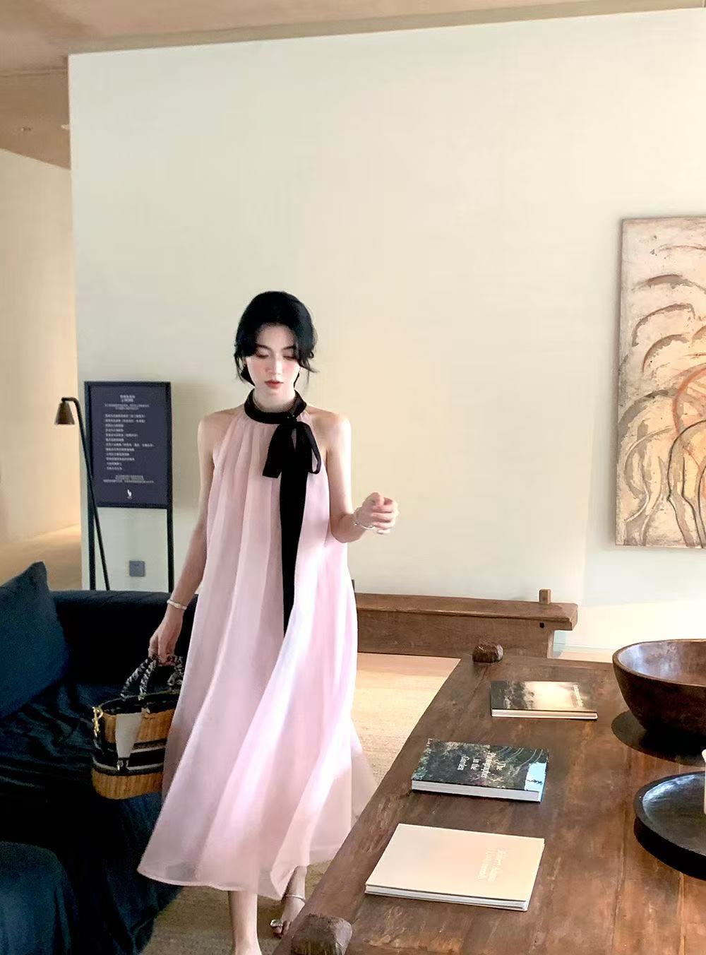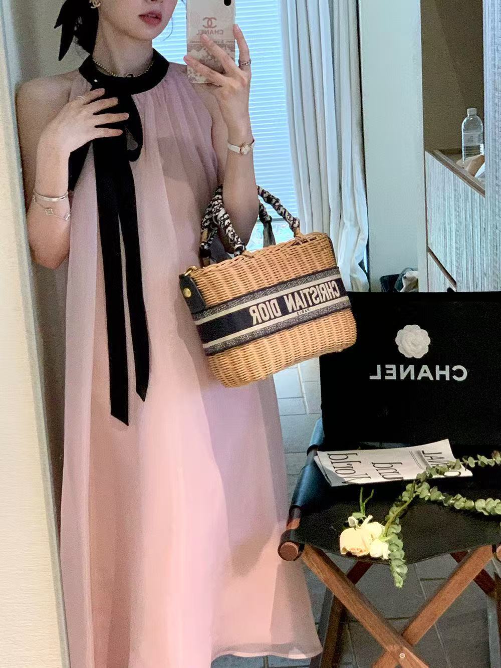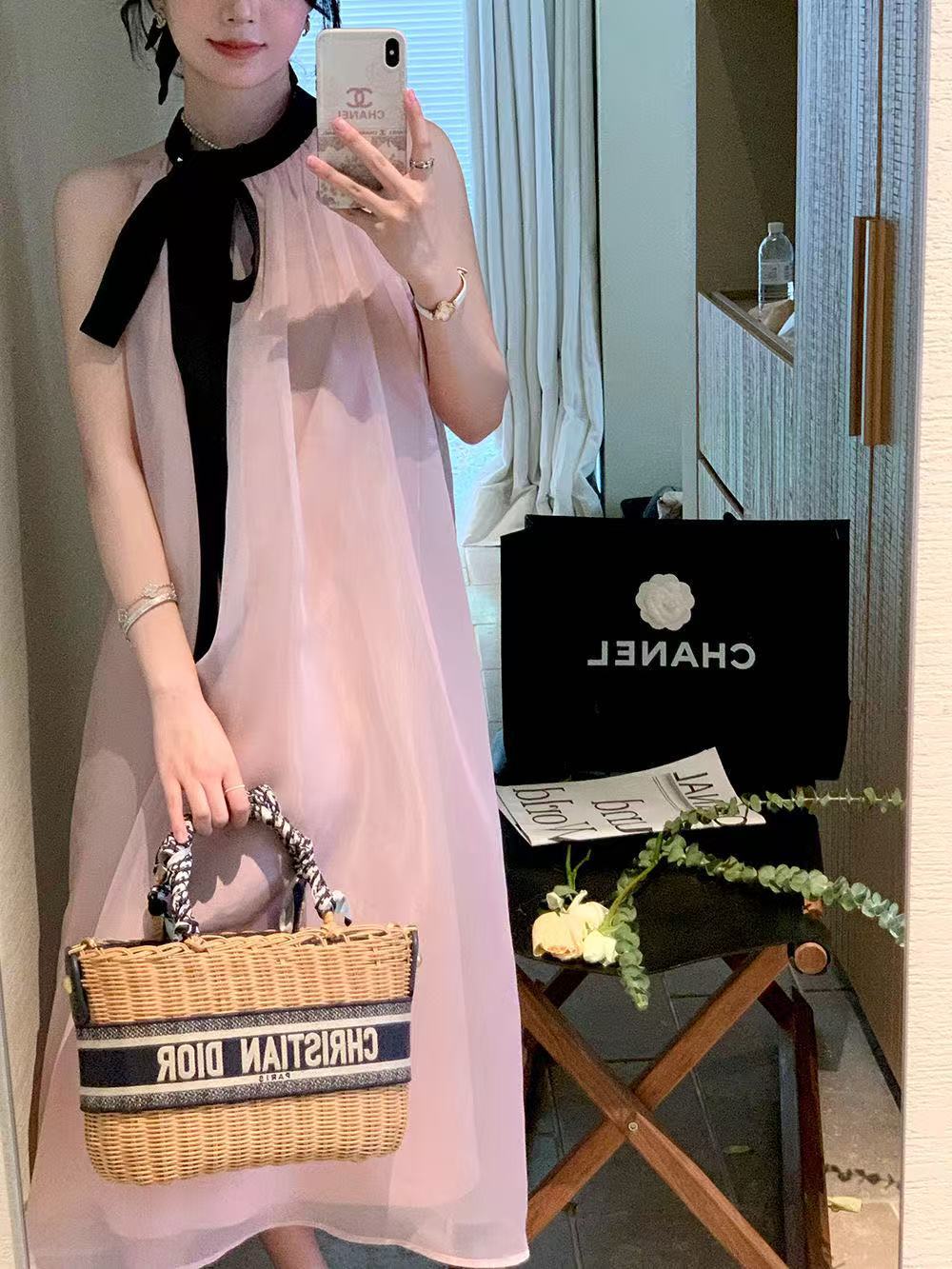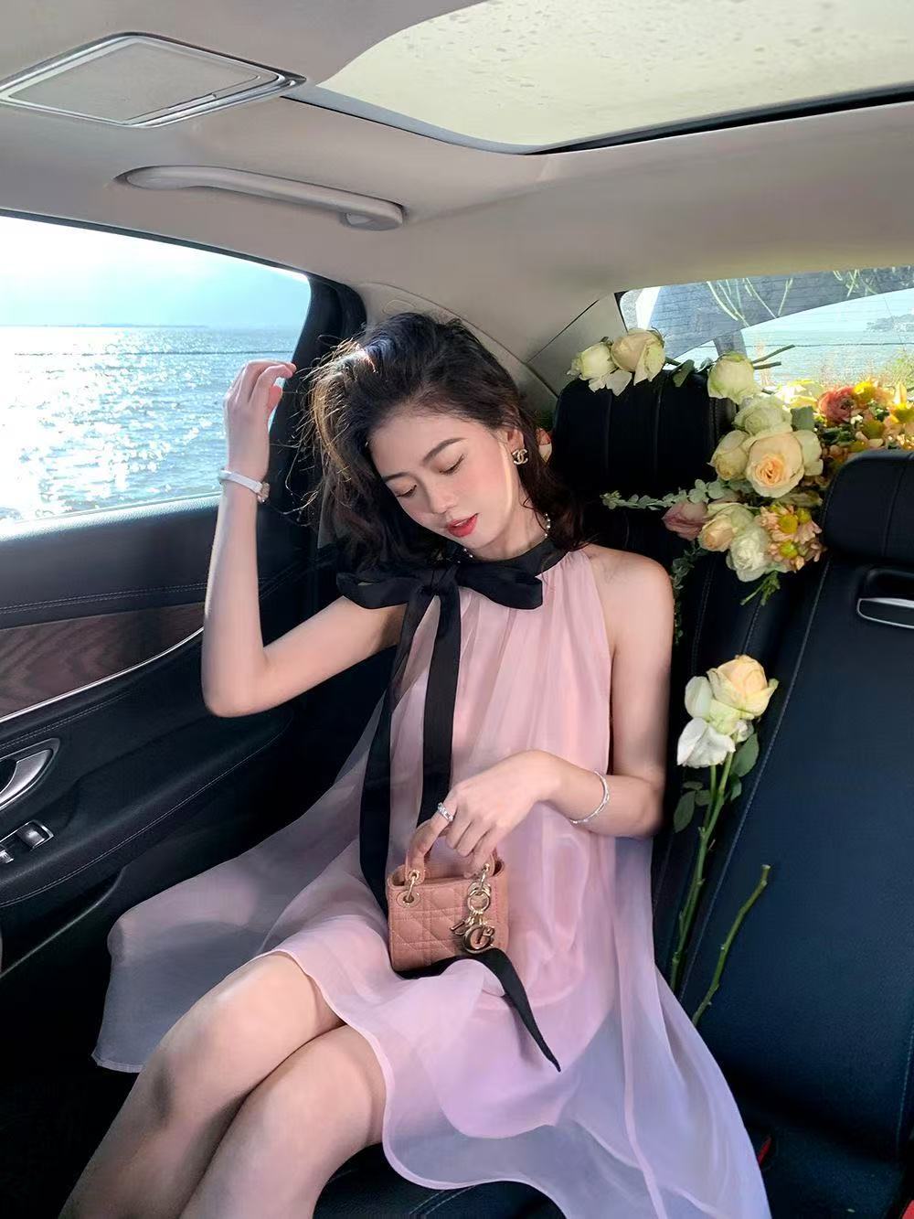 프랑스 핑크 우아한 목 원피스 어린이 여름 2025 새로운 해변 휴가 민소매 긴 원피스 하이 엔드 감각스토어 가기
