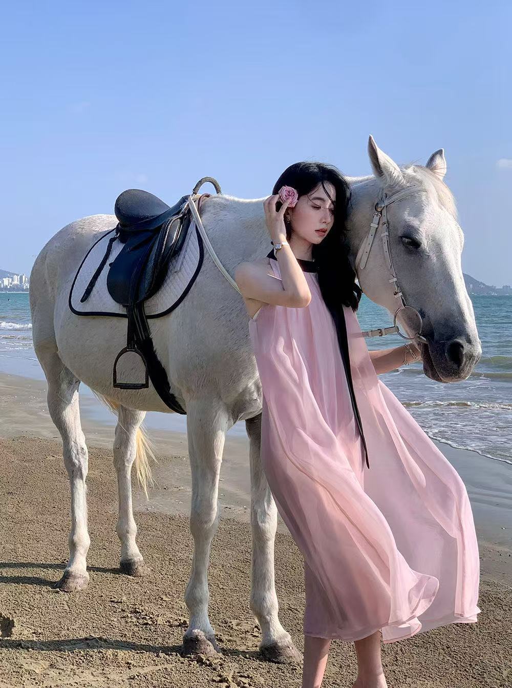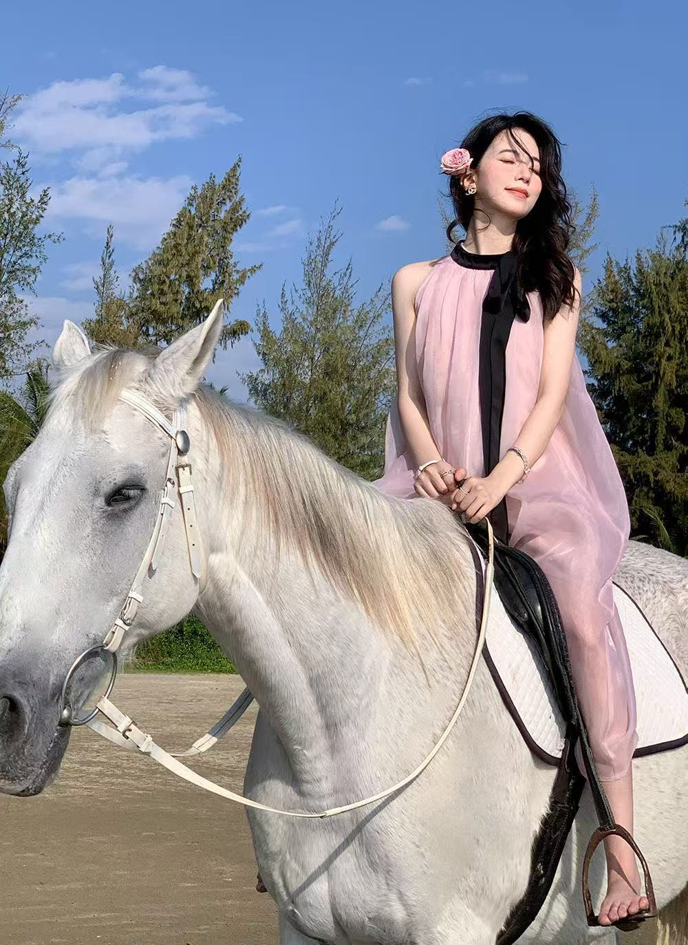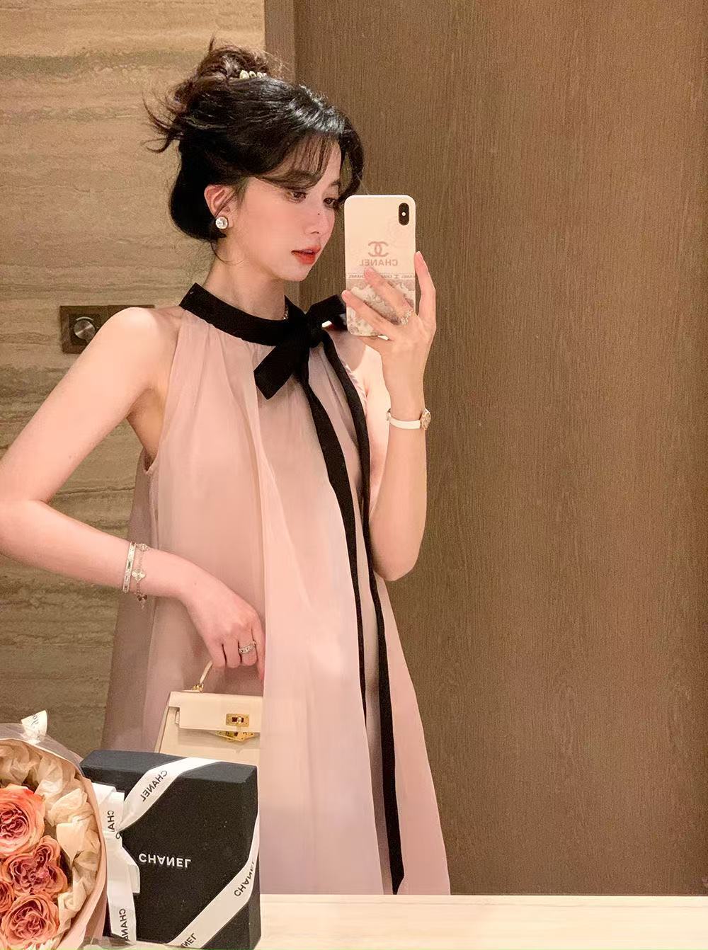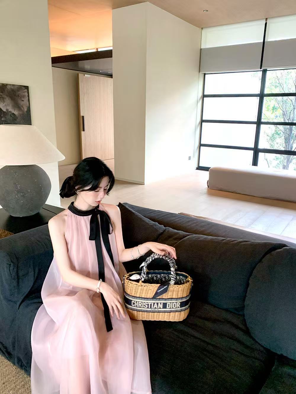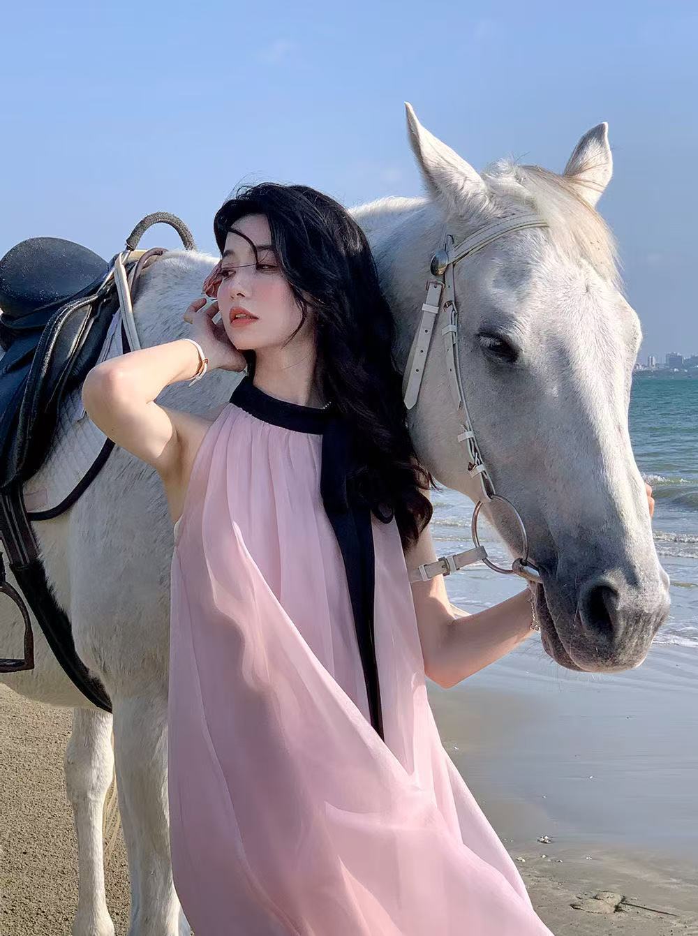 프랑스 핑크 우아한 목 원피스 어린이 여름 2025 새로운 해변 휴가 민소매 긴 원피스 하이 엔드 감각스토어 가기