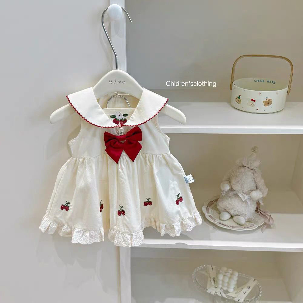 여자 체리 자수 민소매 원피스 여름 2025 새로운 독특한 아름다운 화이트 레이스 인형 칼라 공주 원피스스토어 가기