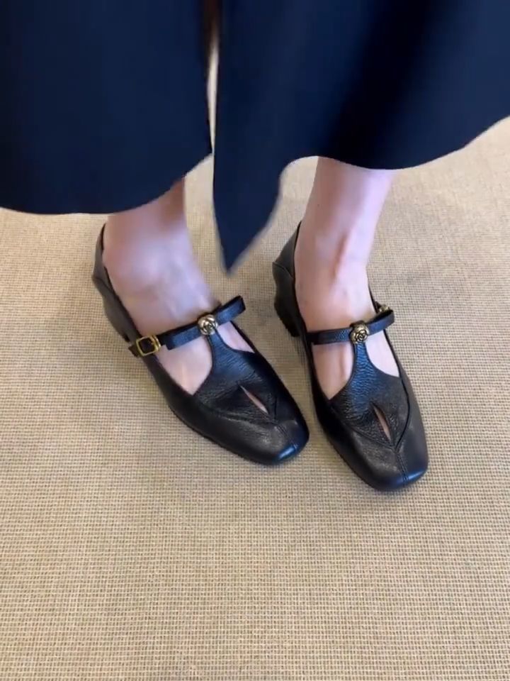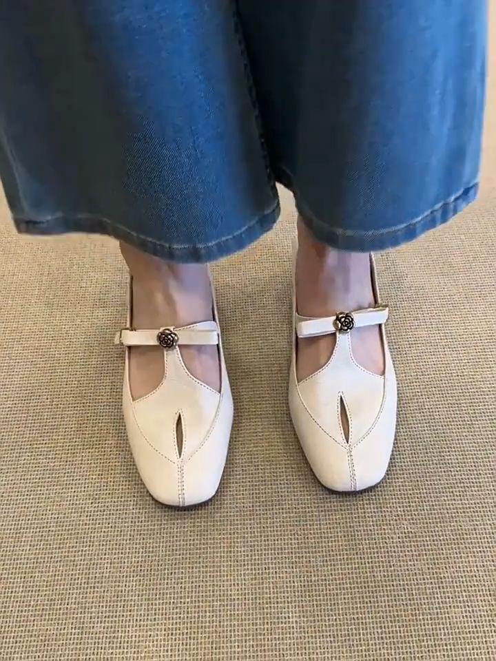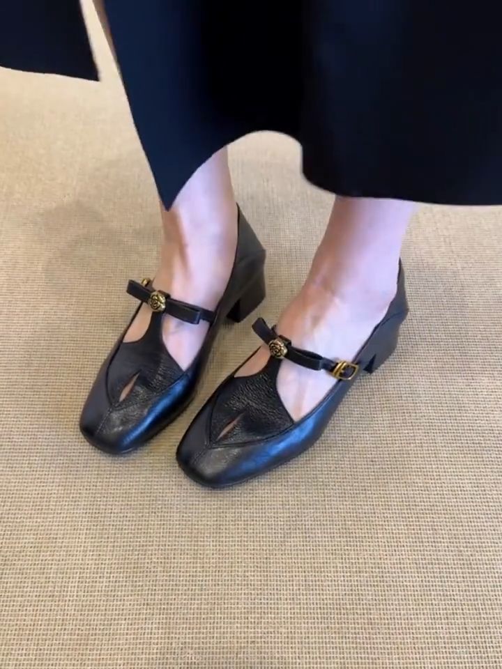 프렌치 레트로 중공 싱글 슈즈, 두꺼운 굽, 버클, 동백 여성 캐주얼 메리제인 슈즈, 통근용, 다재다능함스토어 가기