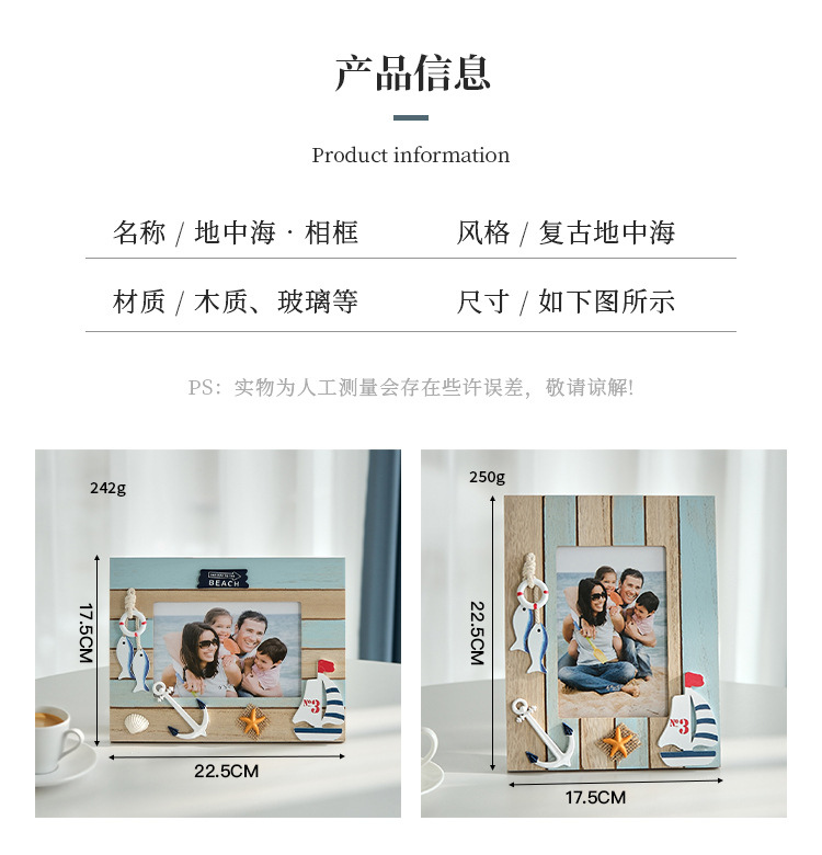 ps:产品为手工做旧,表面用砂纸打磨并非掉漆和质量问题哦,纯手工的产品会有纯手工的“痕迹”比如胶水,相框背部并非光滑完美,全新相框表面的沙石难免会脱落一些,产品为木质由师傅一个一个相框手工打磨的。地中海风格就是比较随性粗矿的哦,追求的是自然朴实,正是这种美才叫地中海风格,摆进房间显得非常独特,亲们请您在认可此风格的前提下进行购买!