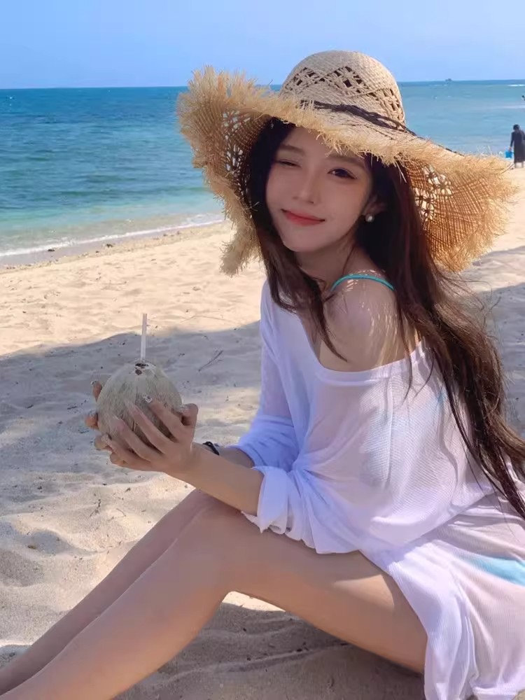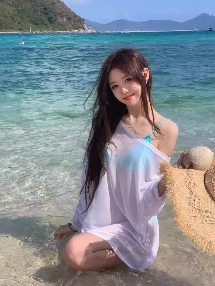 2025 여름 여성을 위한 흰색 약간 반투명한 자외선 차단제 긴팔 수영복 얇은 섹시한 핫 소녀 해변 겉옷 탑 크로스보더스토어 가기