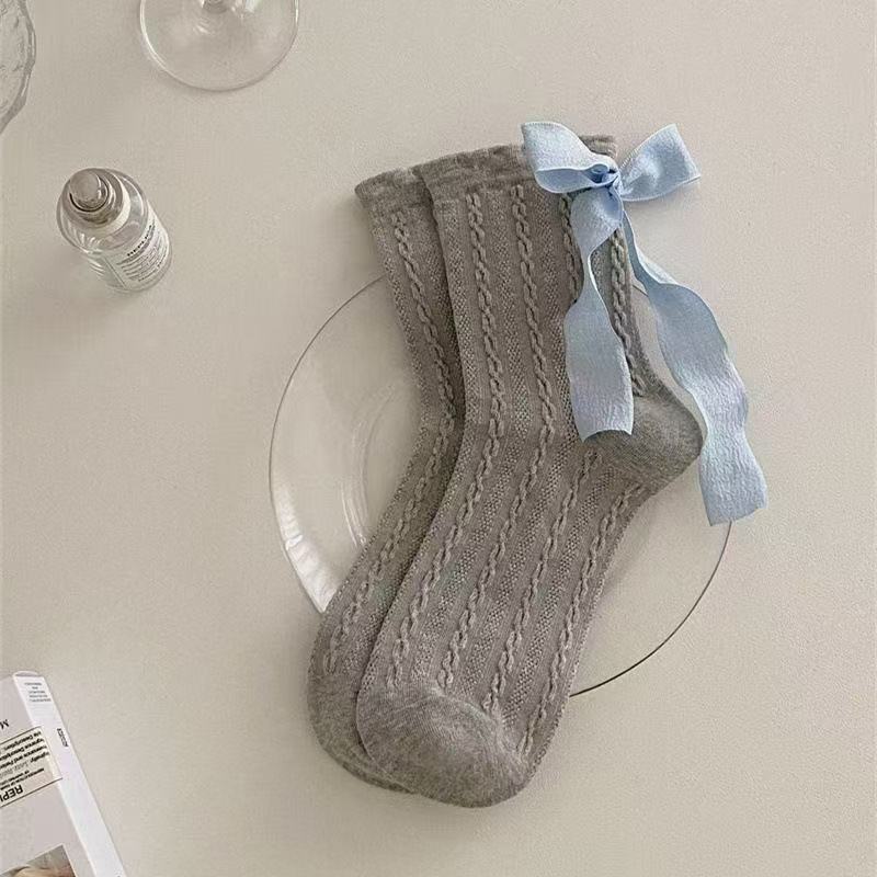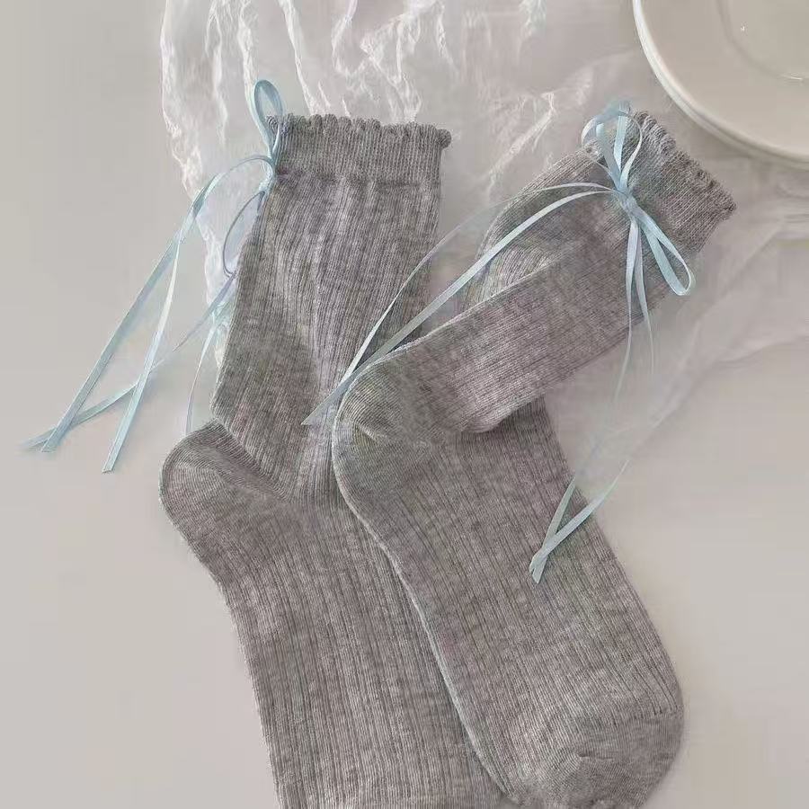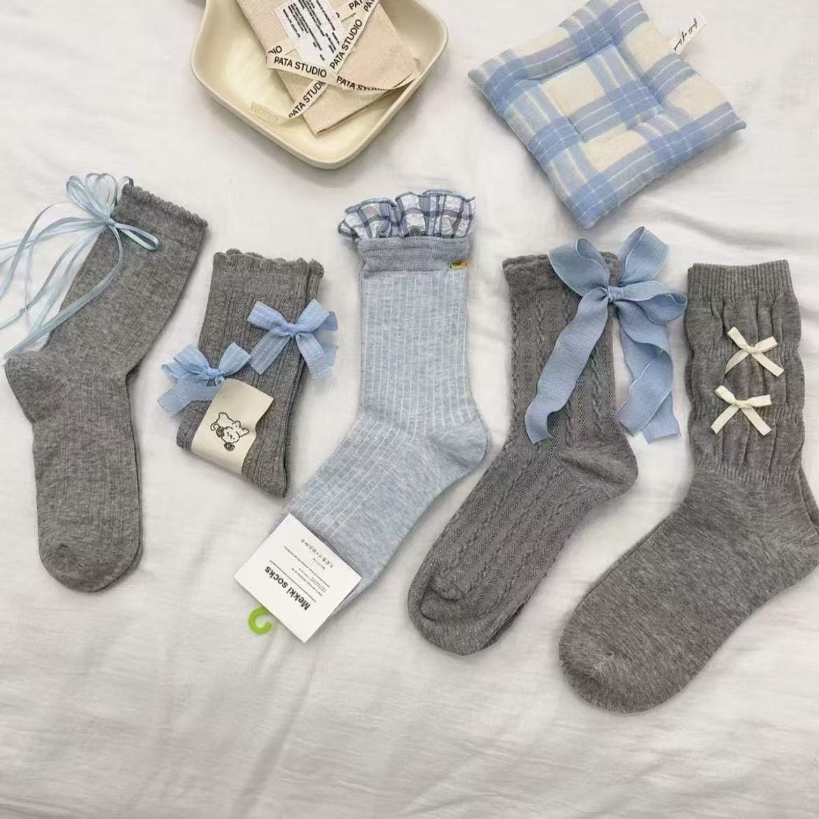 봄과 여름 한국식 고 부가가치 쌓인 양말 소녀 레이스 일본식 올매치 귀여운 격자 무늬 그레이 블루 보우 양말스토어 가기