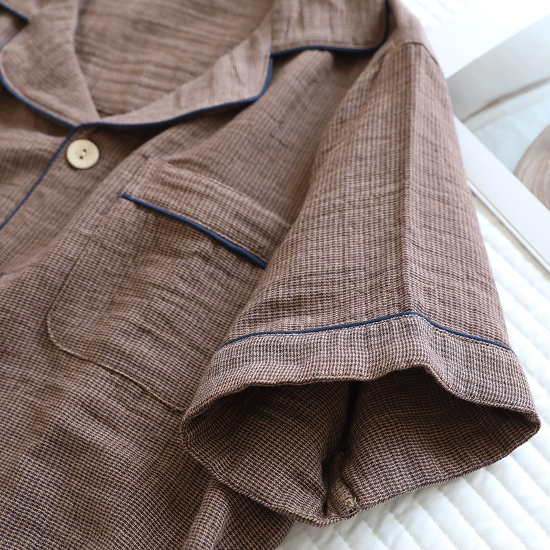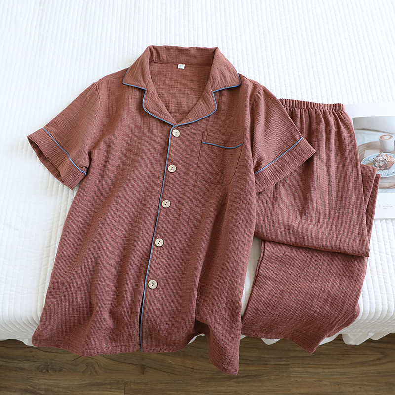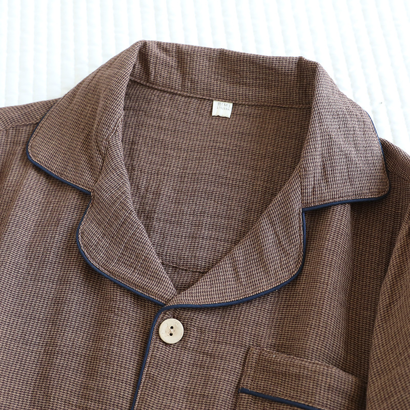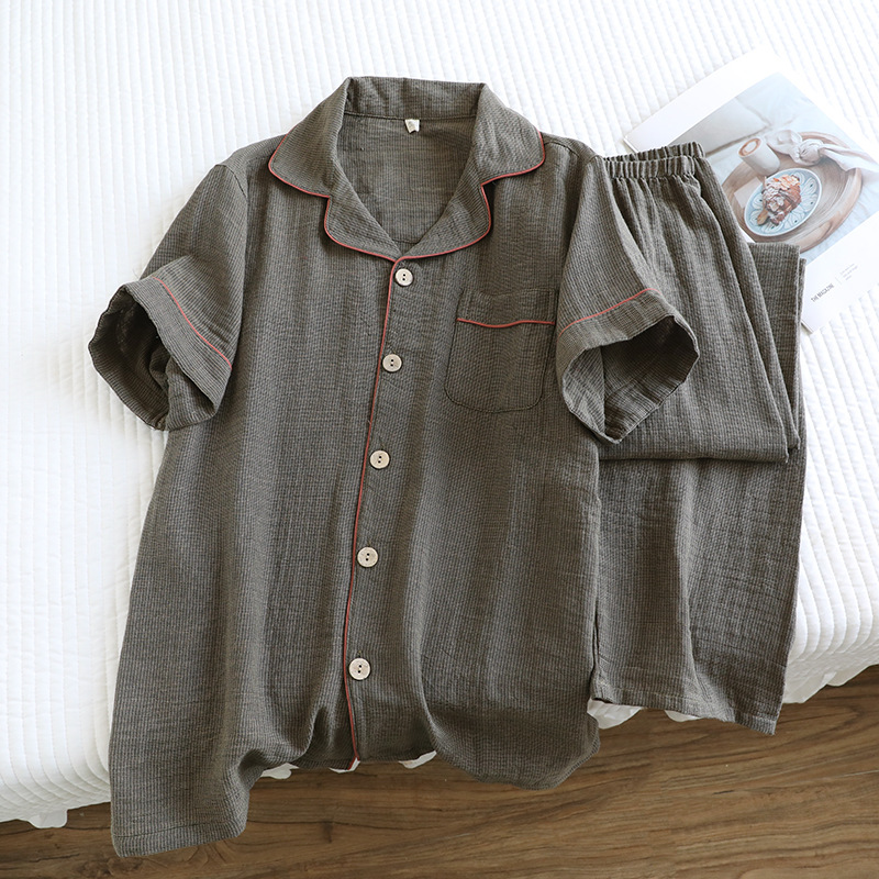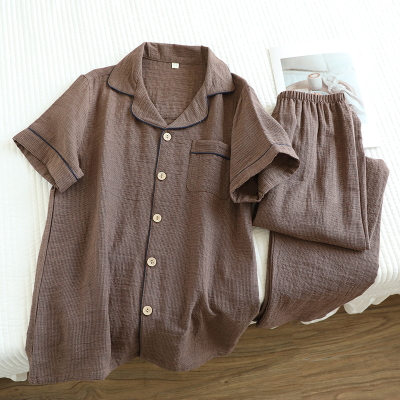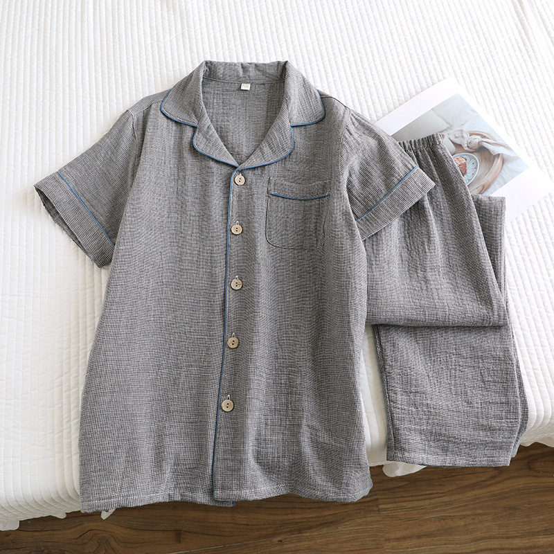 반팔 바지 남성면 파자마 여름 새로운 더블 레이어 원사 코튼 반팔 바지 세트 피부 친화적 인 통기성