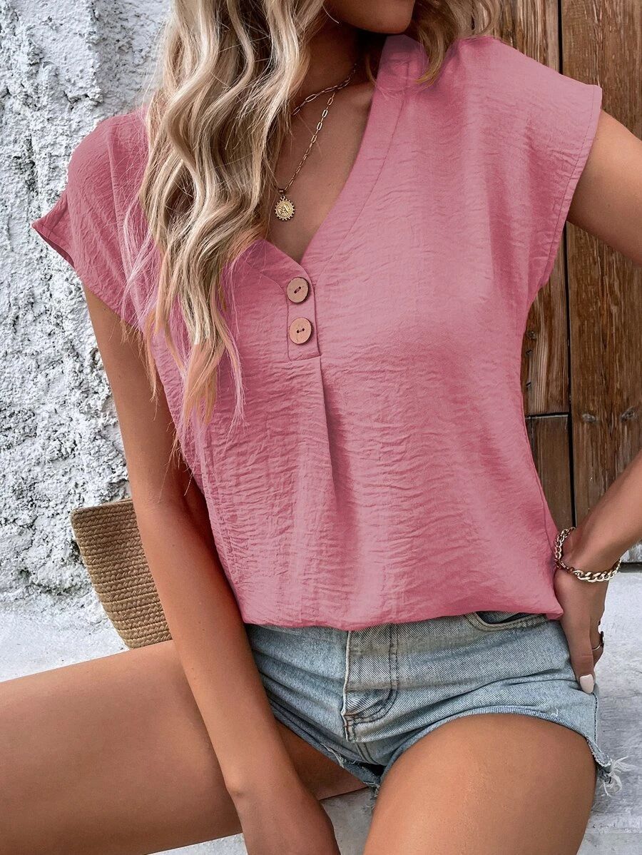 2025 봄과 여름 대외 무역 여성 의류 아마존, 국경 간 새로운 유럽과 미국의 최고 단색 트위스트 버튼 패션 짧은 소매 여성