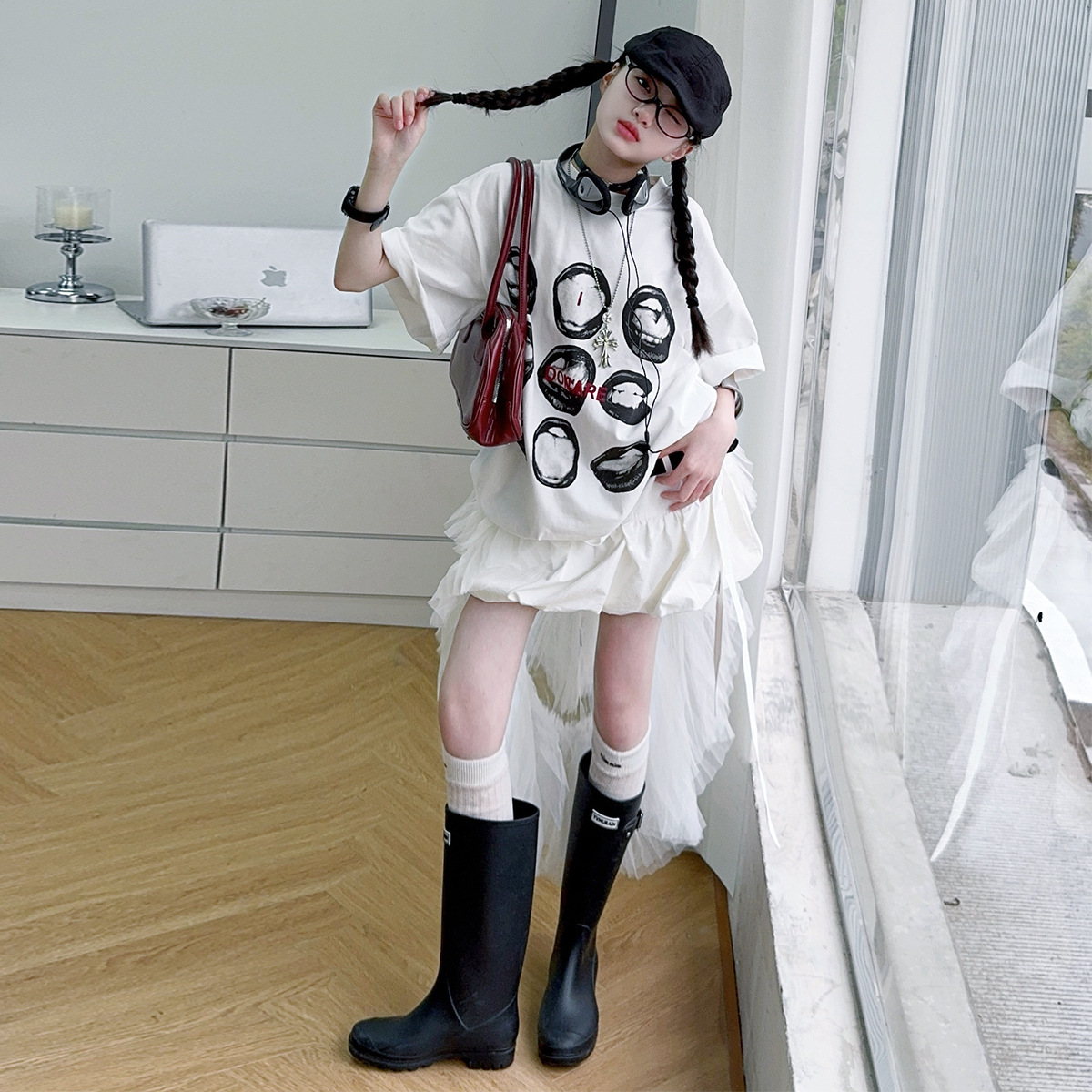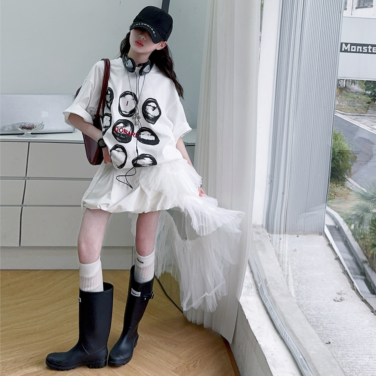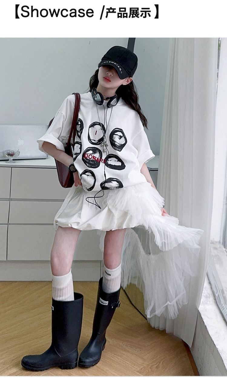 여자 여름 반팔 버드 스커트 푹신한 메쉬 스커트 3 피스 세트 2025 새로운 미국 흰색 티셔츠 스커트스토어 가기