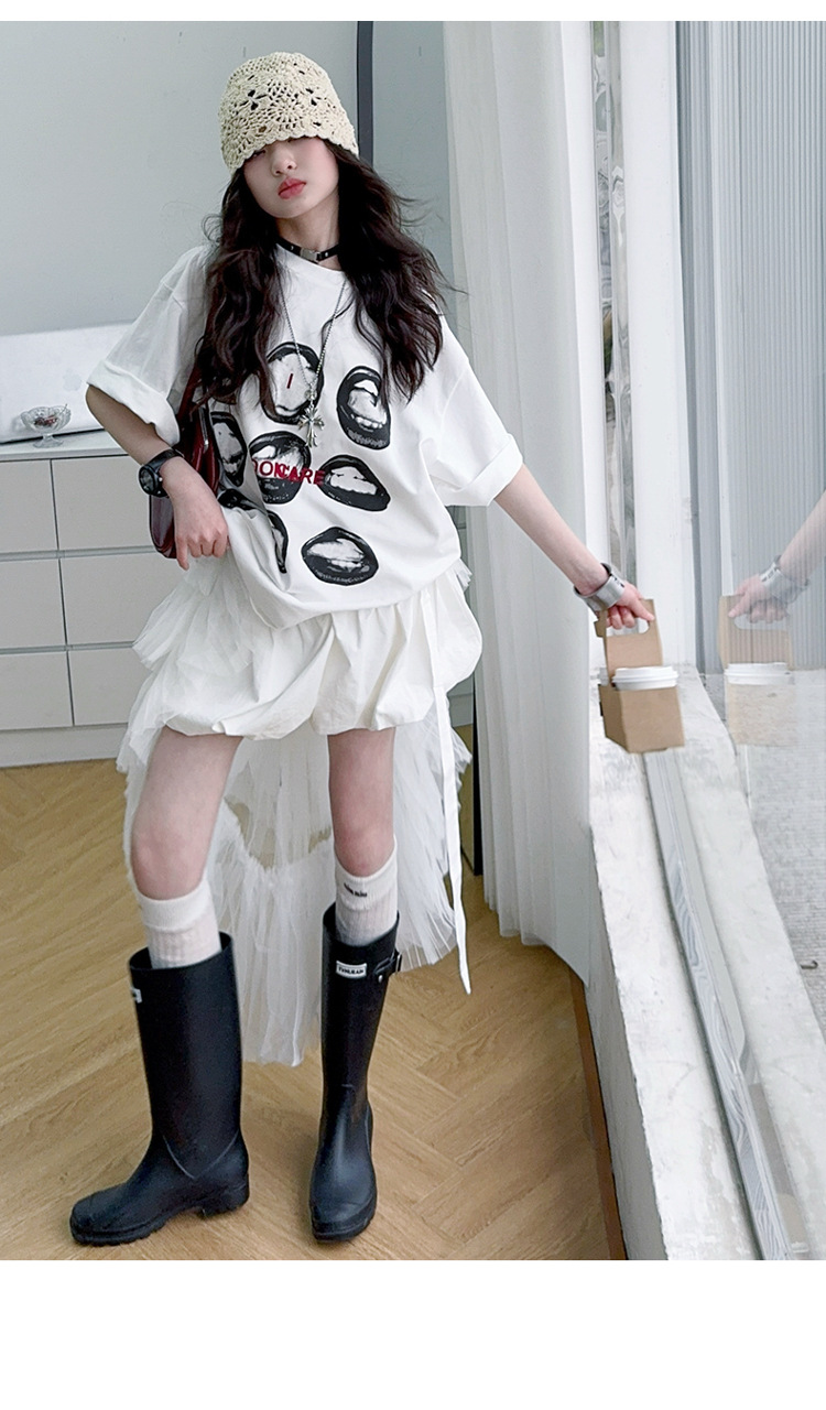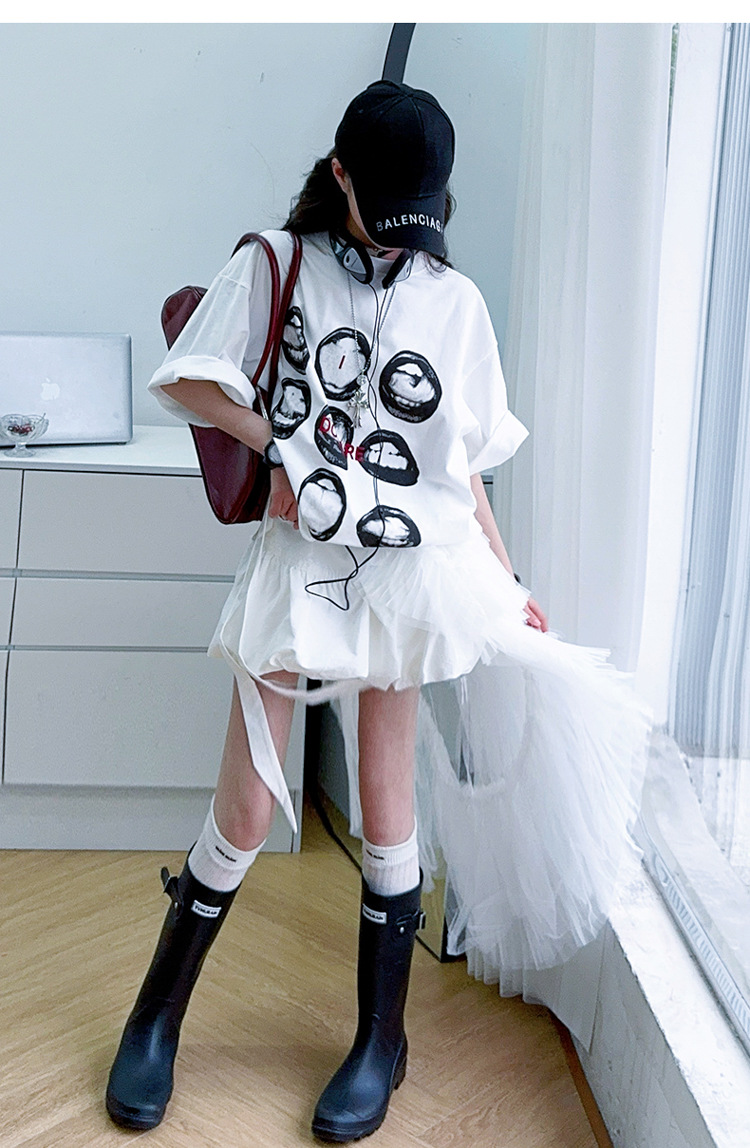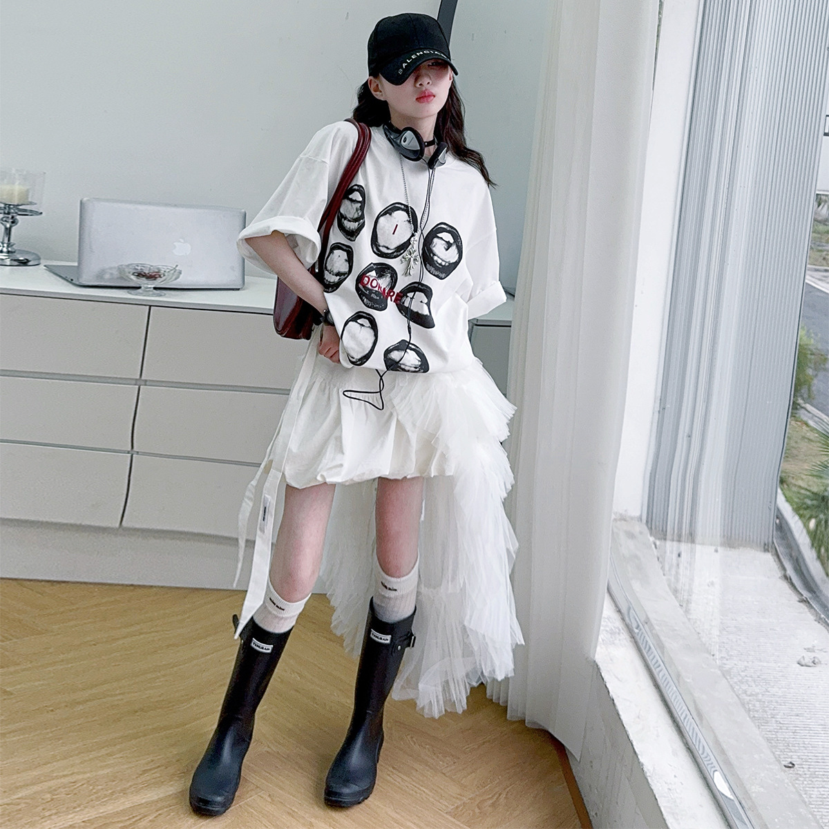 여자 여름 반팔 버드 스커트 푹신한 메쉬 스커트 3 피스 세트 2025 새로운 미국 흰색 티셔츠 스커트스토어 가기