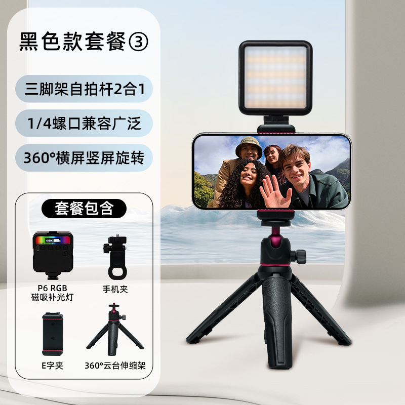 • P5R [RGB 풀 컬러] 필 라이트 + 360 팬 텔레스코픽 삼각대 [블랙] + E-클립 + 휴대폰 클립