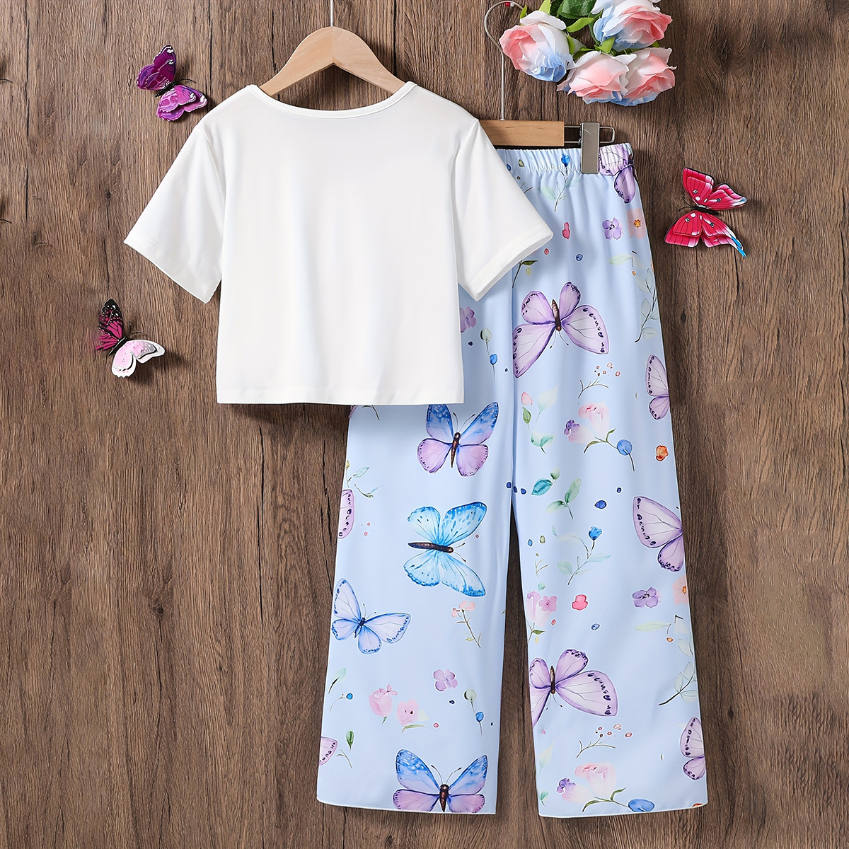 女童套装夏季跨境童装批发短袖蝴蝶印花T恤+碎花满印长裤两件套潮