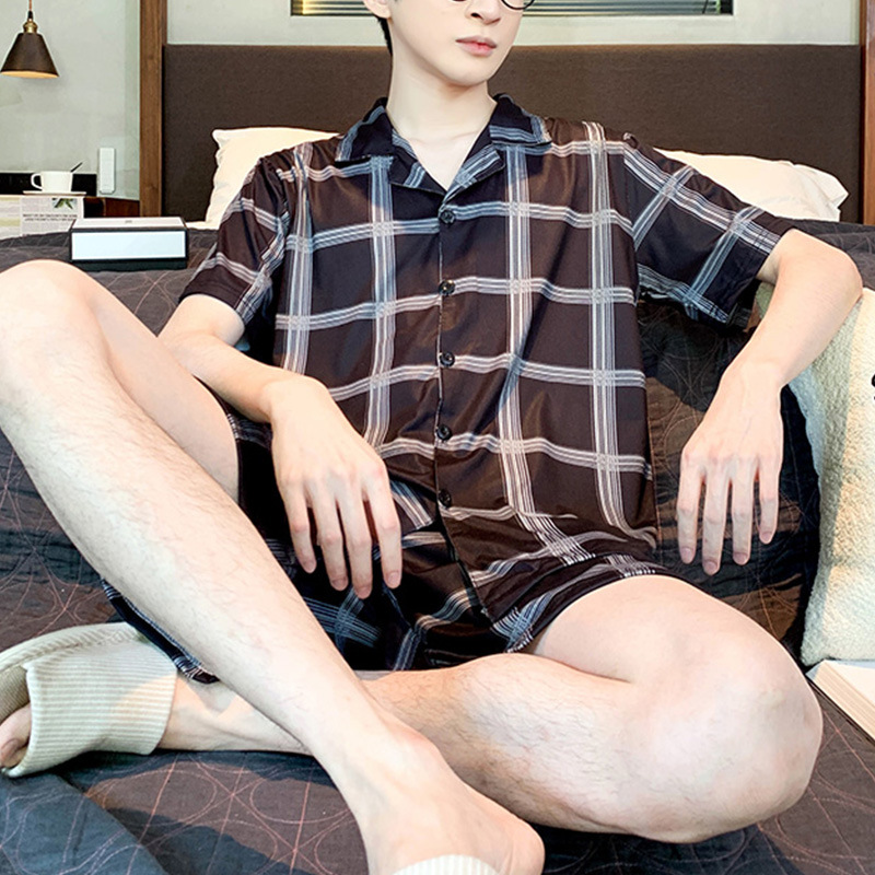 남성용 잠옷 여름 잠옷 반팔 반바지 얇은 남성용 여름 검은 줄무늬 가정복 국경 간 도매스토어 가기