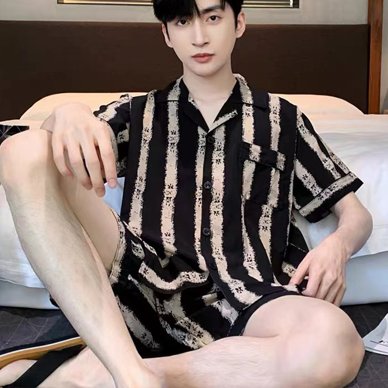 남성용 잠옷 여름 잠옷 반팔 반바지 얇은 남성용 여름 검은 줄무늬 가정복 국경 간 도매