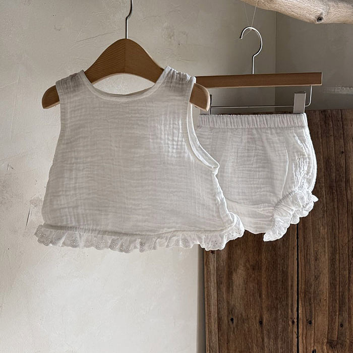 한국 스타일 아동 의류 25 여름 아기 소녀 아기 면화 부드러운 레이스 솔리드 컬러 딸기 조끼 빅 P 반바지 정장스토어 가기