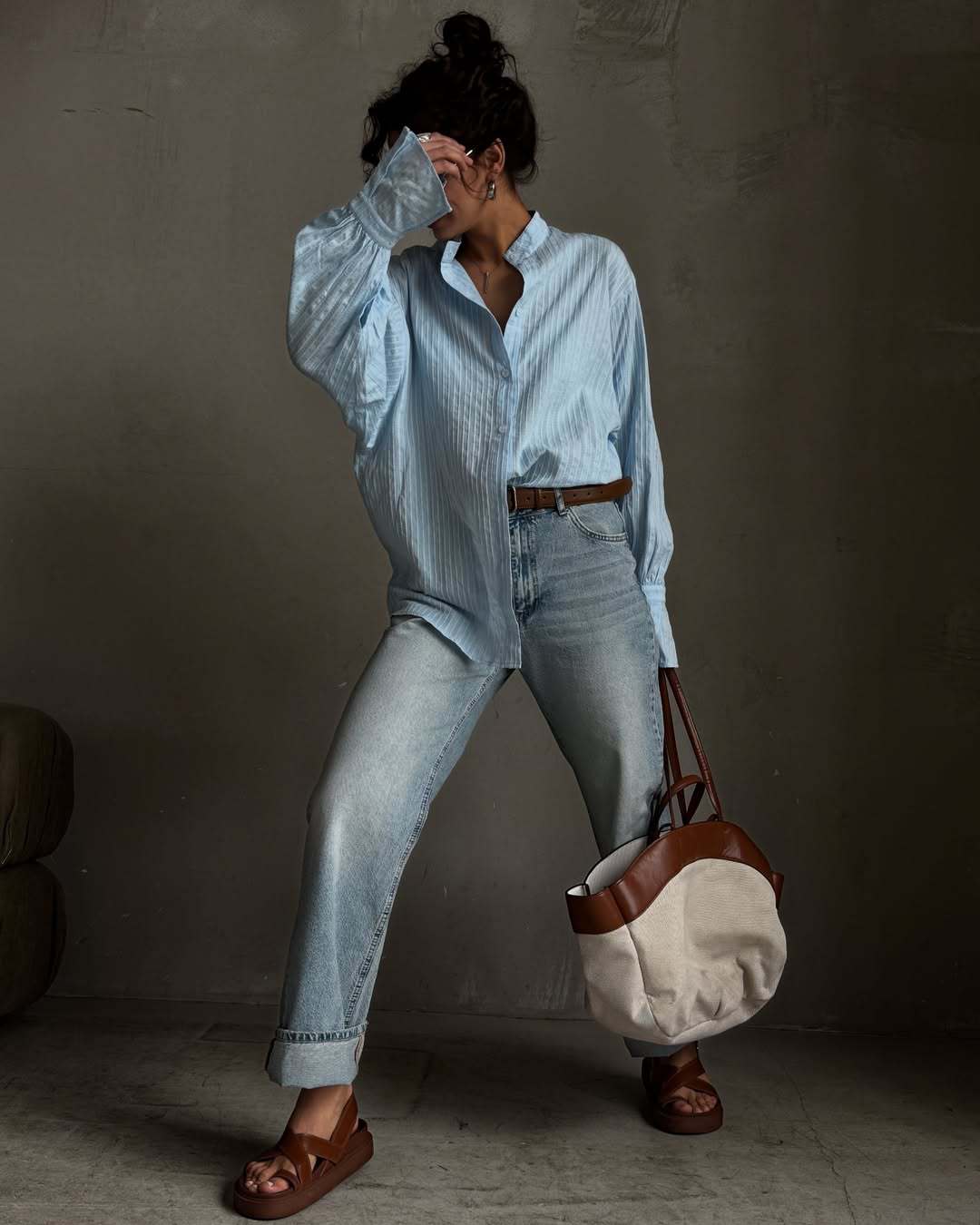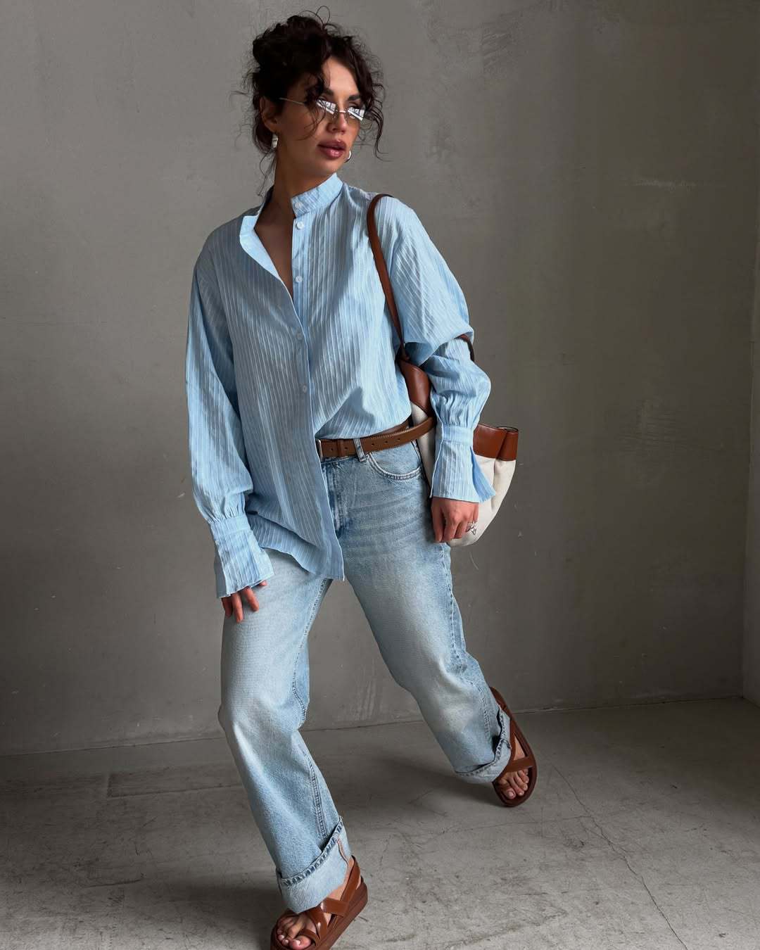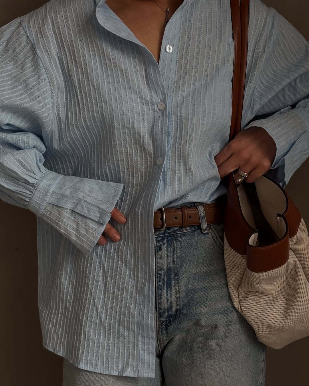 欧美春季新款提花蓝色衬衫上衣跨境简约高级感通勤街头长袖衬衣女