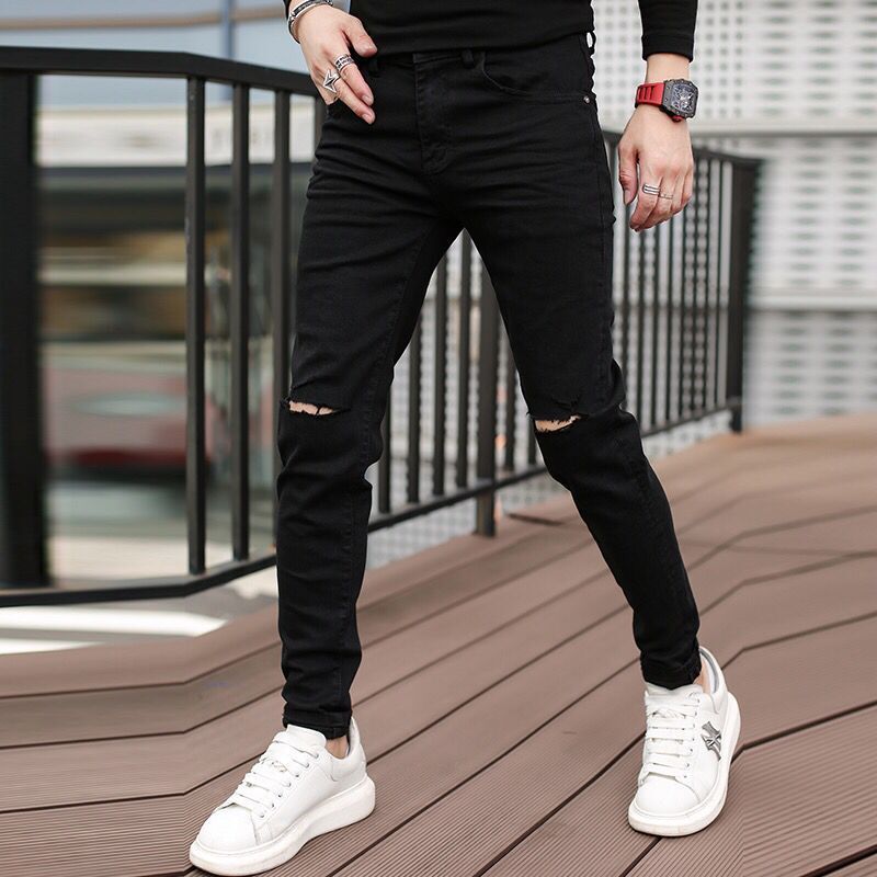 여름 남성 청바지 블랙 슬림 롱 팬츠 트렌디한 한국식 유럽 스타일 남성용 찢어진 캐주얼 팬츠