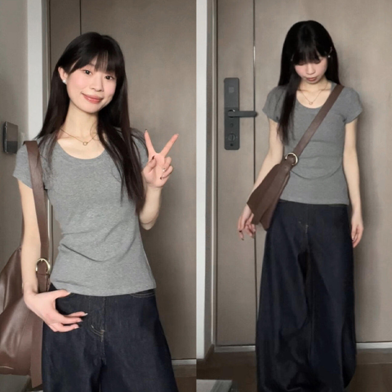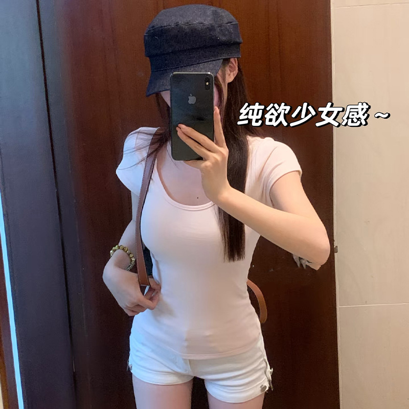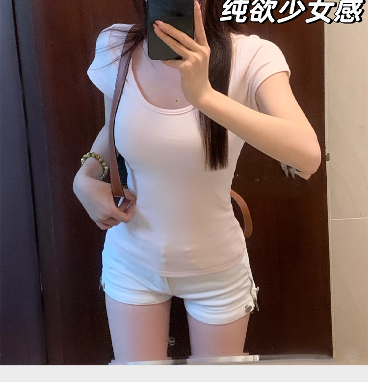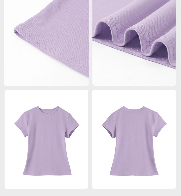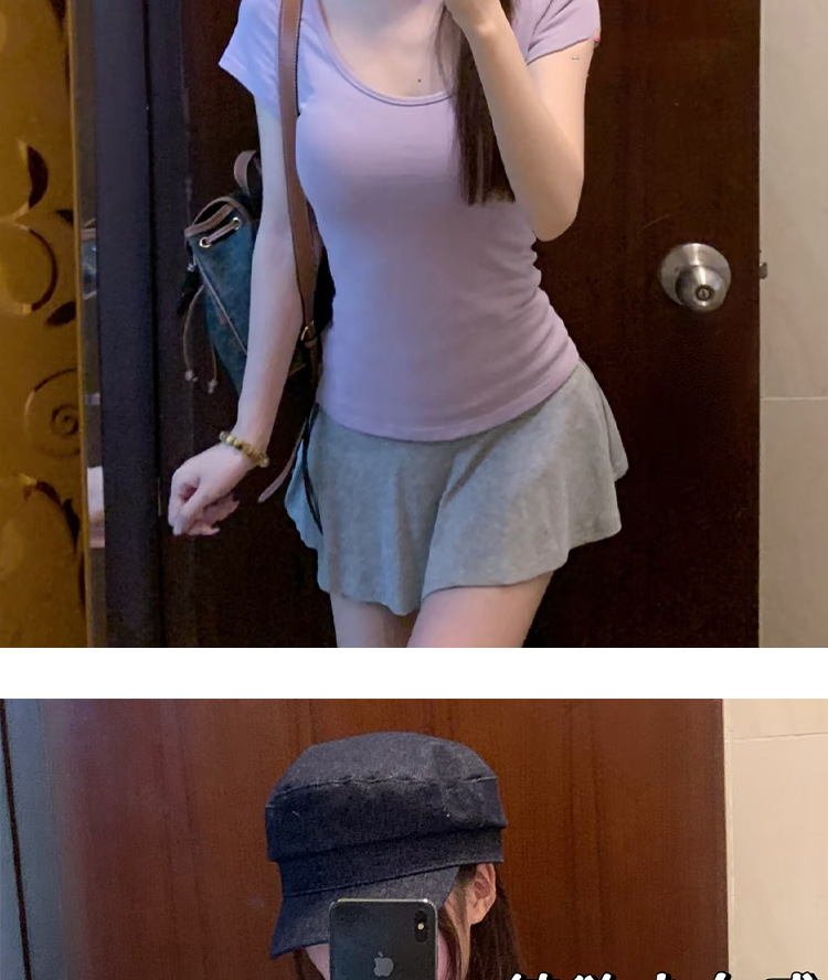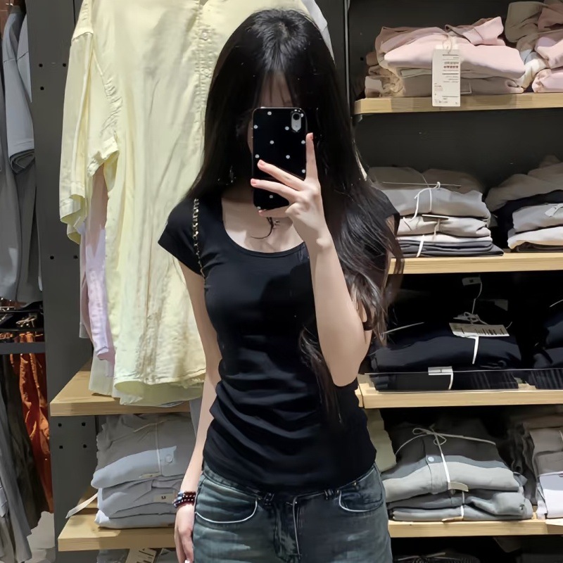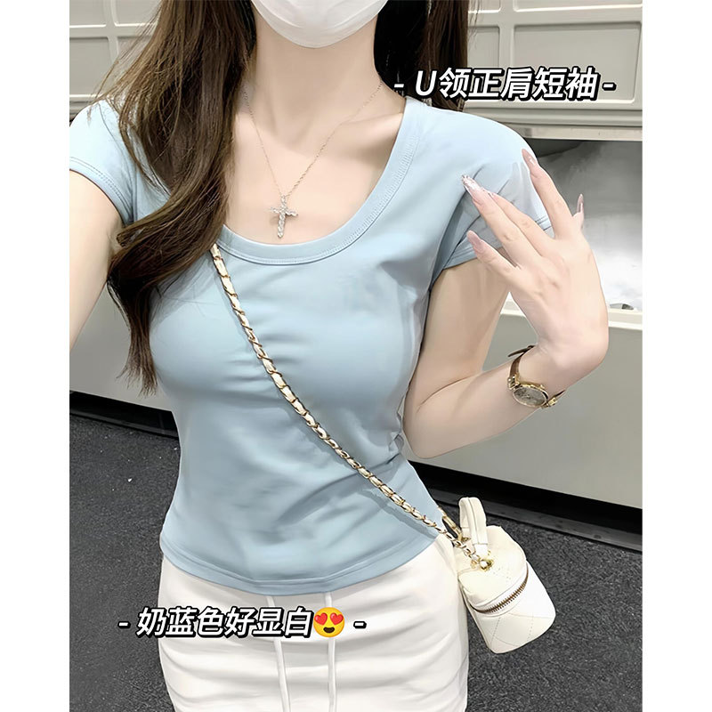 여성용 빅 네크라인 U 넥 오른쪽 어깨 반팔 티셔츠 여름 2025 새로운 스타일 허리 슬리밍 초여름 보라색 탑스토어 가기