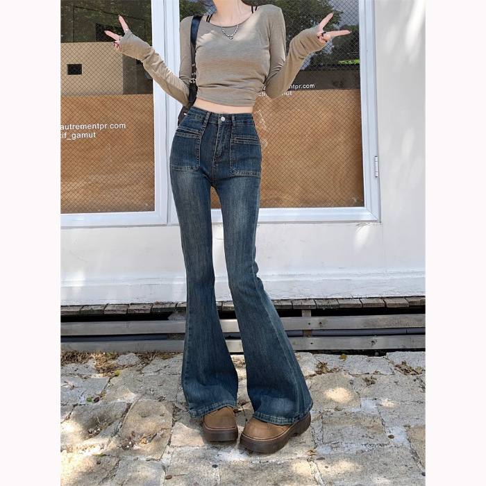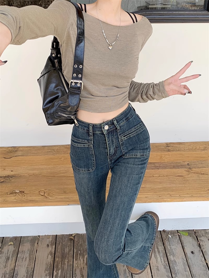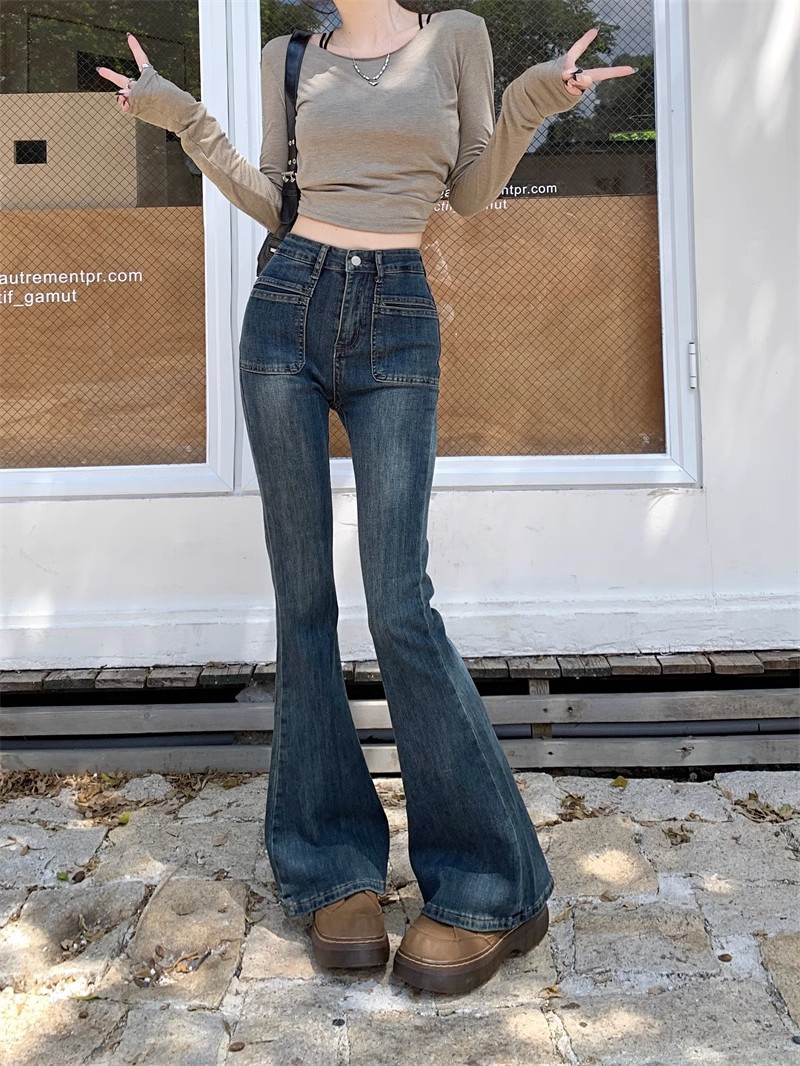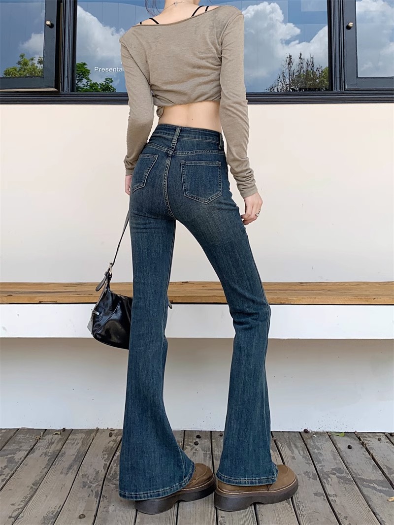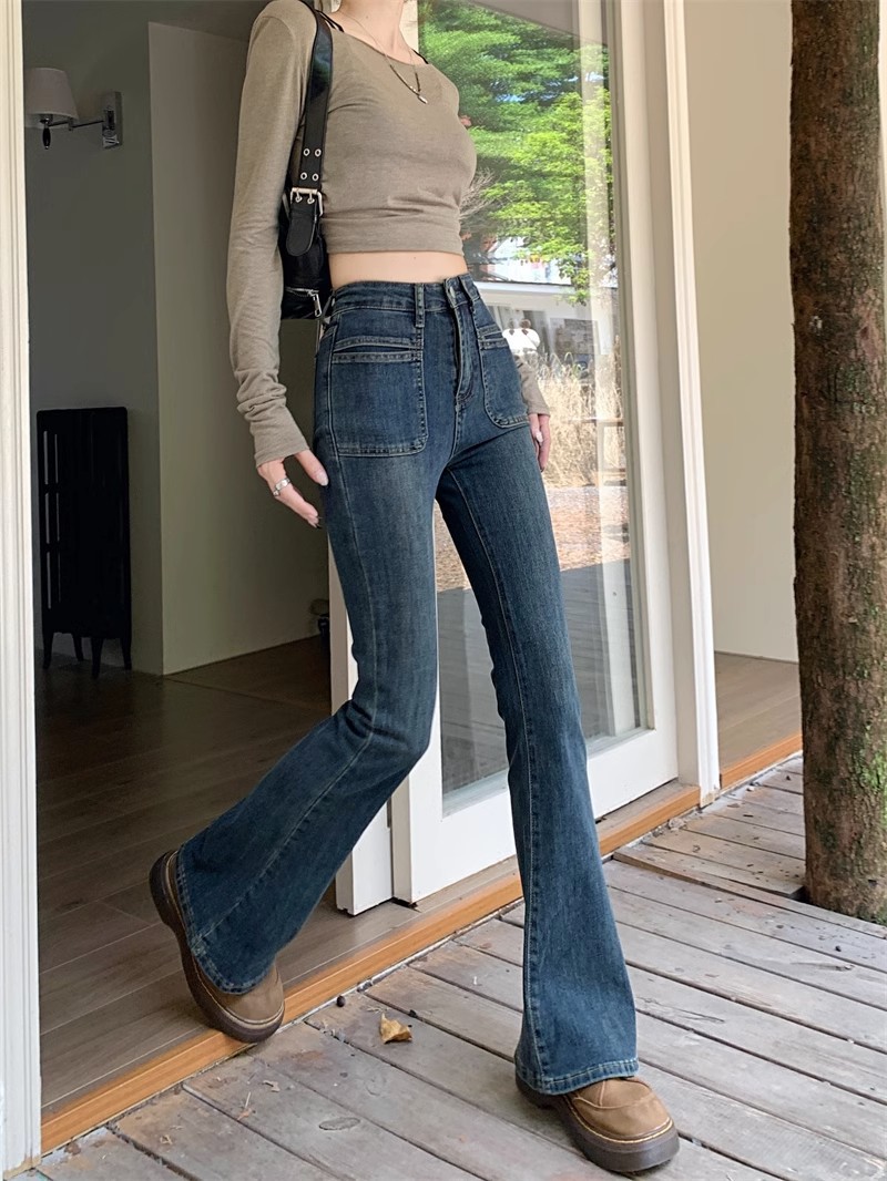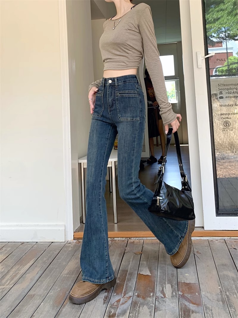 시멘트 회색 높은 허리 스트레치 마이크로 램 청바지 여성의 가을 2023 새로운 한국 스타일 슬림-적합 슬리밍 바닥 바지스토어 가기