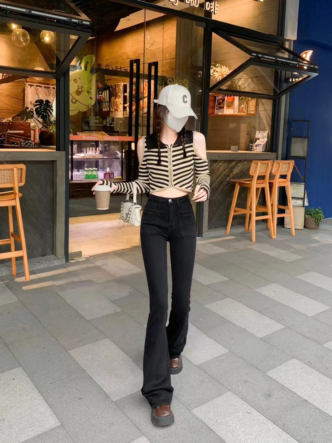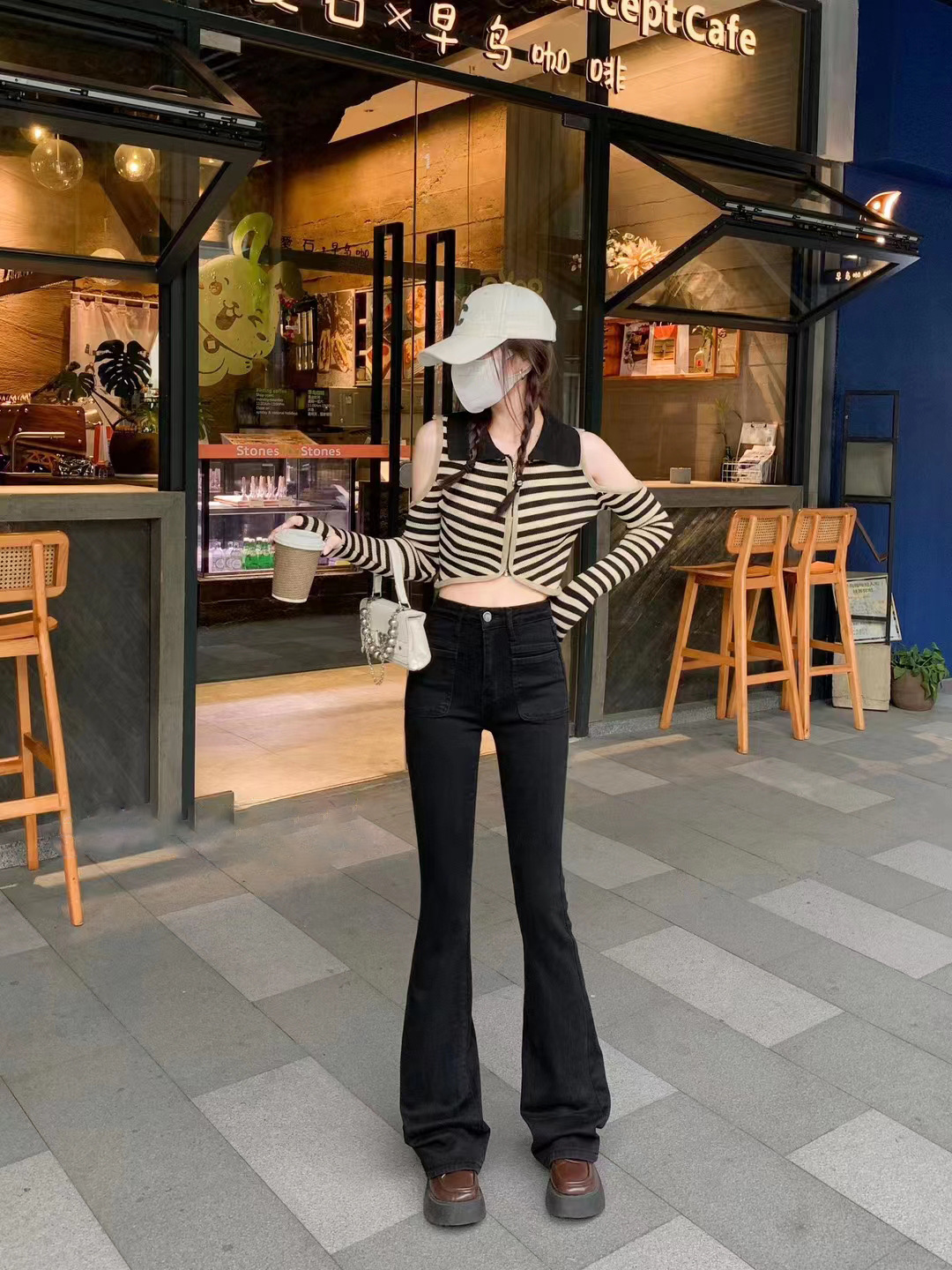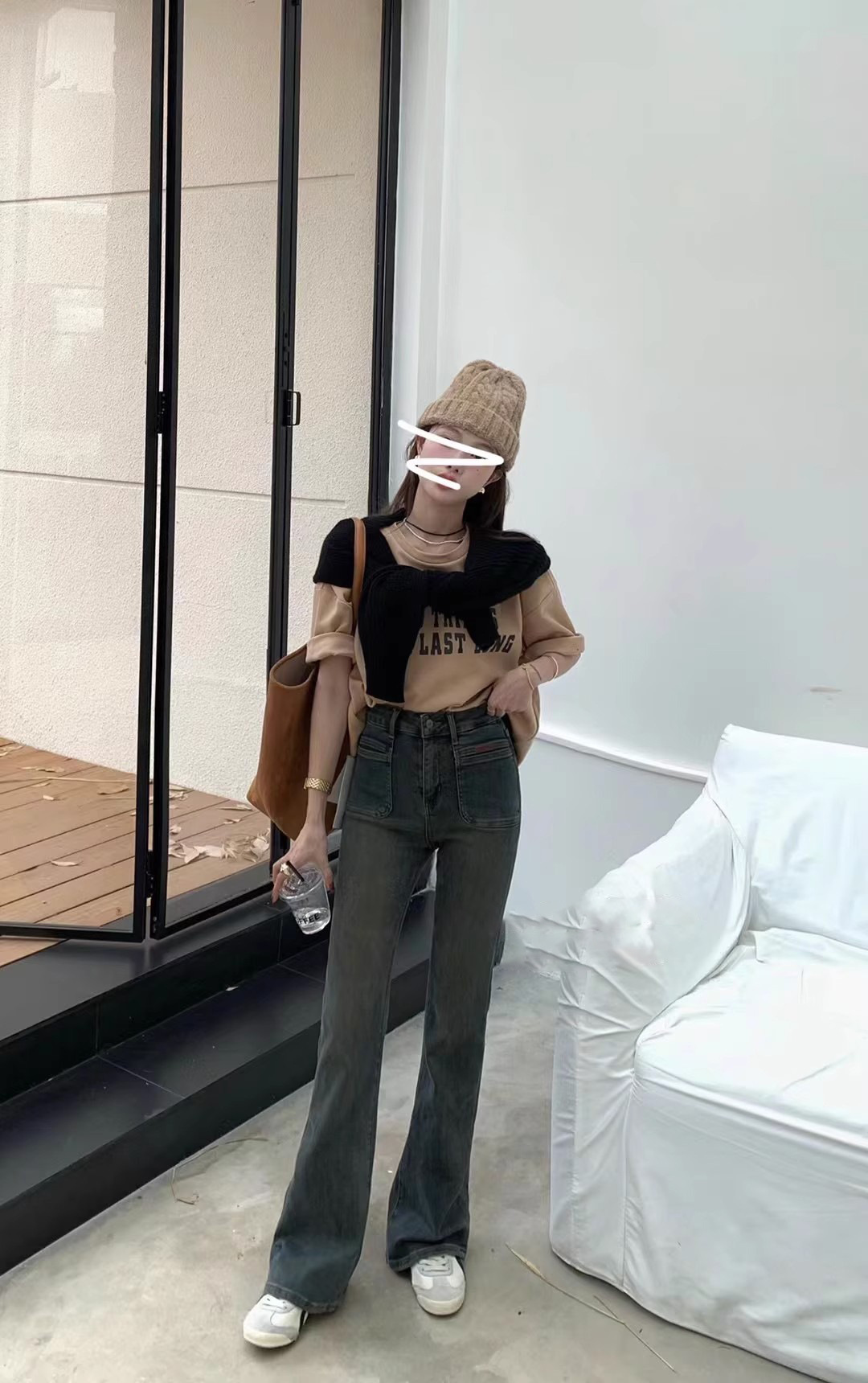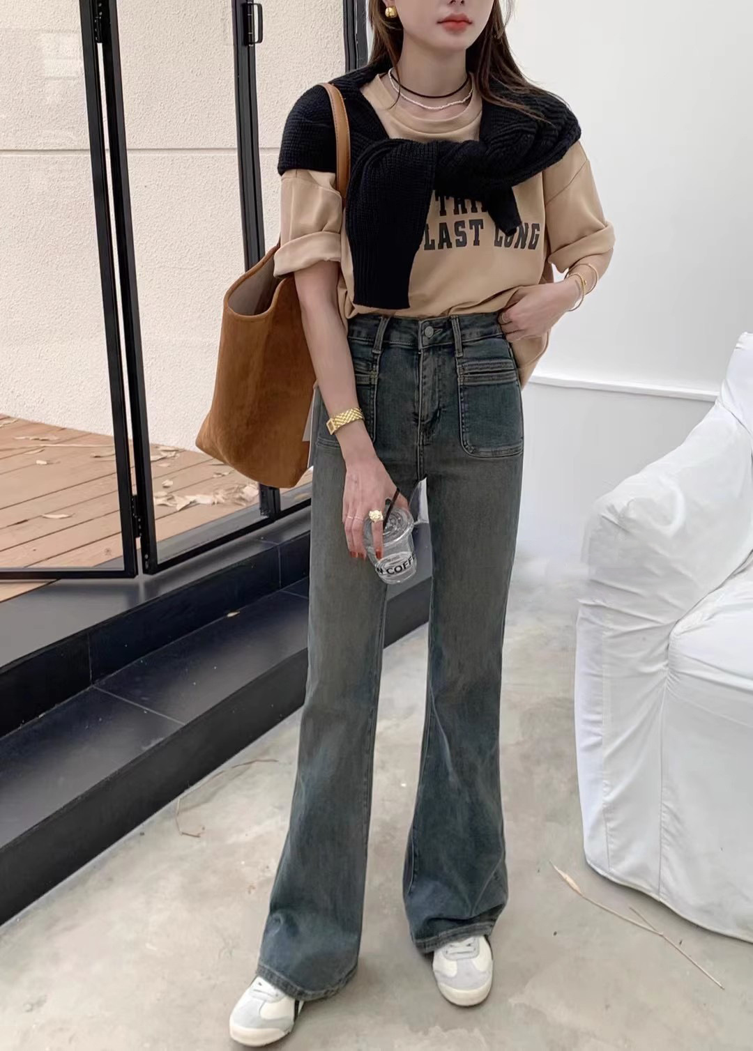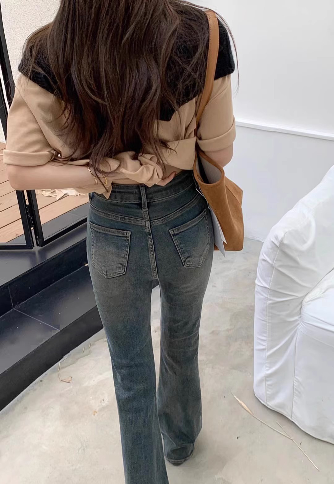 시멘트 회색 높은 허리 스트레치 마이크로 램 청바지 여성의 가을 2023 새로운 한국 스타일 슬림-적합 슬리밍 바닥 바지스토어 가기