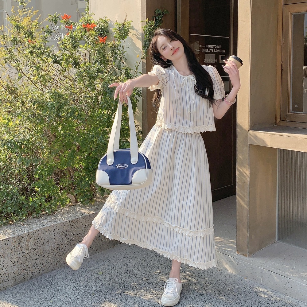 리얼 샷 빈티지 스트라이프 나비 레이스 업 탑 2025 새로운 달콤한 레이스 스티칭 오버 스커트 투피스 세트스토어 가기