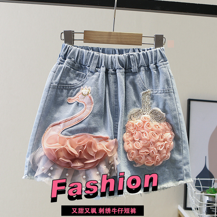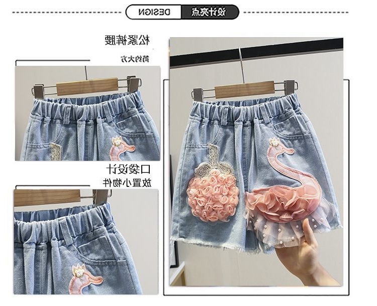 여아 데님 반바지 2021 신작 여름 한국 스타일 백조 스타일 여아 소형, 중형 및 대형 아동용 아우터 바지 유행