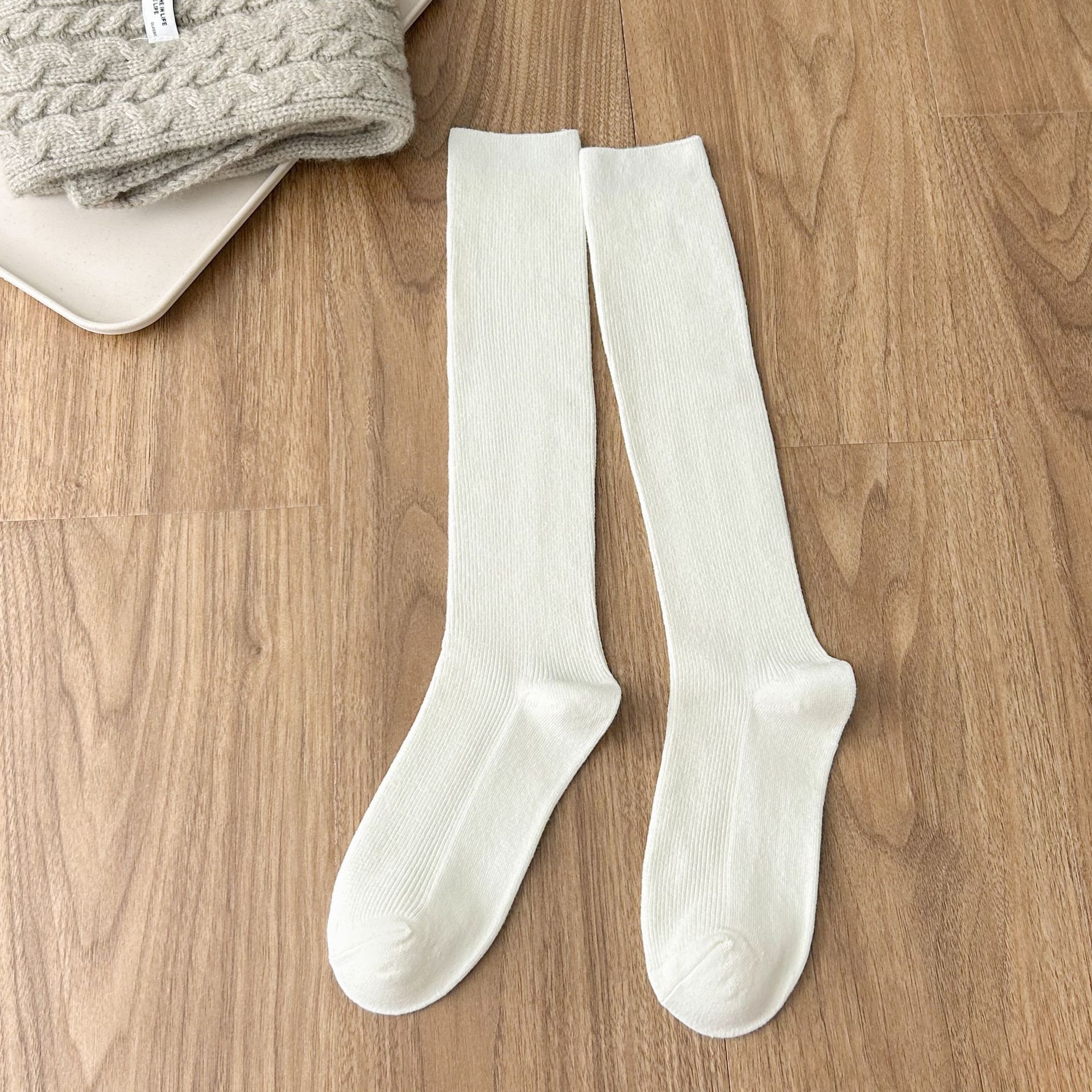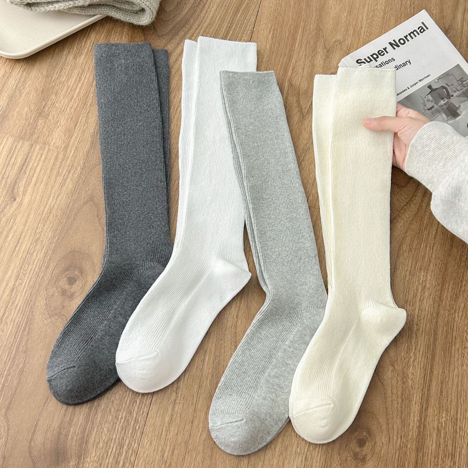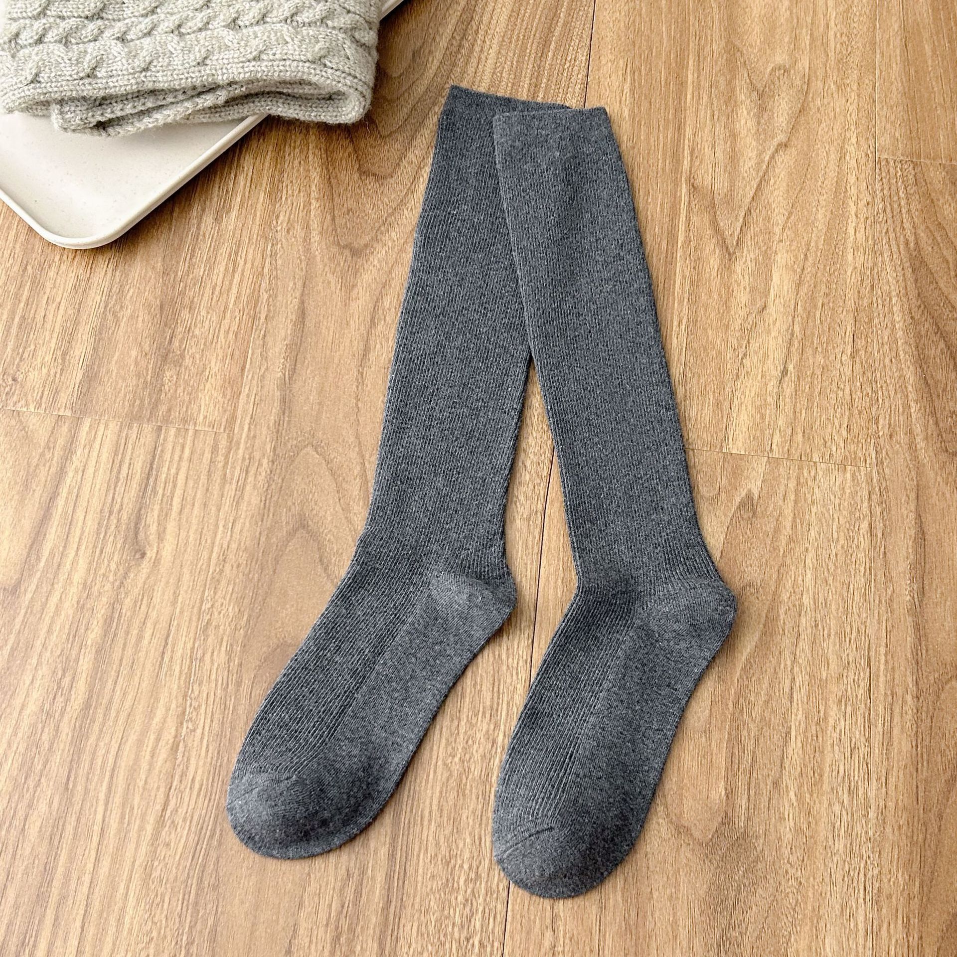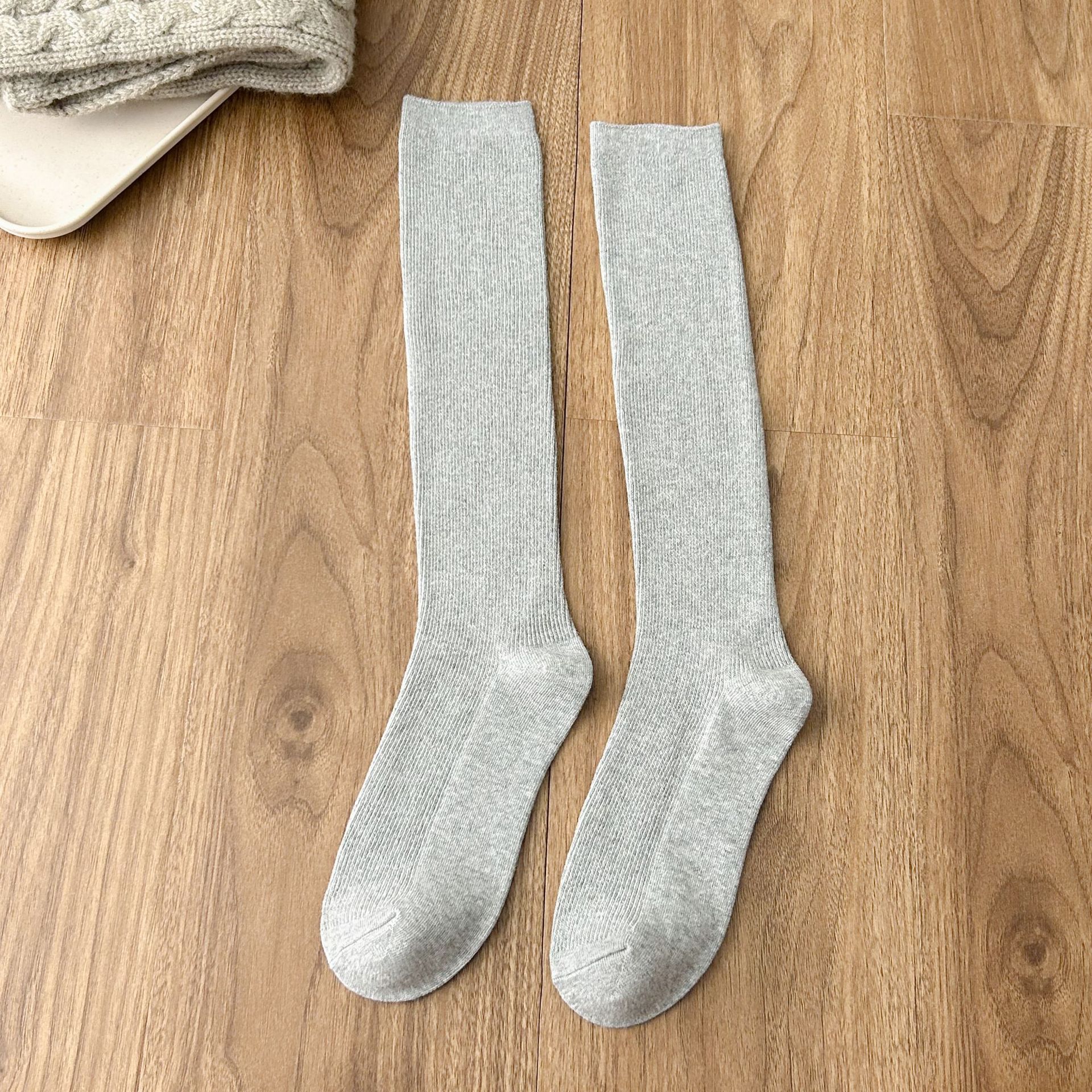 작은 다리 양말 흑백 회색 단색 핀스트라이프 무릎 양말 jk 양말은 양말을 쌓아 올렸습니다. 일본 세로 줄무늬 우유 흰면 양말 얇은