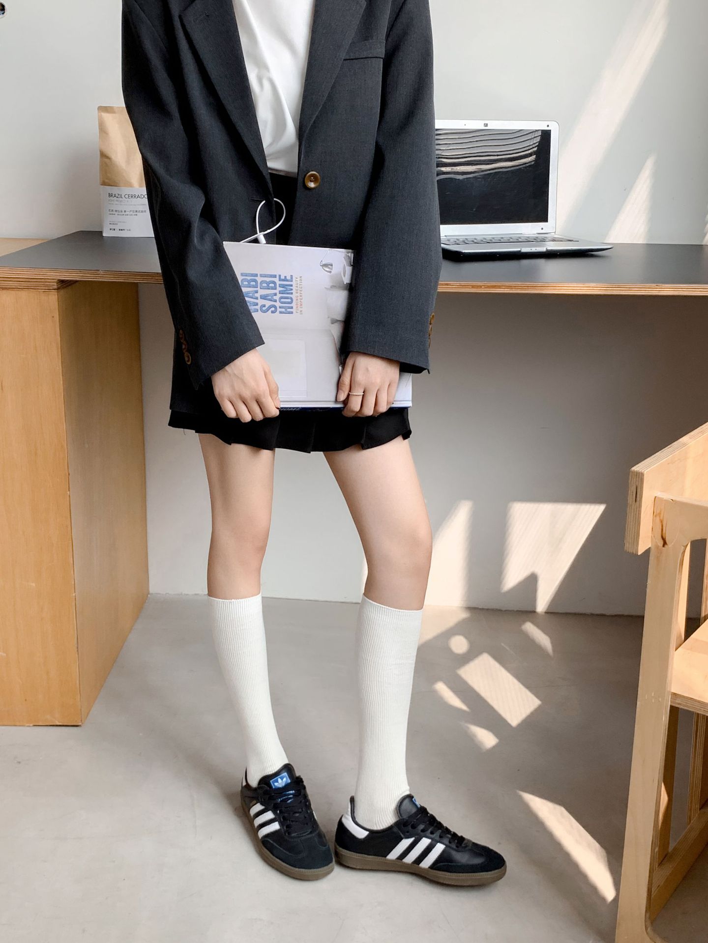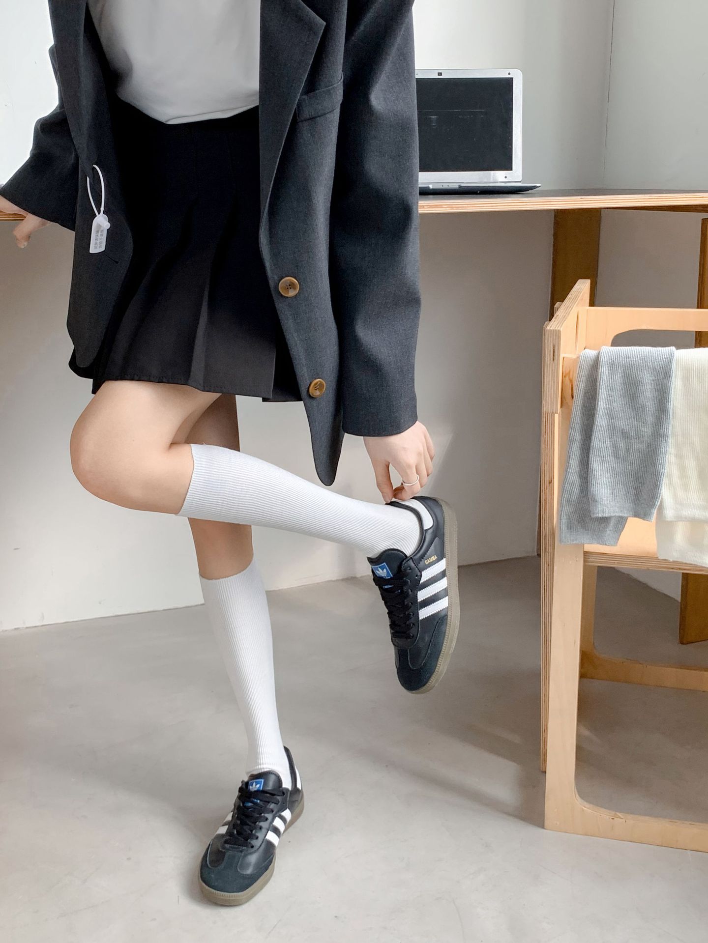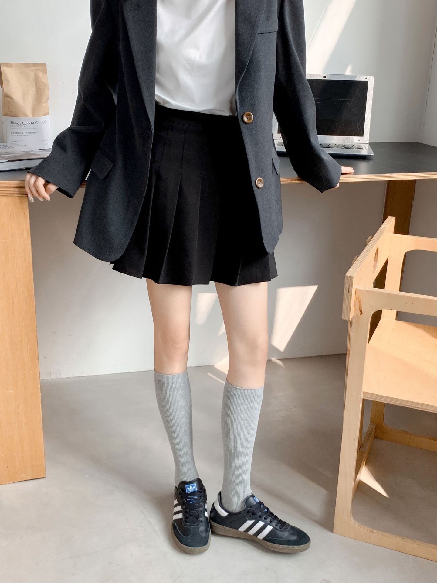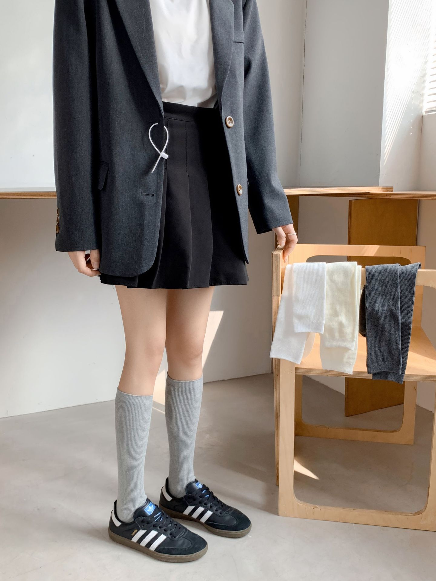 작은 다리 양말 흑백 회색 단색 핀스트라이프 무릎 양말 jk 양말은 양말을 쌓아 올렸습니다. 일본 세로 줄무늬 우유 흰면 양말 얇은