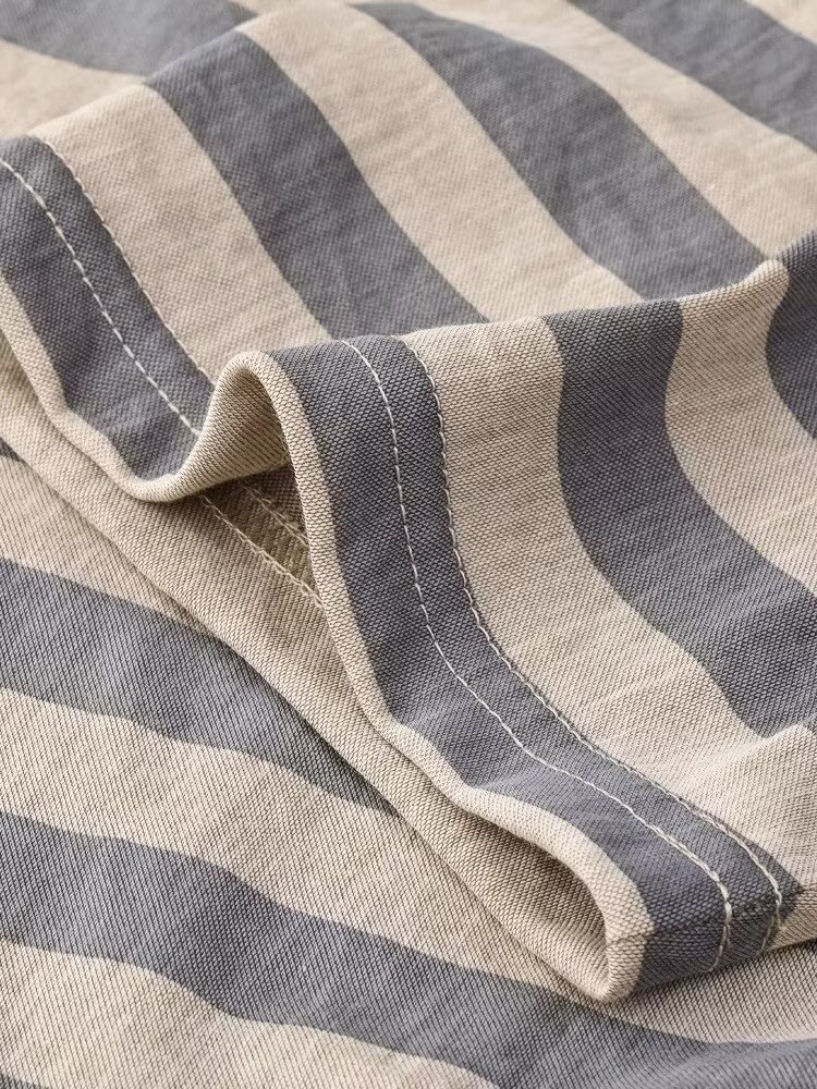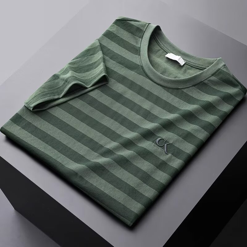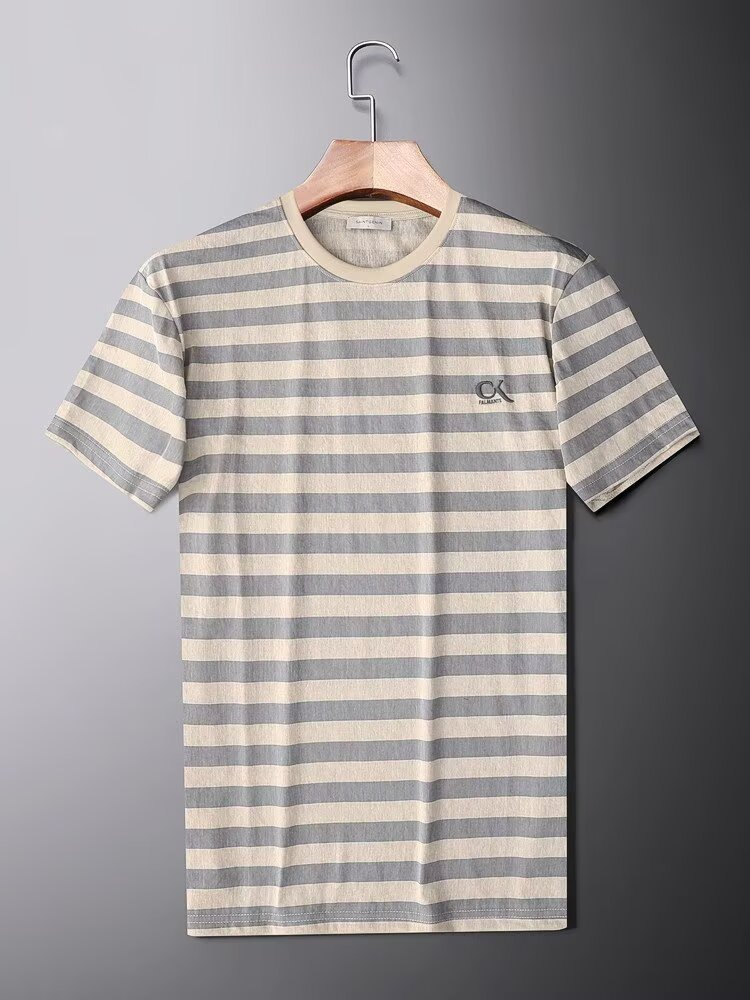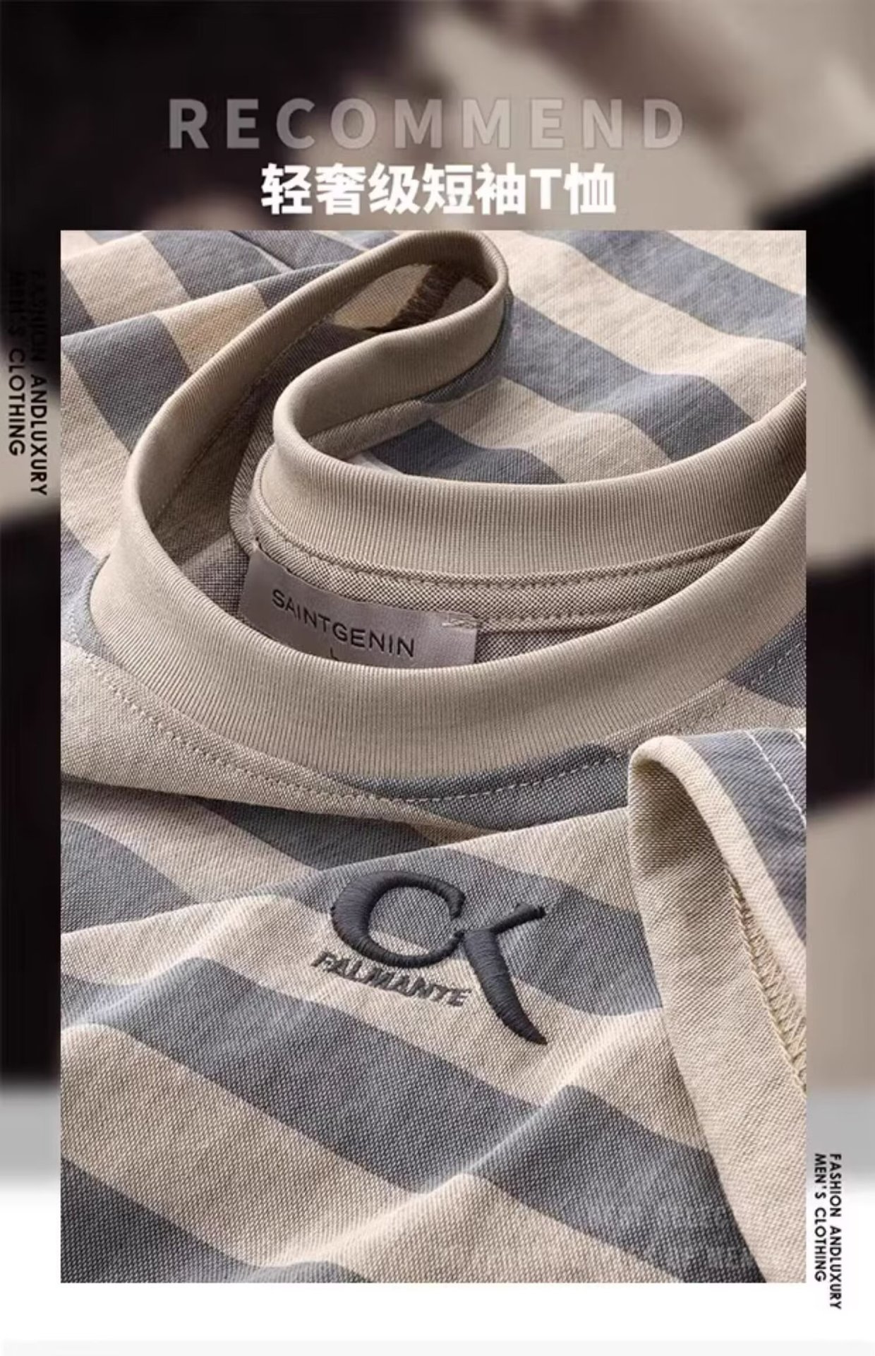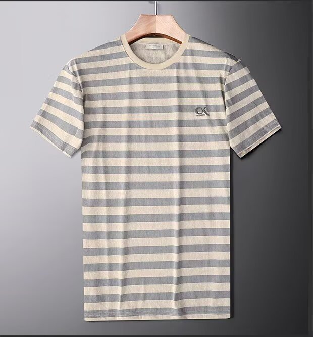 새로운 줄무늬 얼음 실크 모조 린넨 반팔 남성 슬림 여름 얇은 수 놓은 라운드 넥 반팔 티셔츠