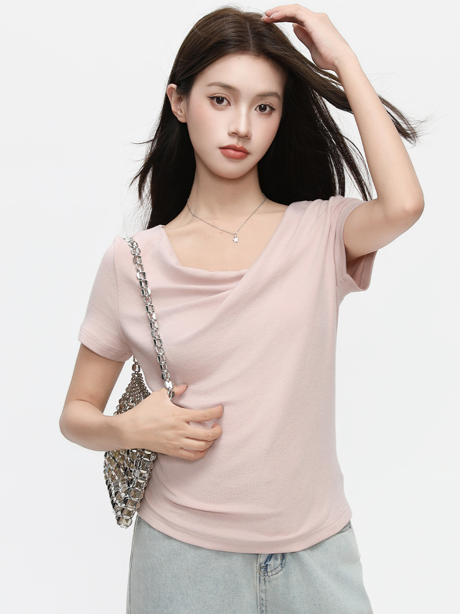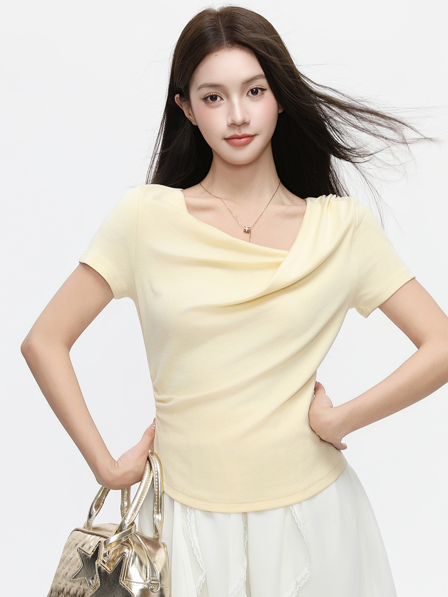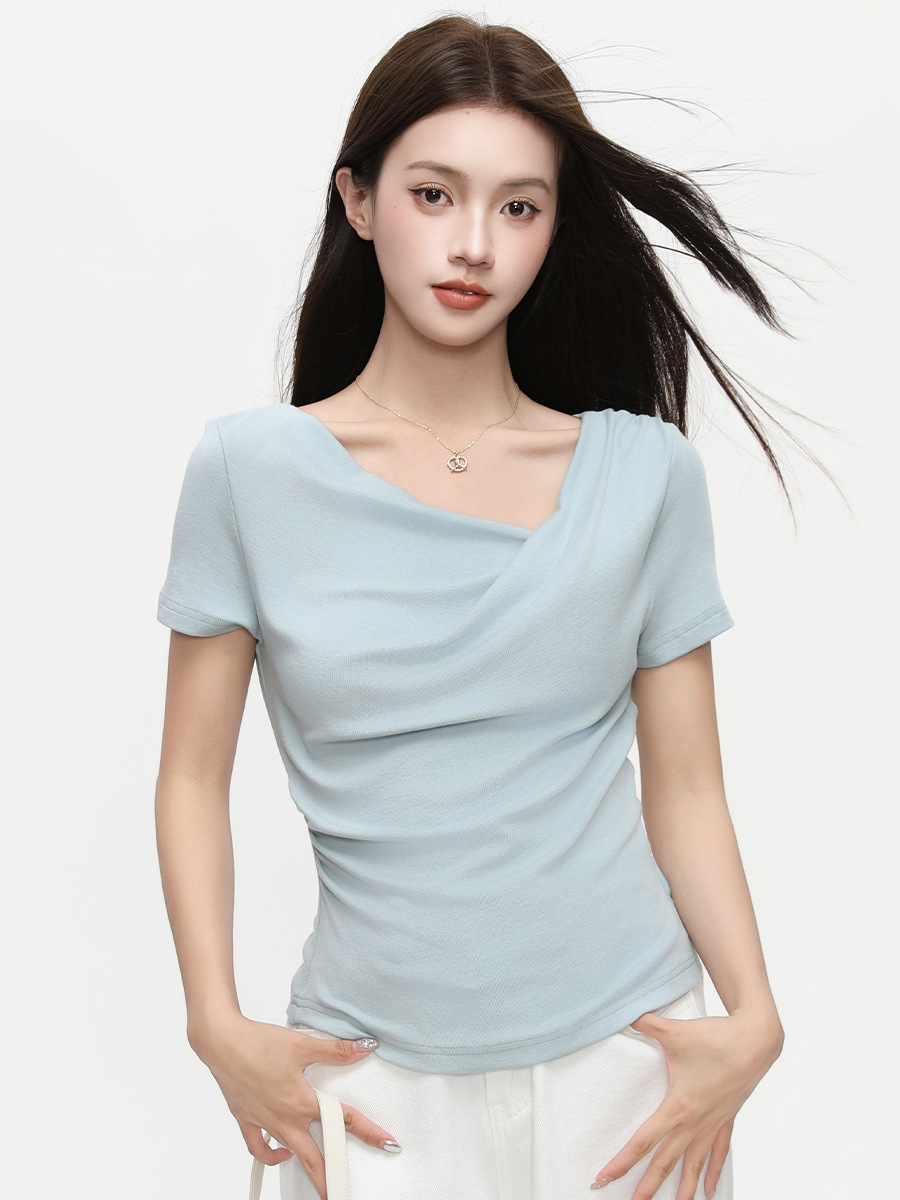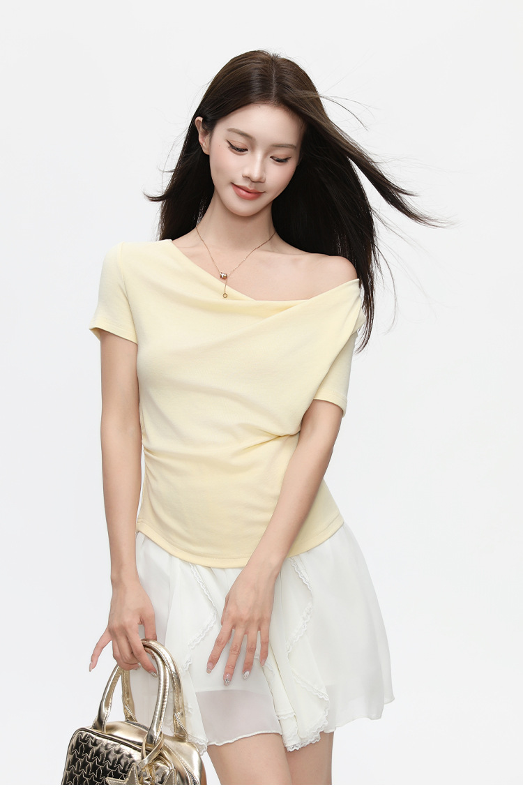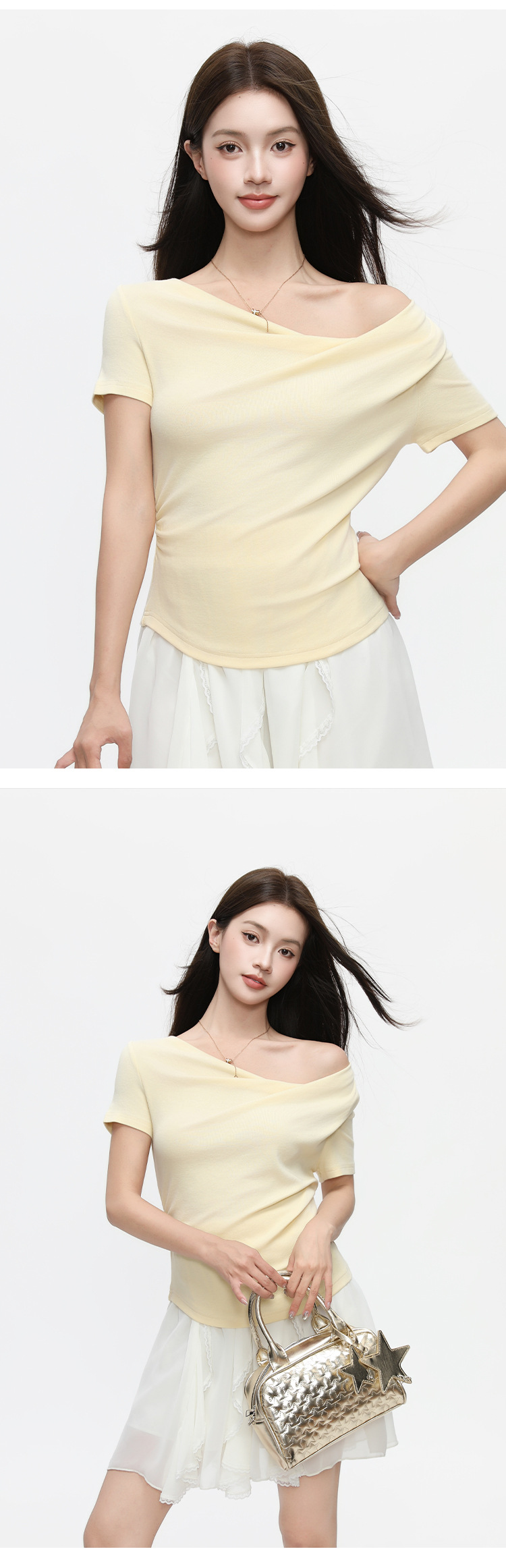 지유 도파민 프렌치 스타일 불규칙한 스윙 칼라 슬랑 어깨 반팔 티셔츠 여성용 여름 하이 엔드 슬림 핏 핫 걸탑