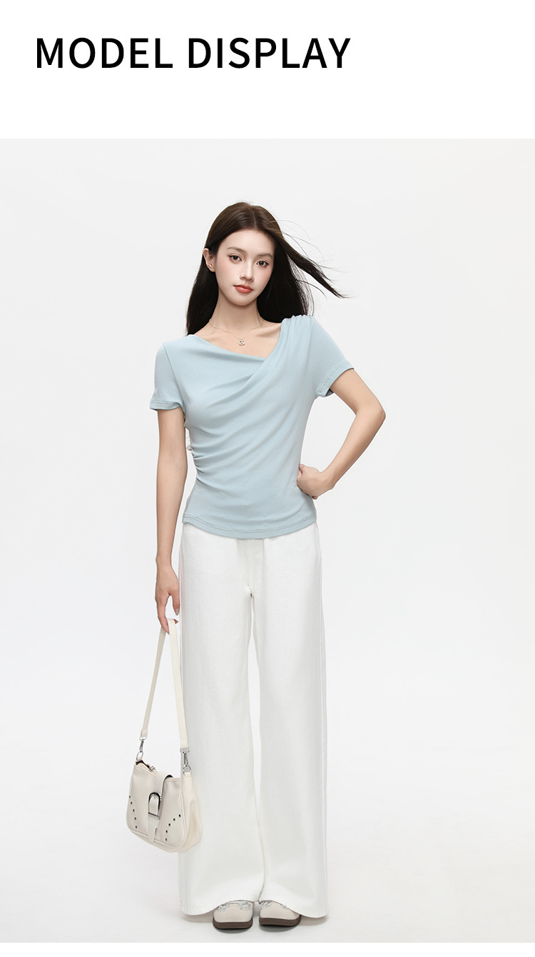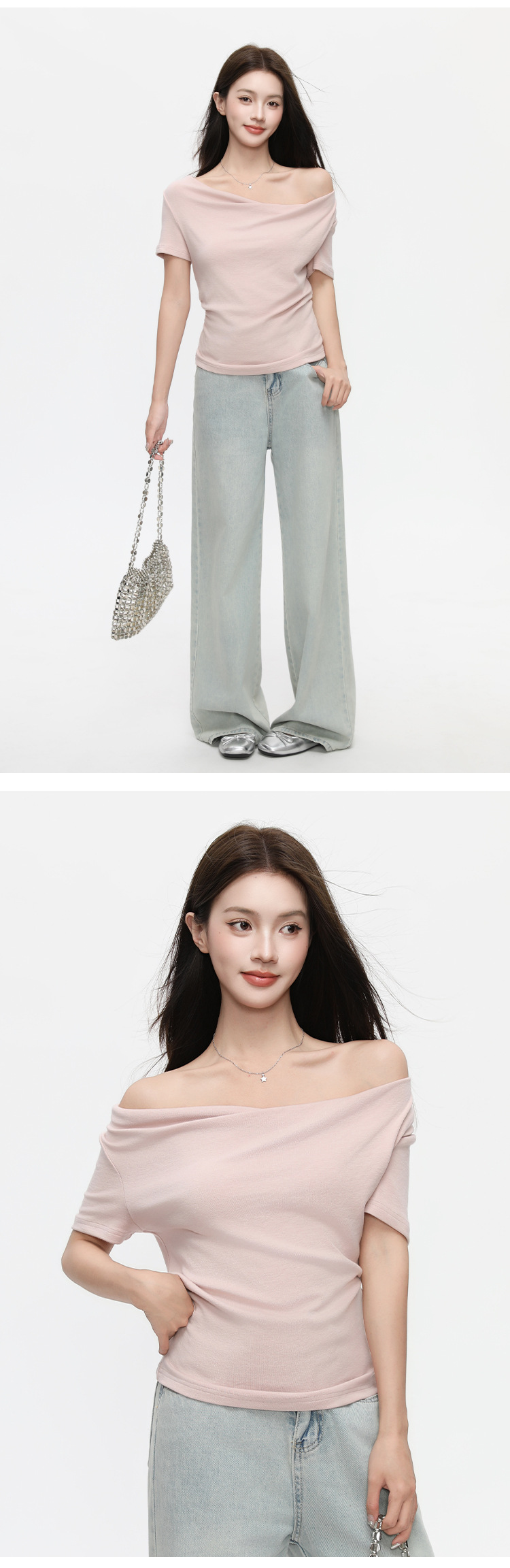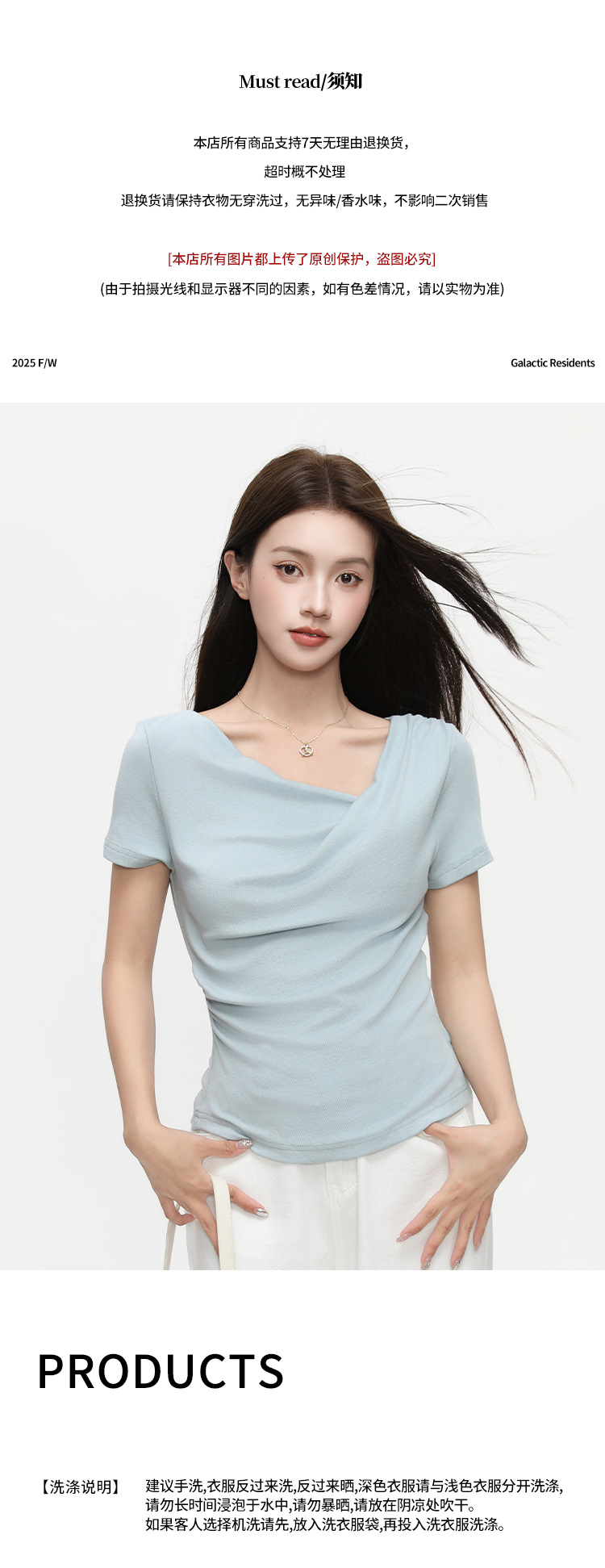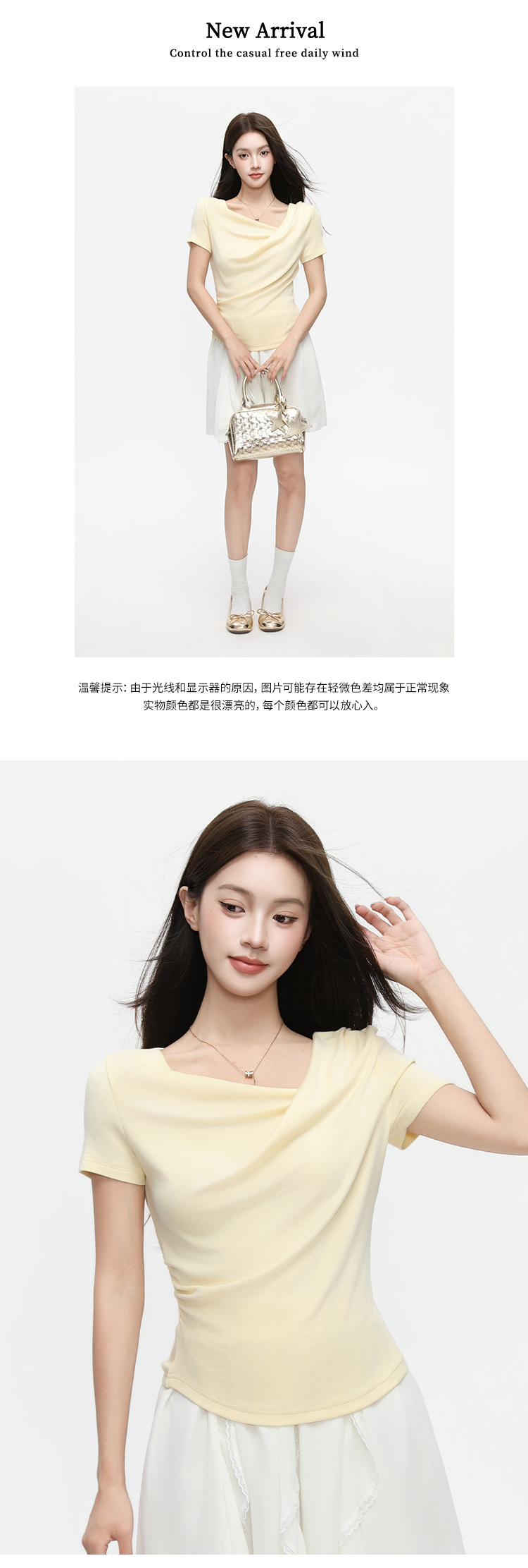 지유 도파민 프렌치 스타일 불규칙한 스윙 칼라 슬랑 어깨 반팔 티셔츠 여성용 여름 하이 엔드 슬림 핏 핫 걸탑