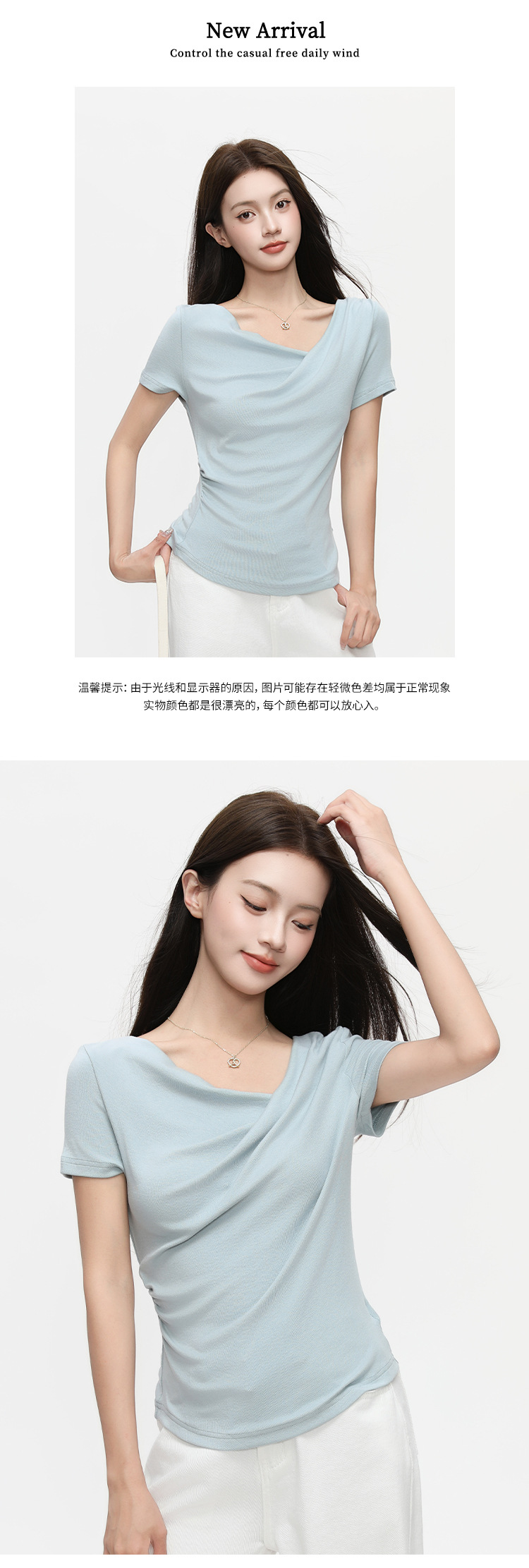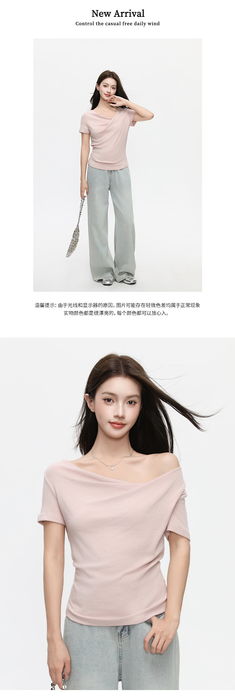 지유 도파민 프렌치 스타일 불규칙한 스윙 칼라 슬랑 어깨 반팔 티셔츠 여성용 여름 하이 엔드 슬림 핏 핫 걸탑스토어 가기