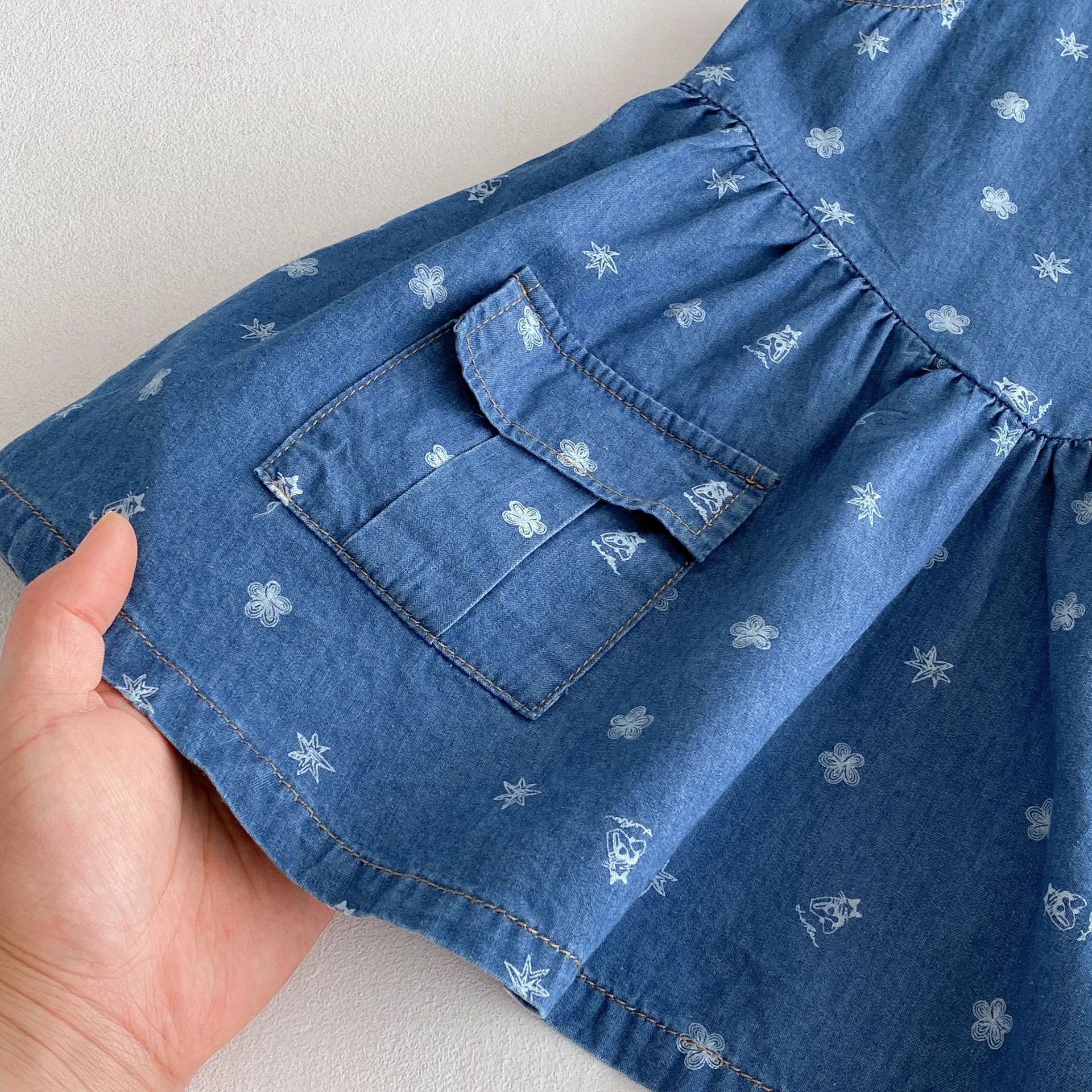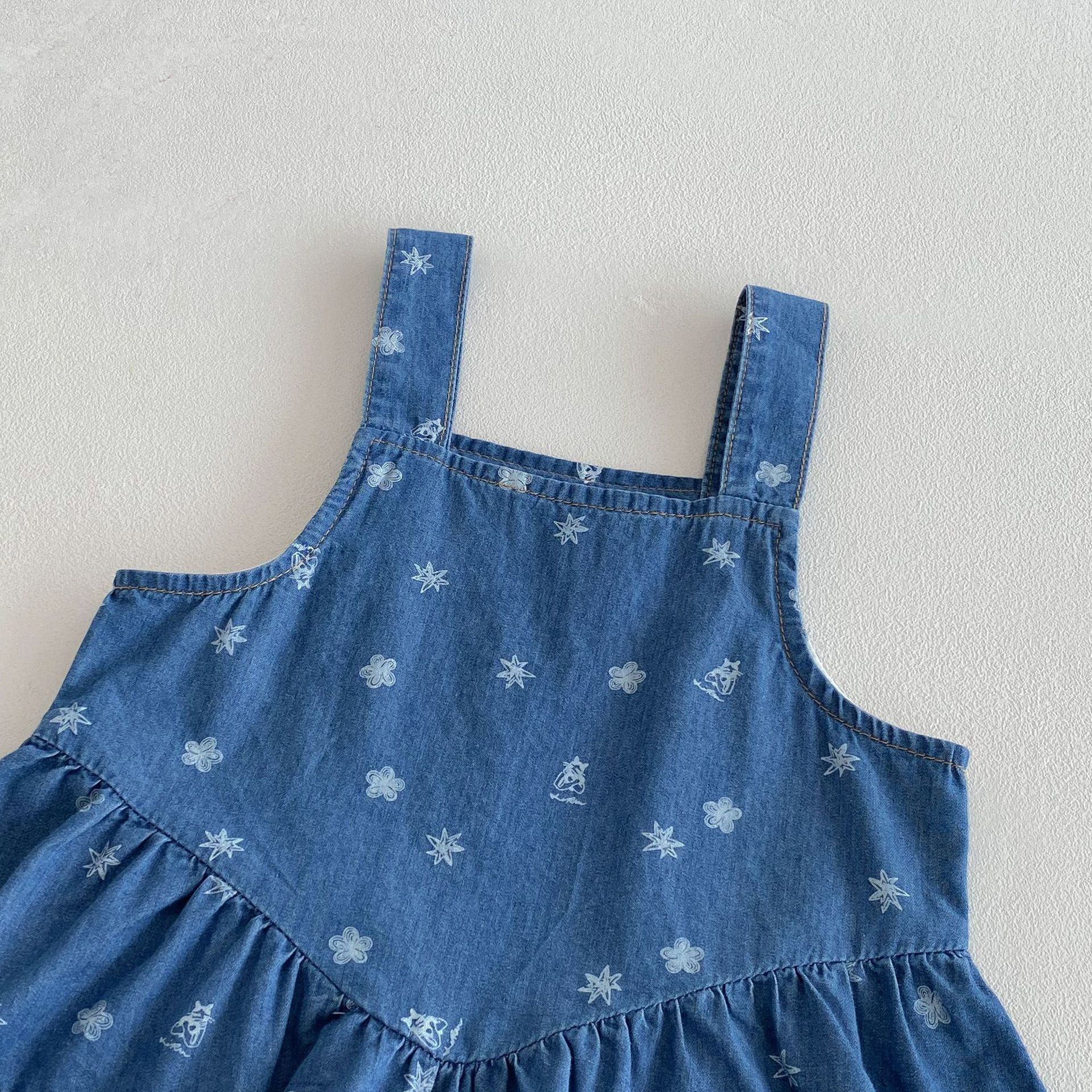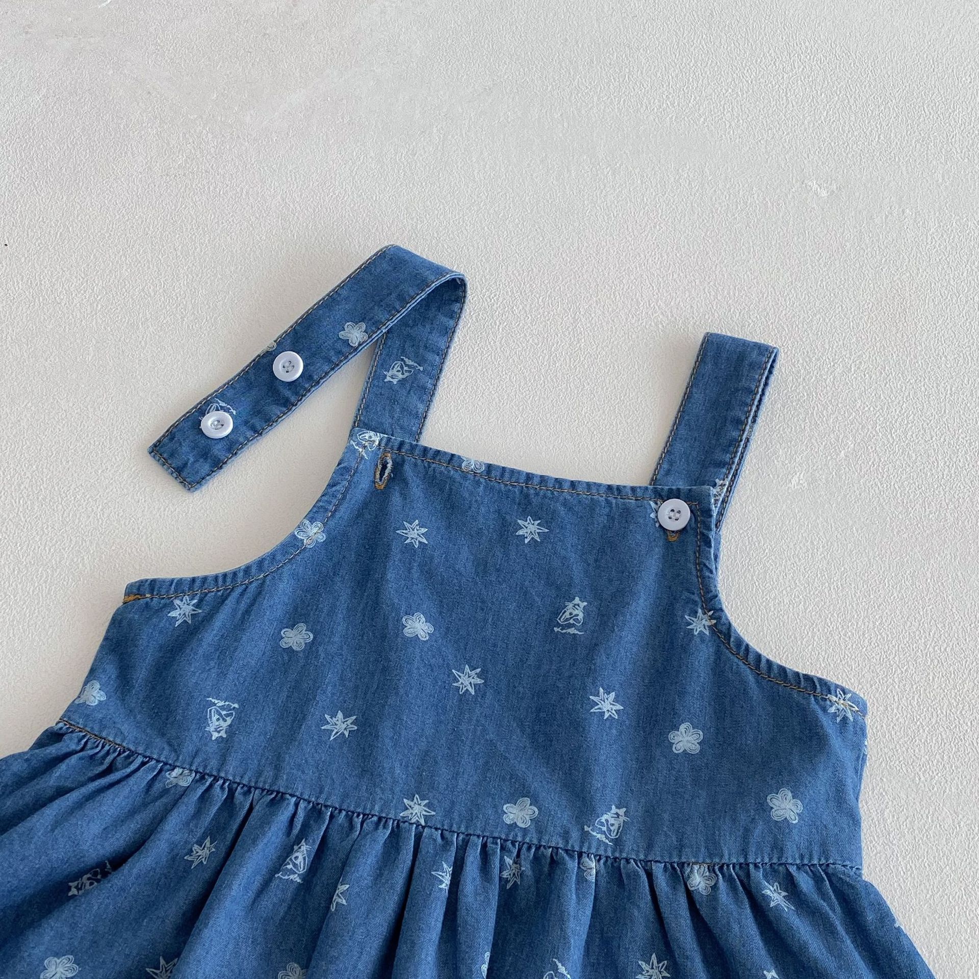 여자 데님 치마 중소 어린이 2025 년 여름 얇은 면 꽃 빈티지 대형 포켓 슬립 스커트 아기 소녀 서스펜더 스커트