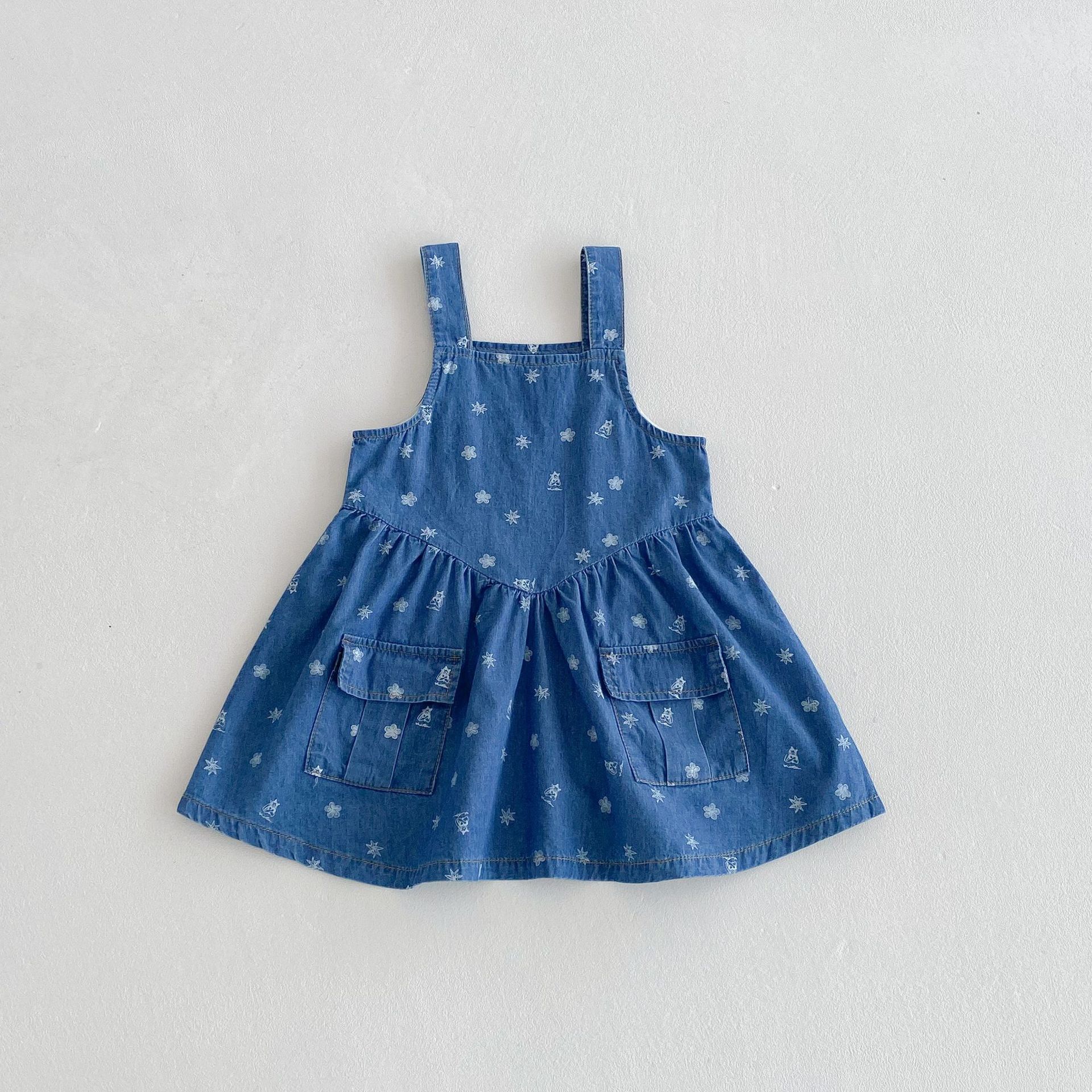 여자 데님 치마 중소 어린이 2025 년 여름 얇은 면 꽃 빈티지 대형 포켓 슬립 스커트 아기 소녀 서스펜더 스커트스토어 가기