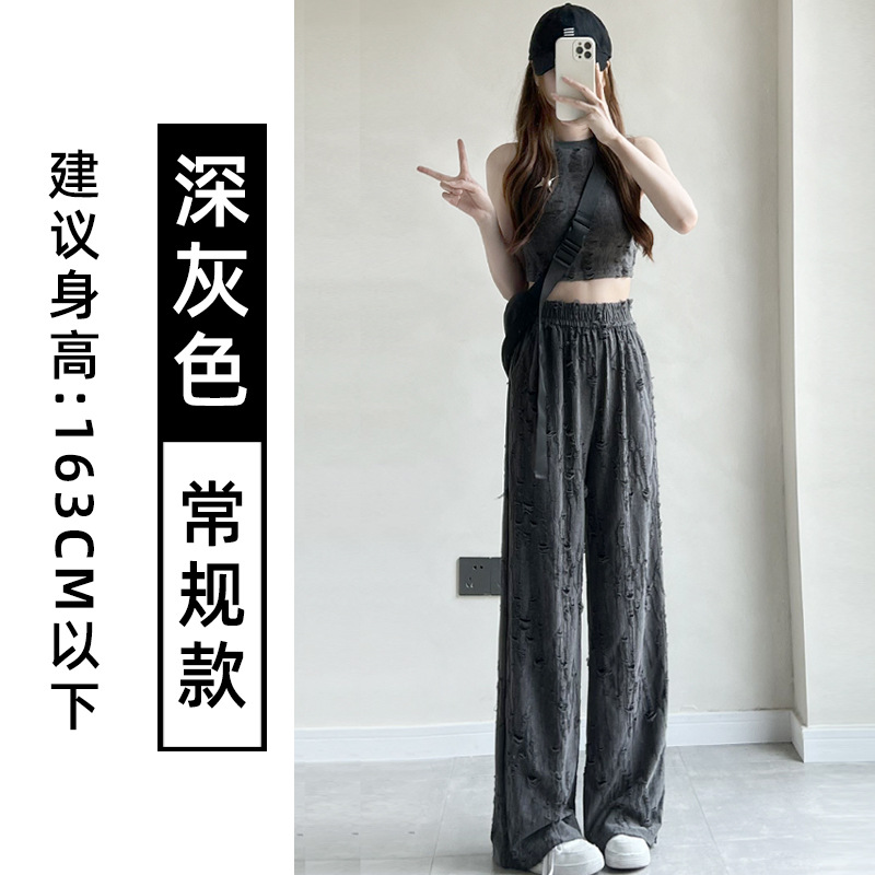 회색 다진 바지 여성 여름 얇은 높은 허리 Daggy 틈새 디자인 스트레이트 튜브 넓은 다리 바지 작은 사람