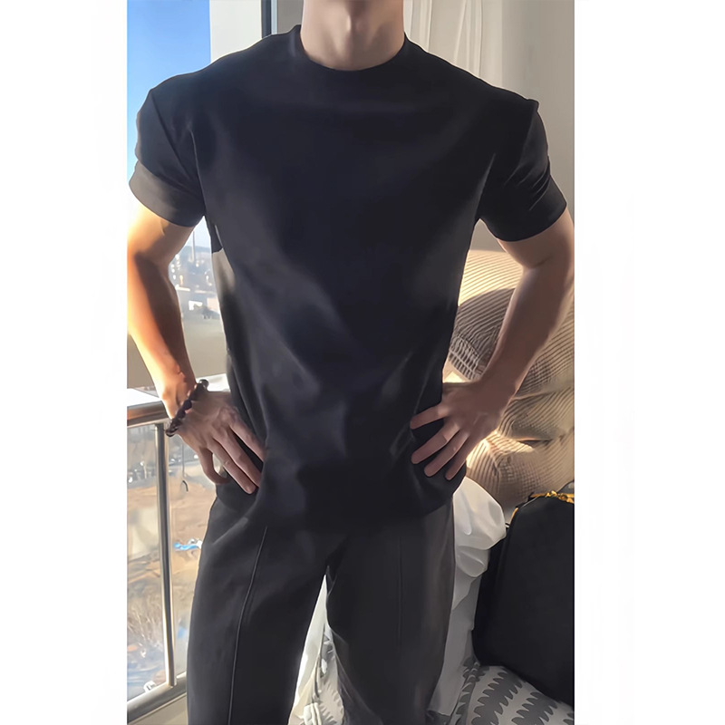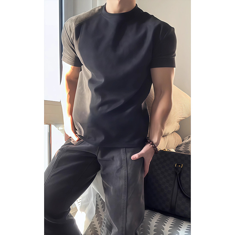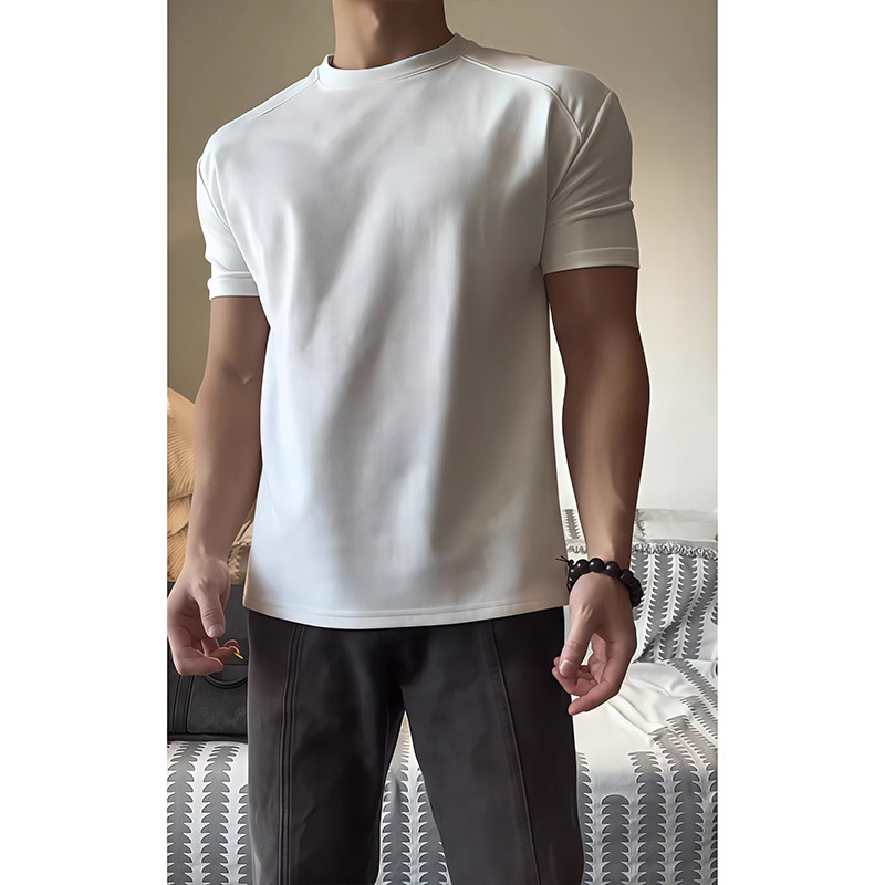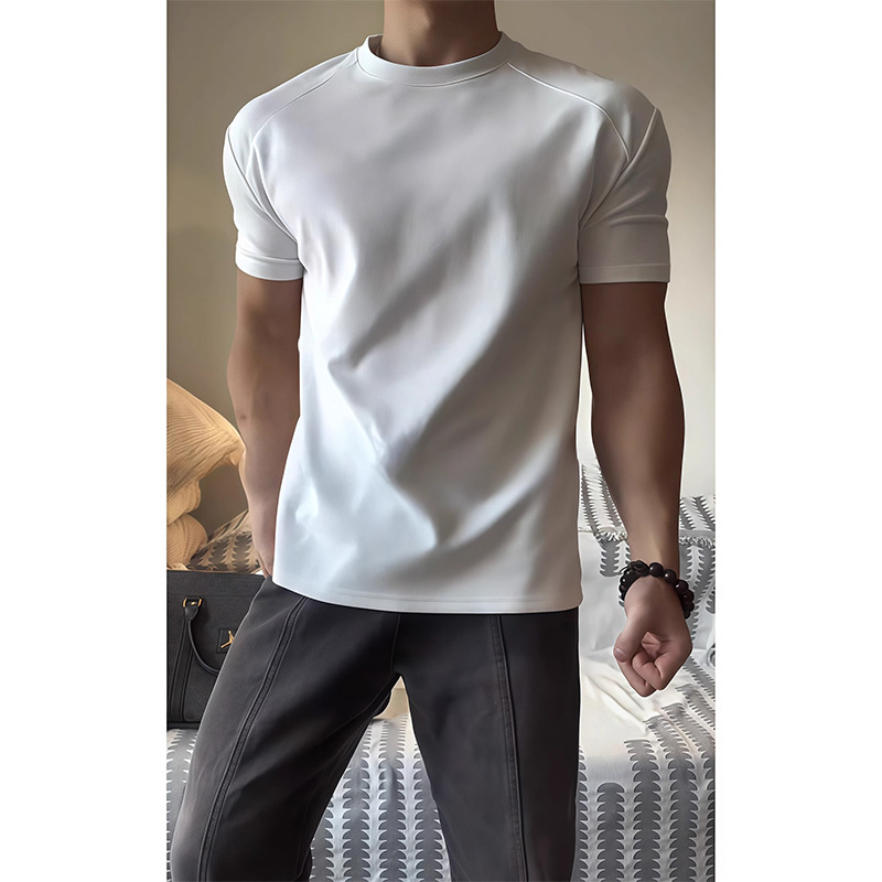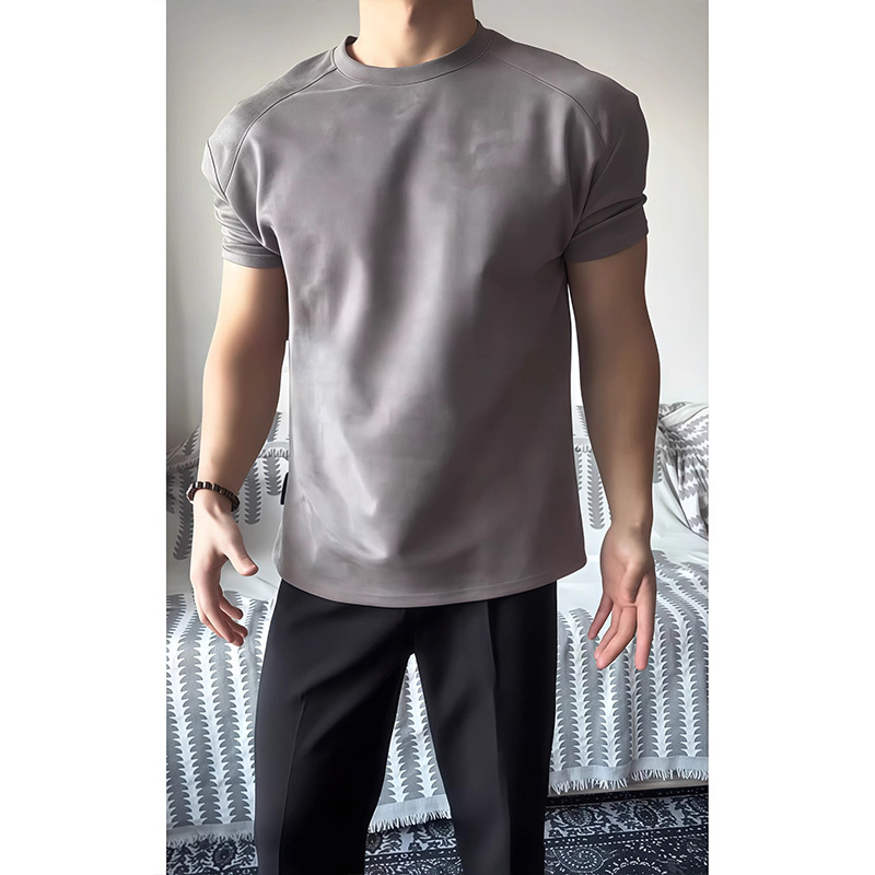 美式显肩宽收袖口T恤男垫肩小领口短袖灰色重磅打底健身三分半袖
