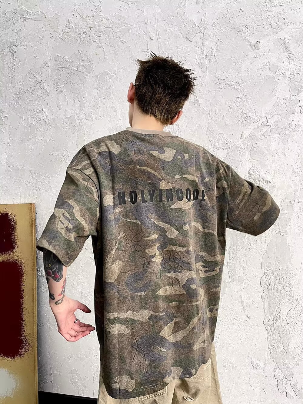 아메리칸 레트로 카모 프린트 반팔 티셔츠 남성 여름 루즈 캐주얼 스트리트 트렌드 인 라운드 넥 반팔 탑