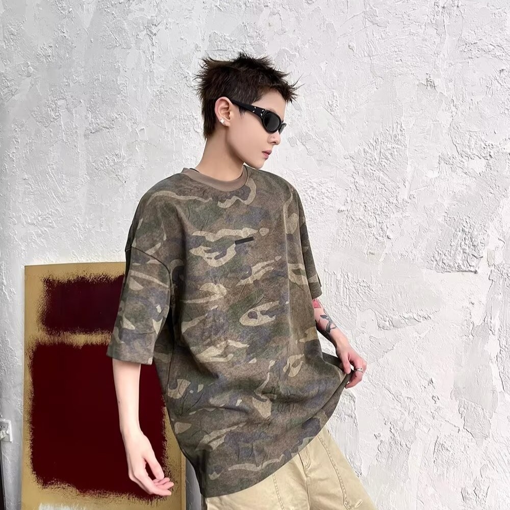아메리칸 레트로 카모 프린트 반팔 티셔츠 남성 여름 루즈 캐주얼 스트리트 트렌드 인 라운드 넥 반팔 탑스토어 가기