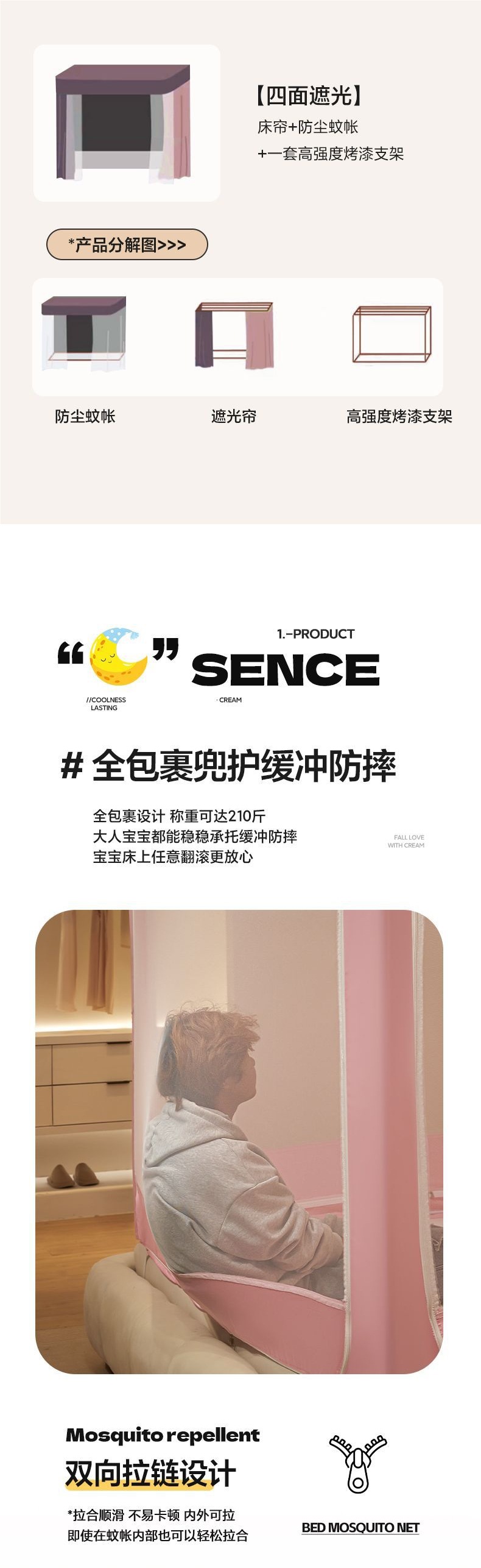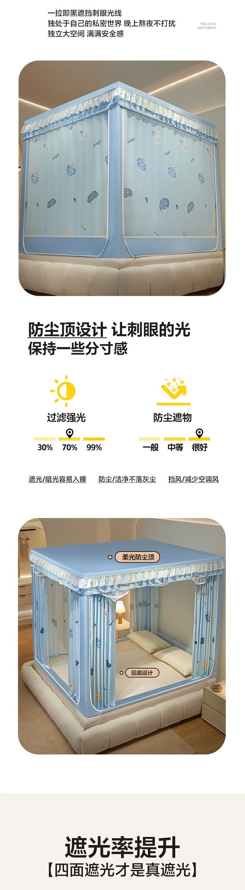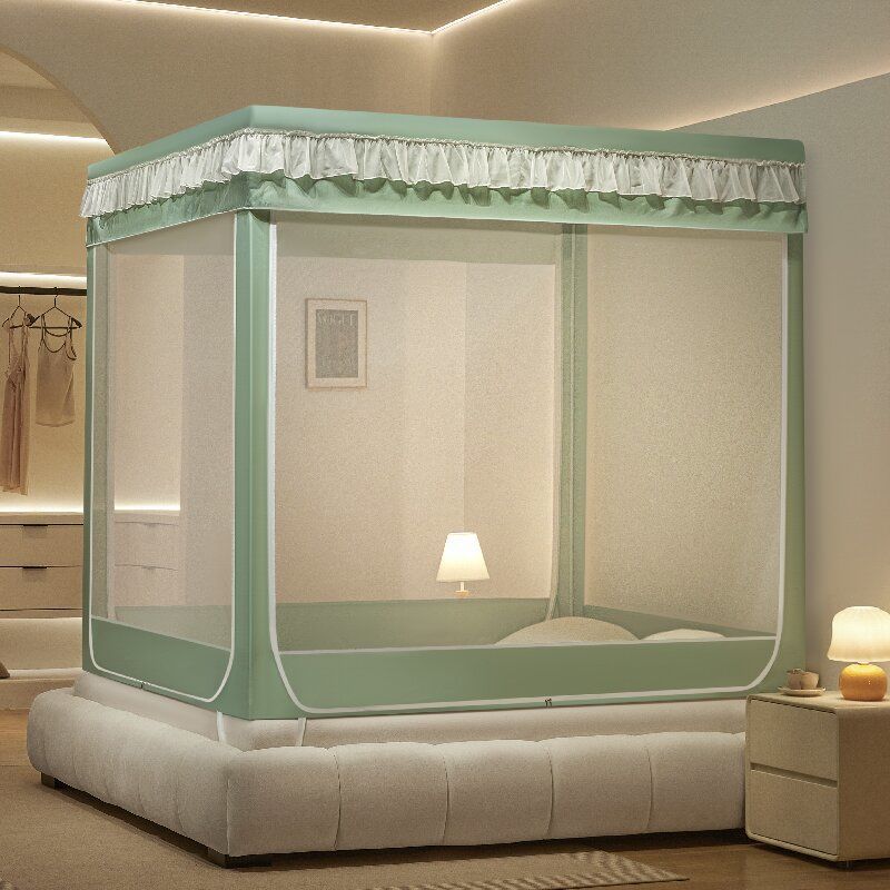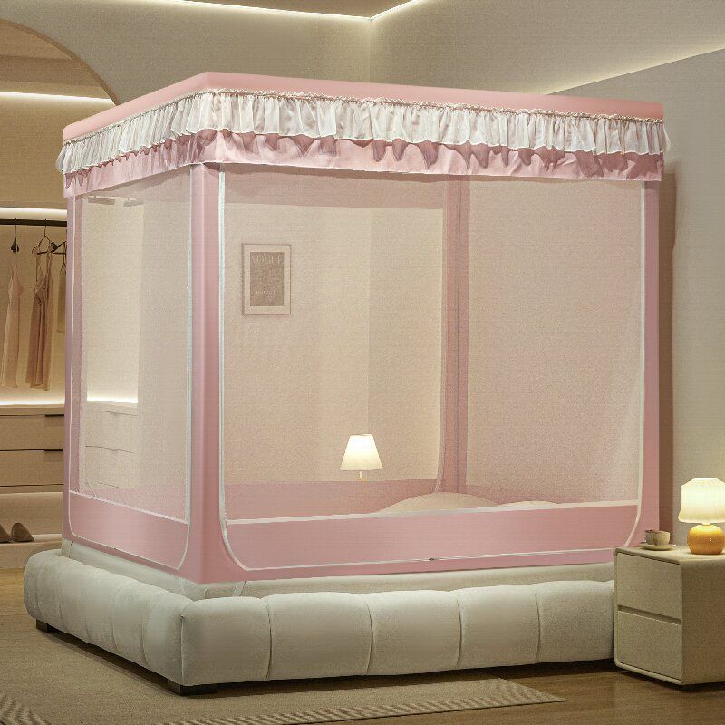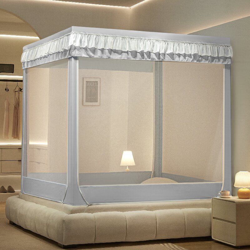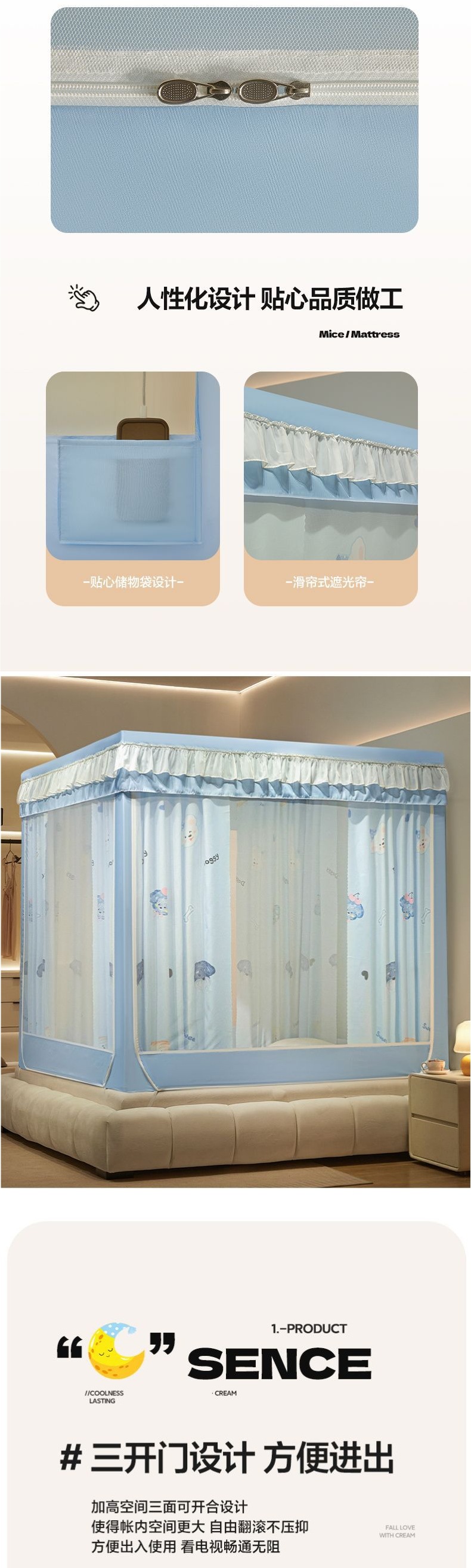 침대커튼, 차광, 방진, 모기장, 일체형 가정용 낙하방지 침대커튼, 하단, 침대, 3도어 지퍼 접이식 모기장