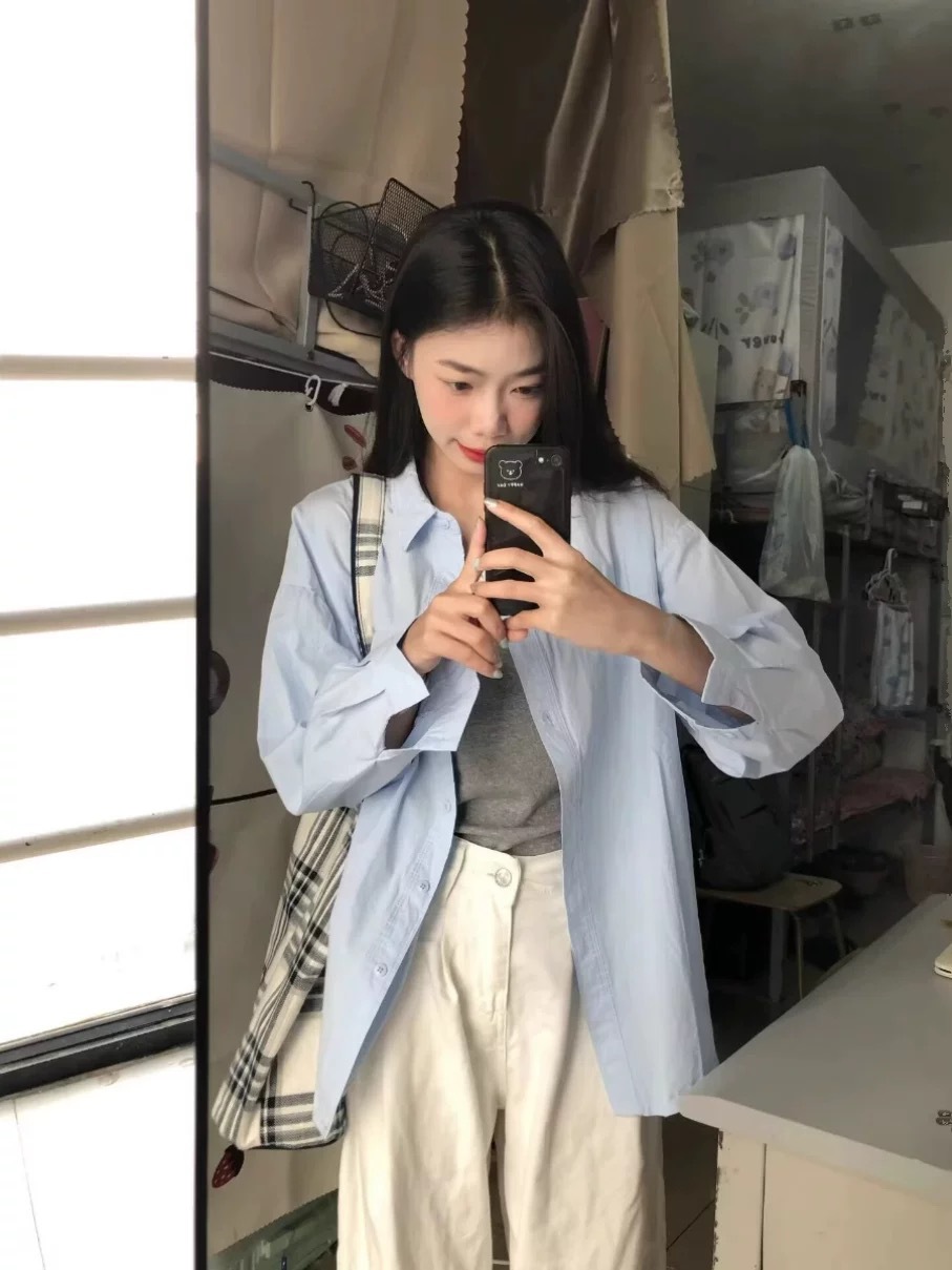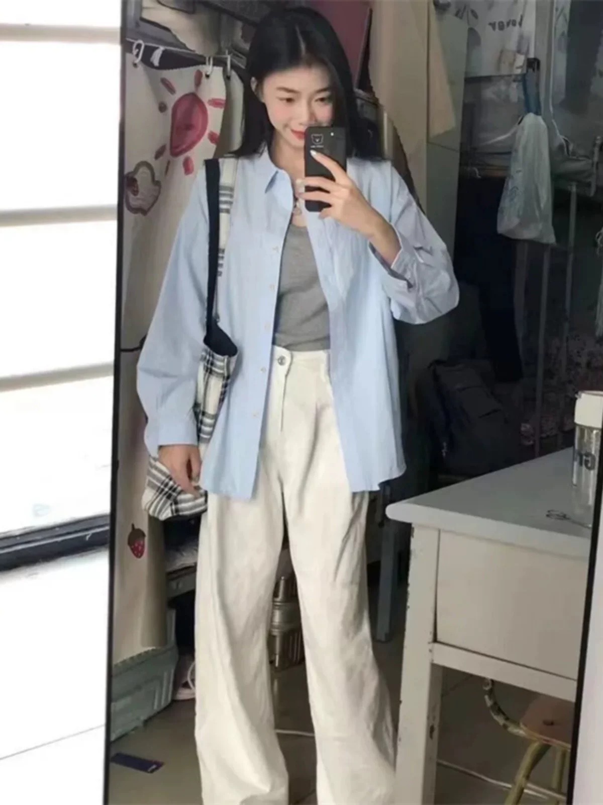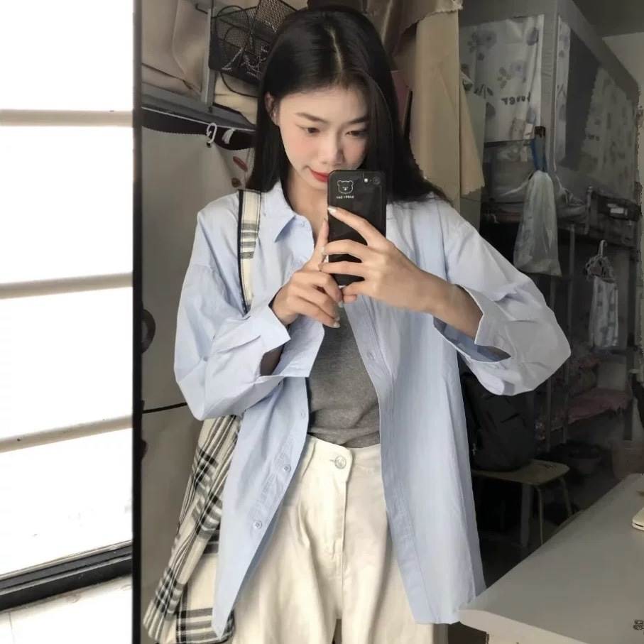 한국식 블루 얇은 선스크린 셔츠 여자 봄 · 여름 느슨한 게으른 스타일 탑 폴로 칼라 올매치 긴소매 셔츠스토어 가기