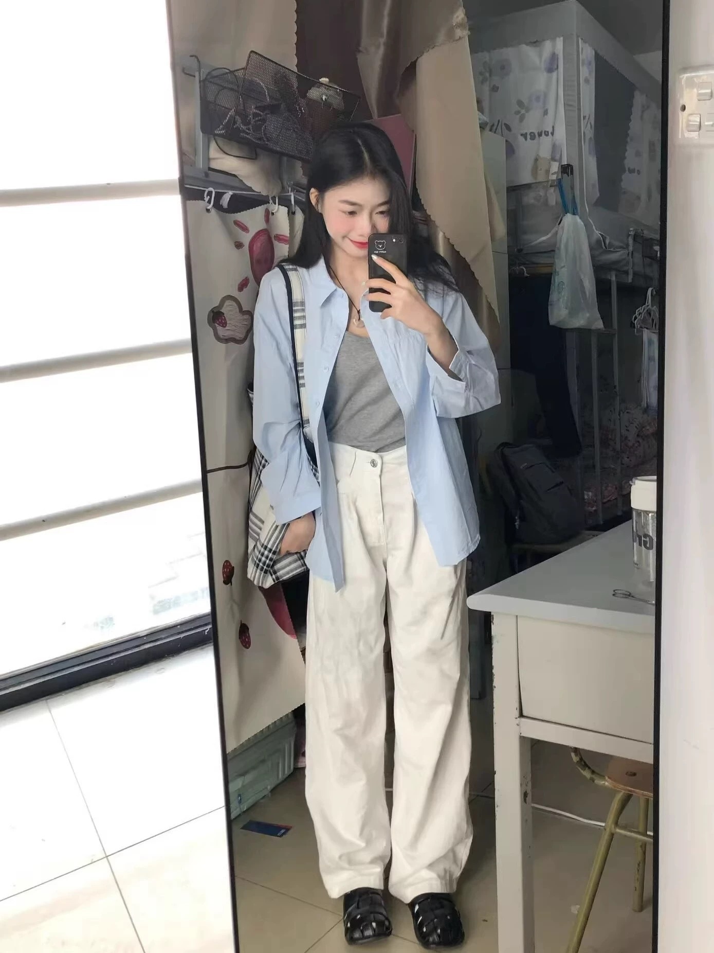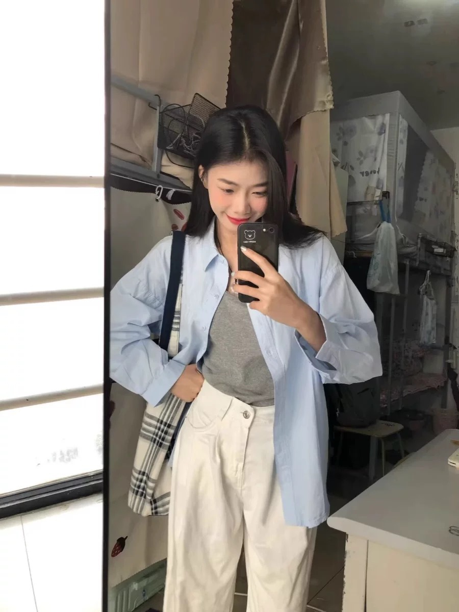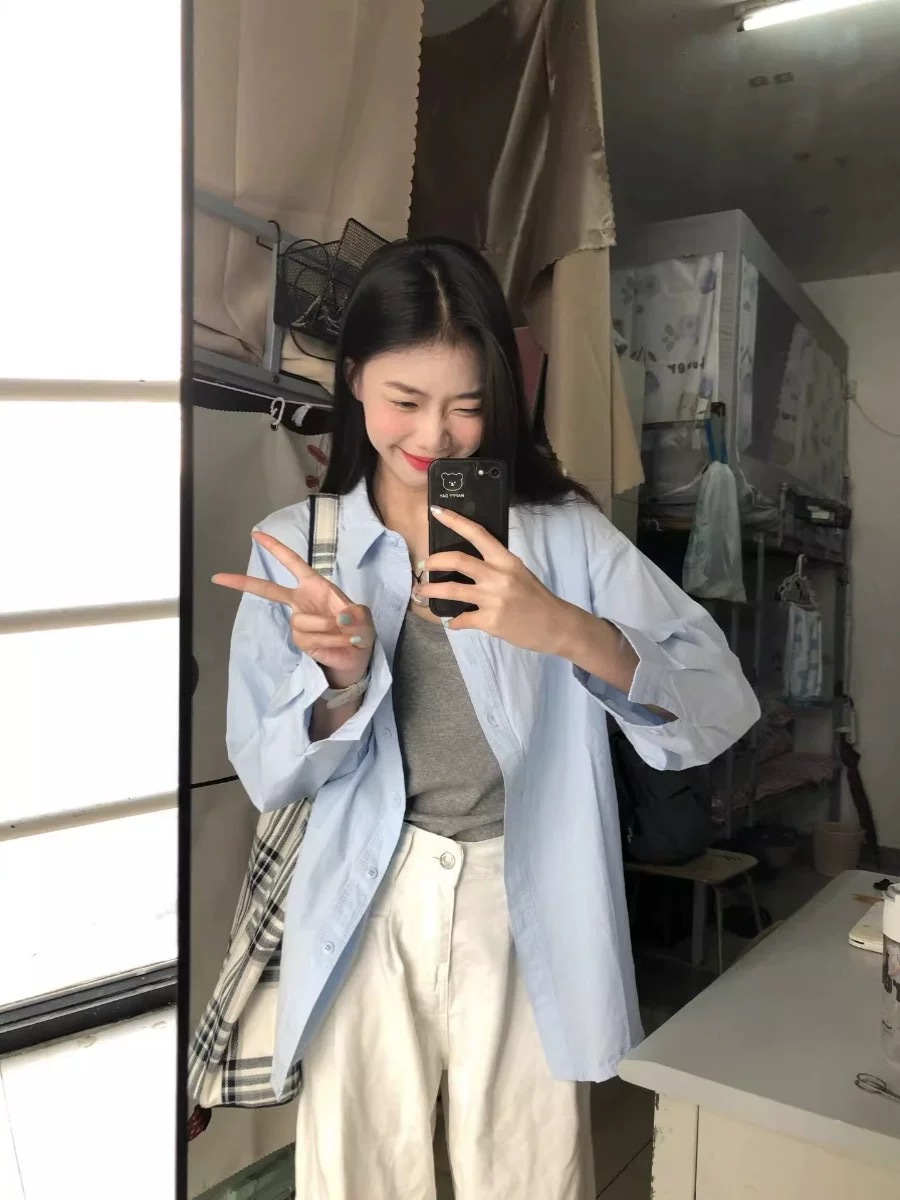 한국식 블루 얇은 선스크린 셔츠 여자 봄 · 여름 느슨한 게으른 스타일 탑 폴로 칼라 올매치 긴소매 셔츠스토어 가기