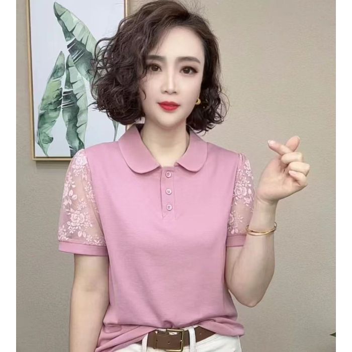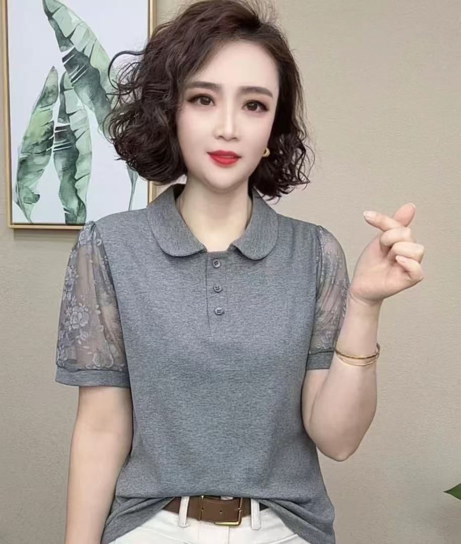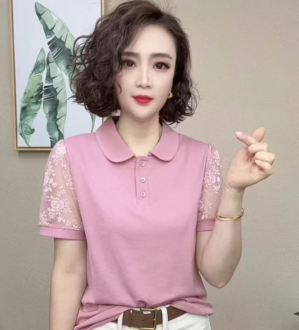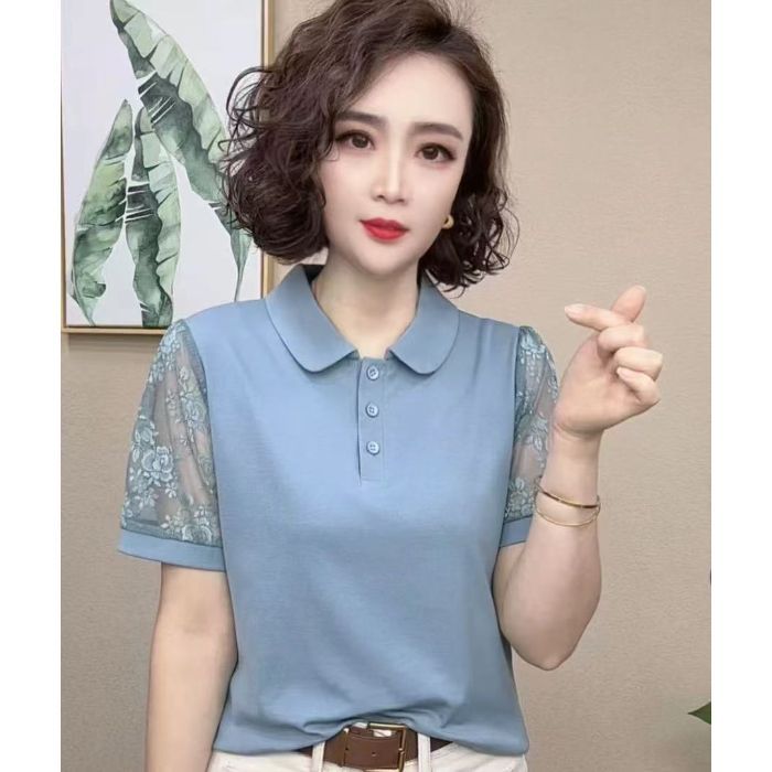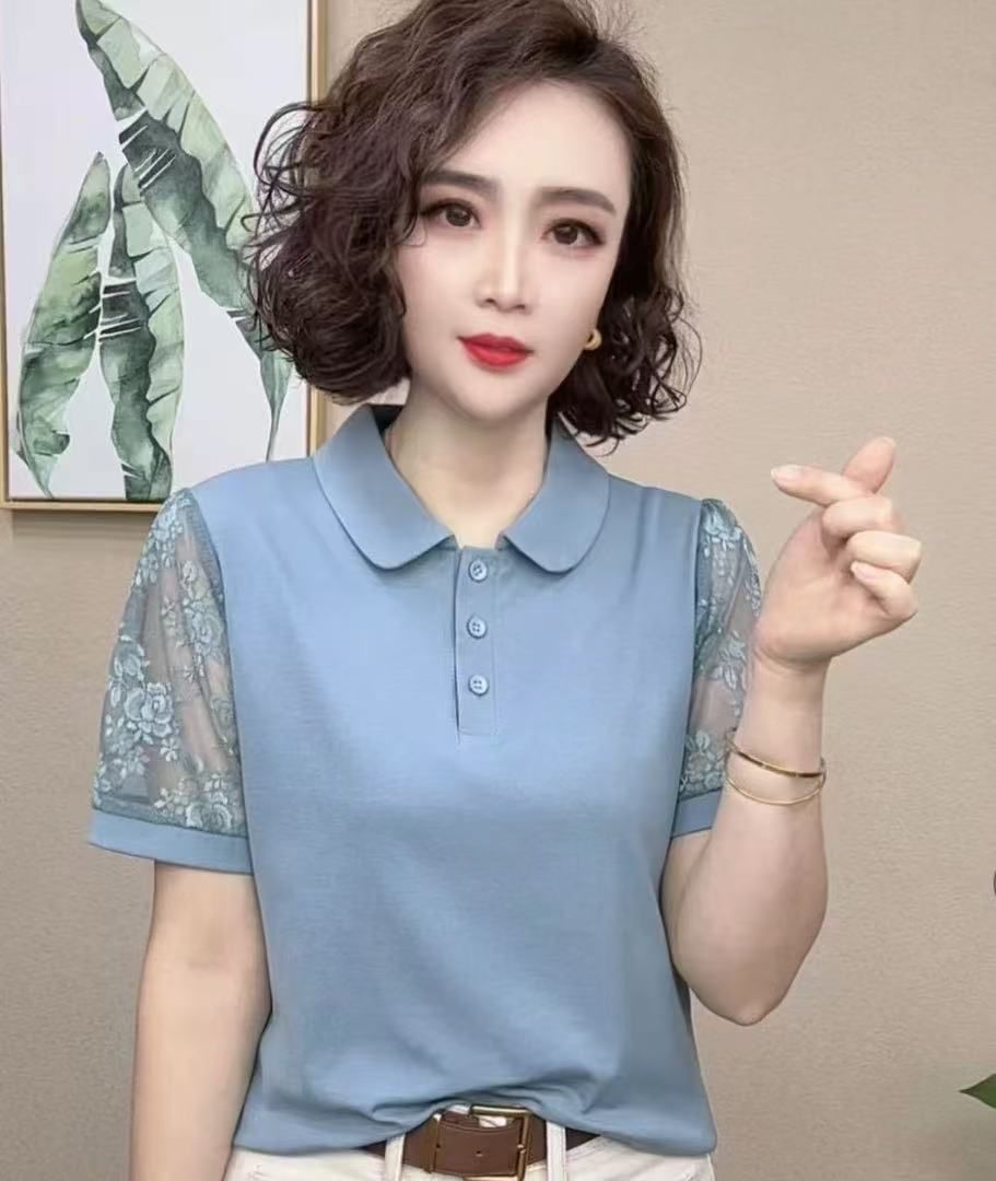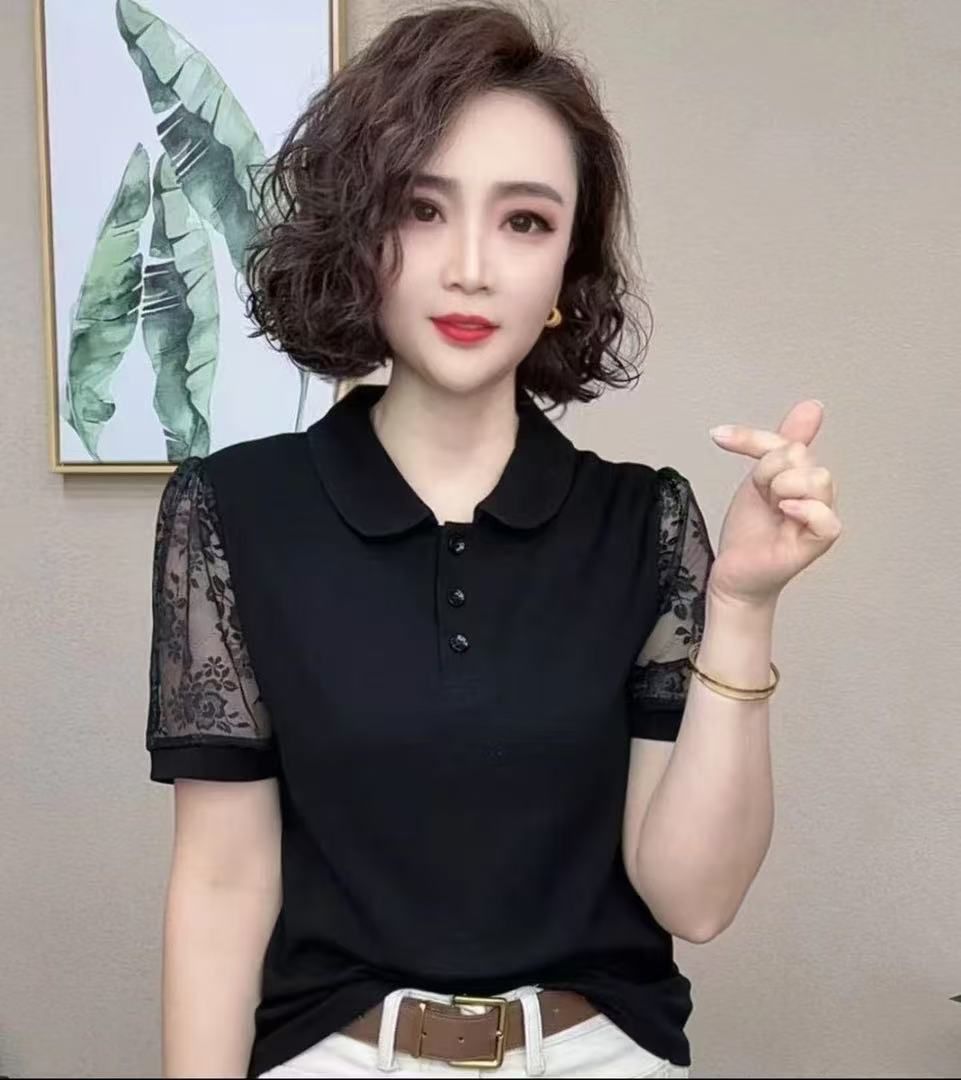 여름 플러스 사이즈 티셔츠 여성 반팔 2025 새로운 느슨한 슬리밍 칼라 프린트 탑 라펠 스웨트 셔츠스토어 가기