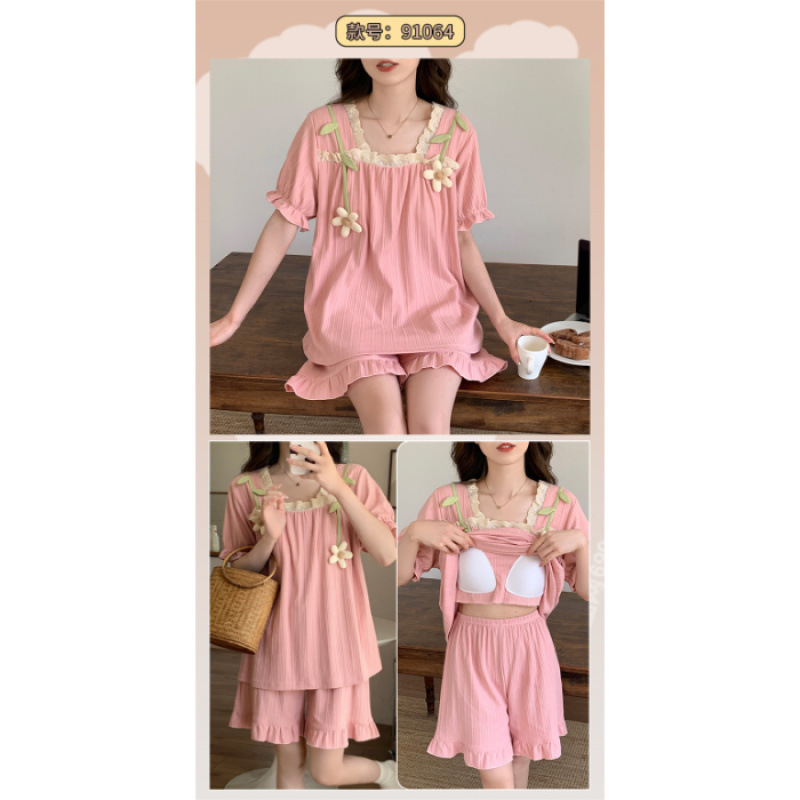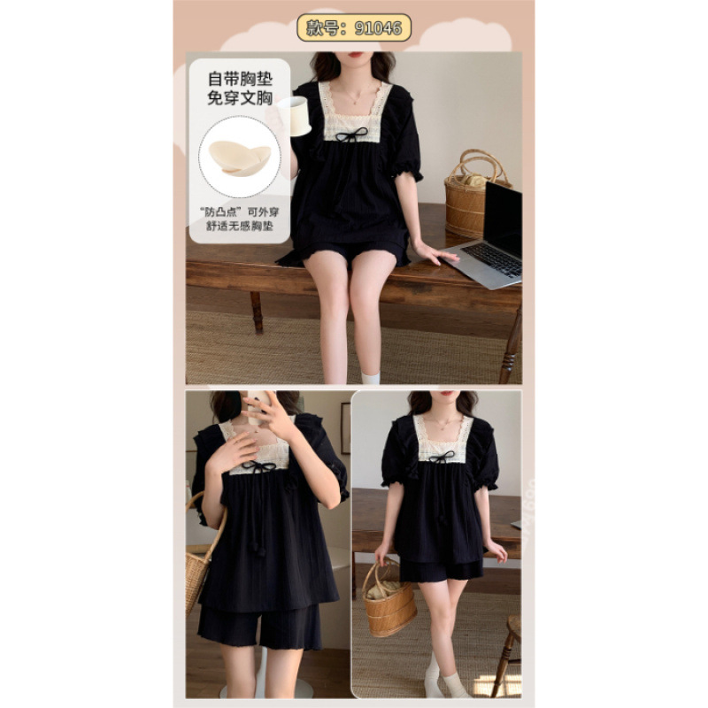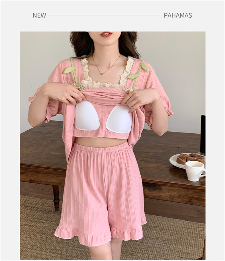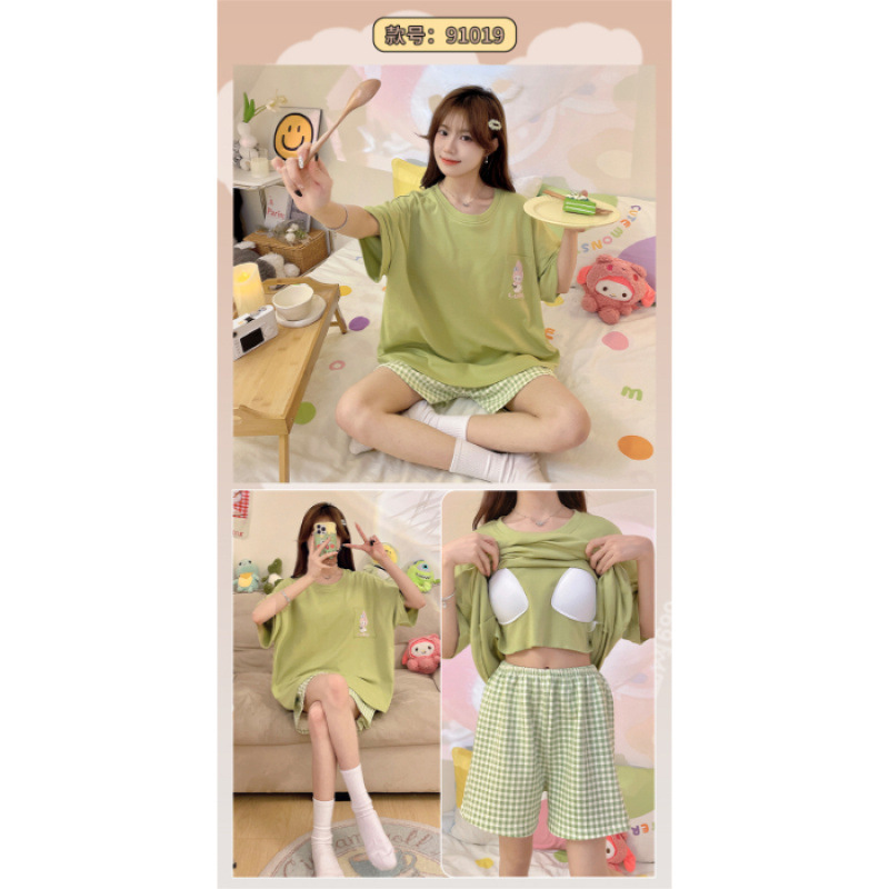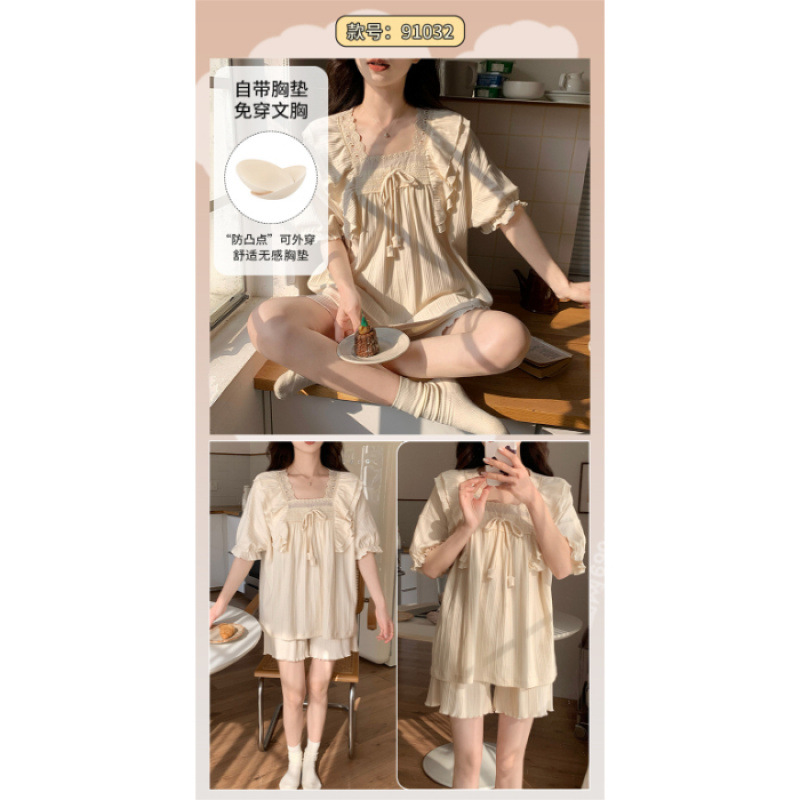 2025년 새로운 귀여운 반팔 여성 잠옷 여름 가슴 패드 일체형 웨어러블 홈웨어 세트