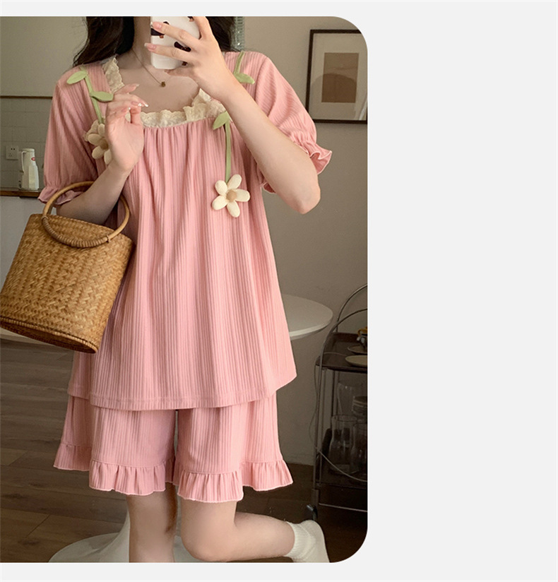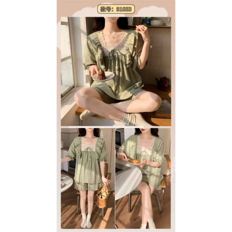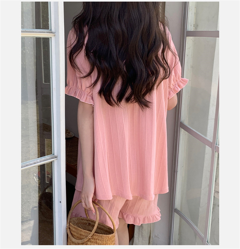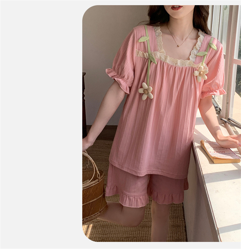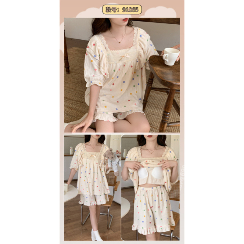 2025년 새로운 귀여운 반팔 여성 잠옷 여름 가슴 패드 일체형 웨어러블 홈웨어 세트